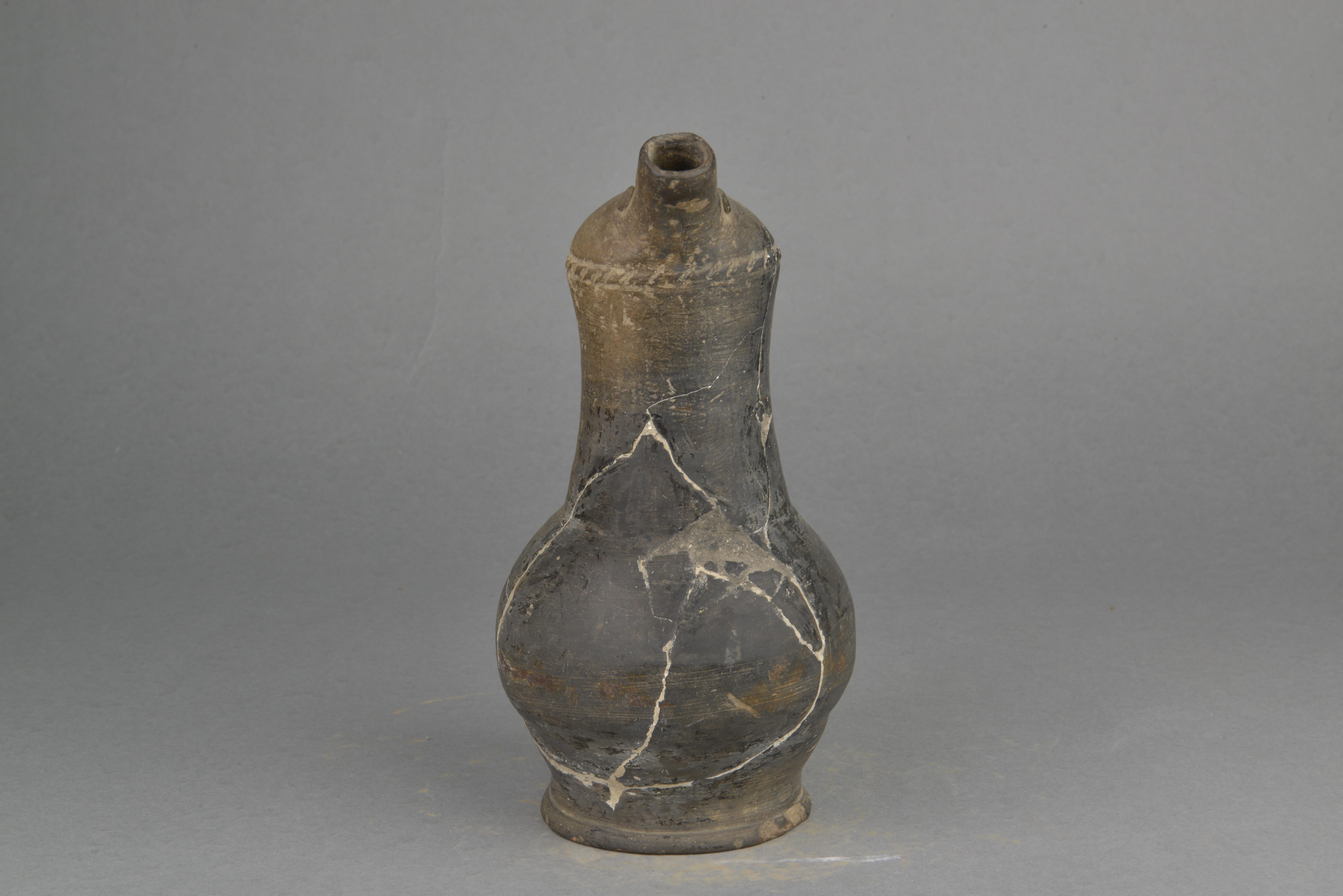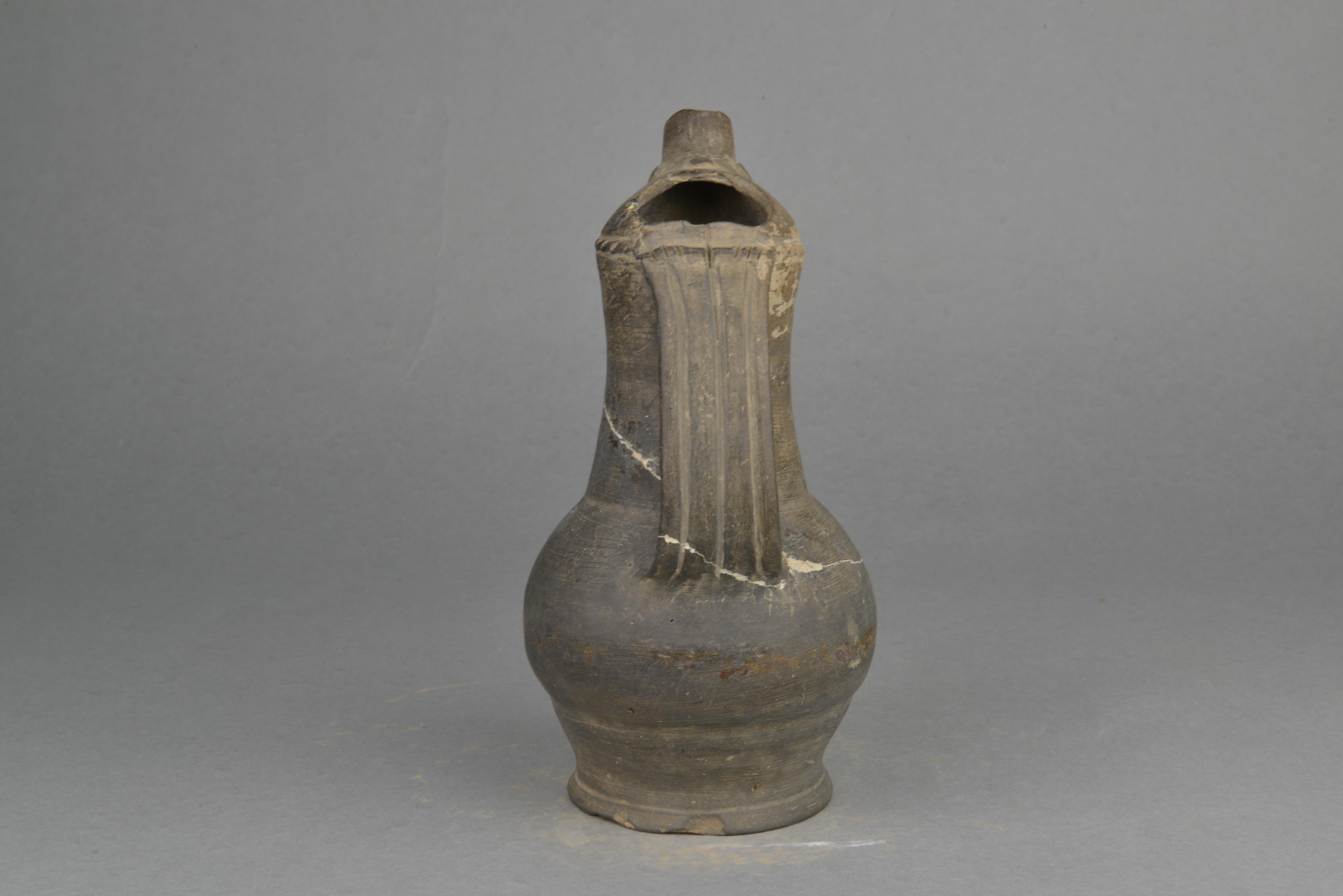 泥质灰陶,顶部作昂扬鸟首状,开椭圆形口,出管状短直流,长颈,圆鼓腹,饼形足,颈部作宽板执,刻长竖条纹,流根处饰三枚乳钉,口下剔刺纹一周。