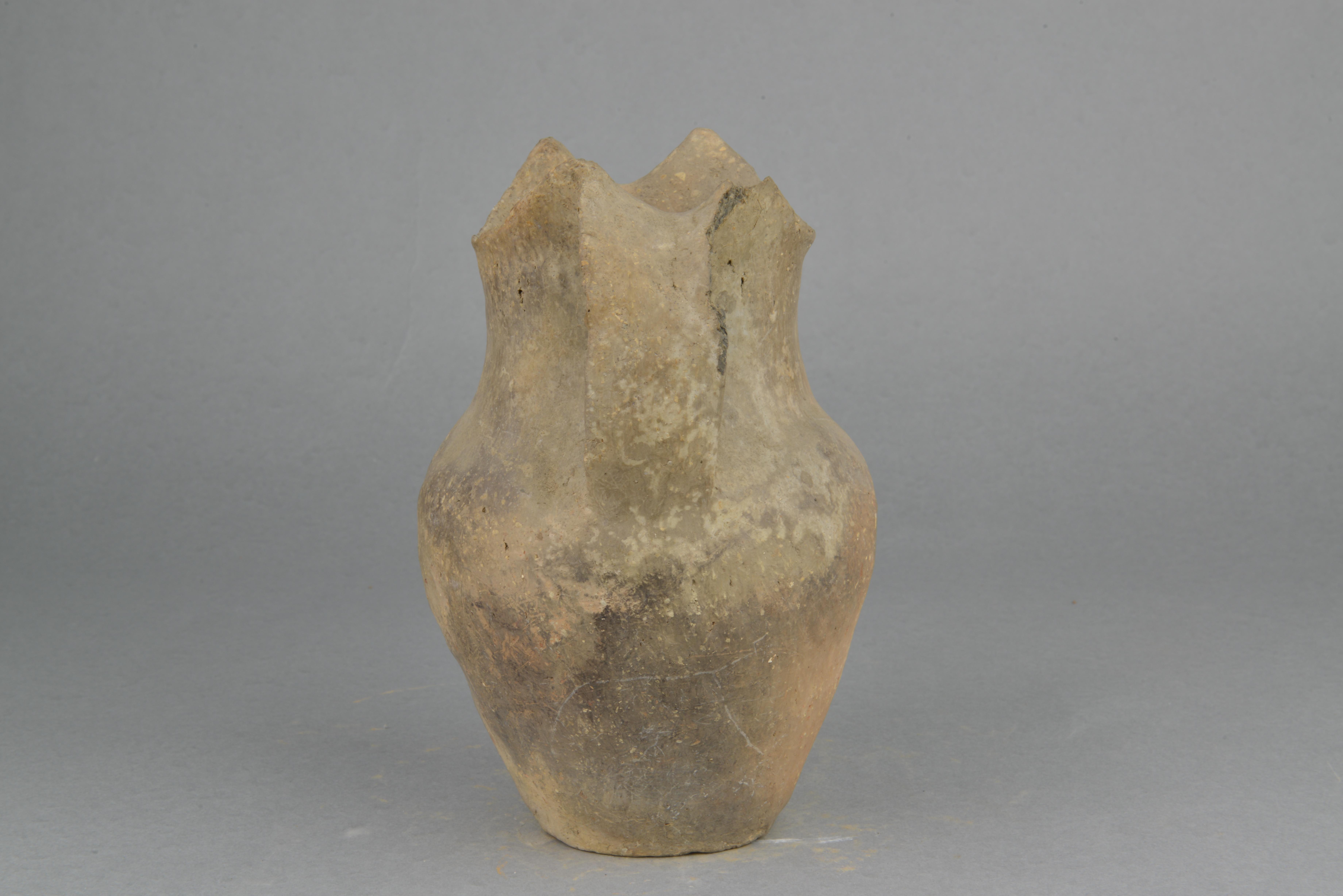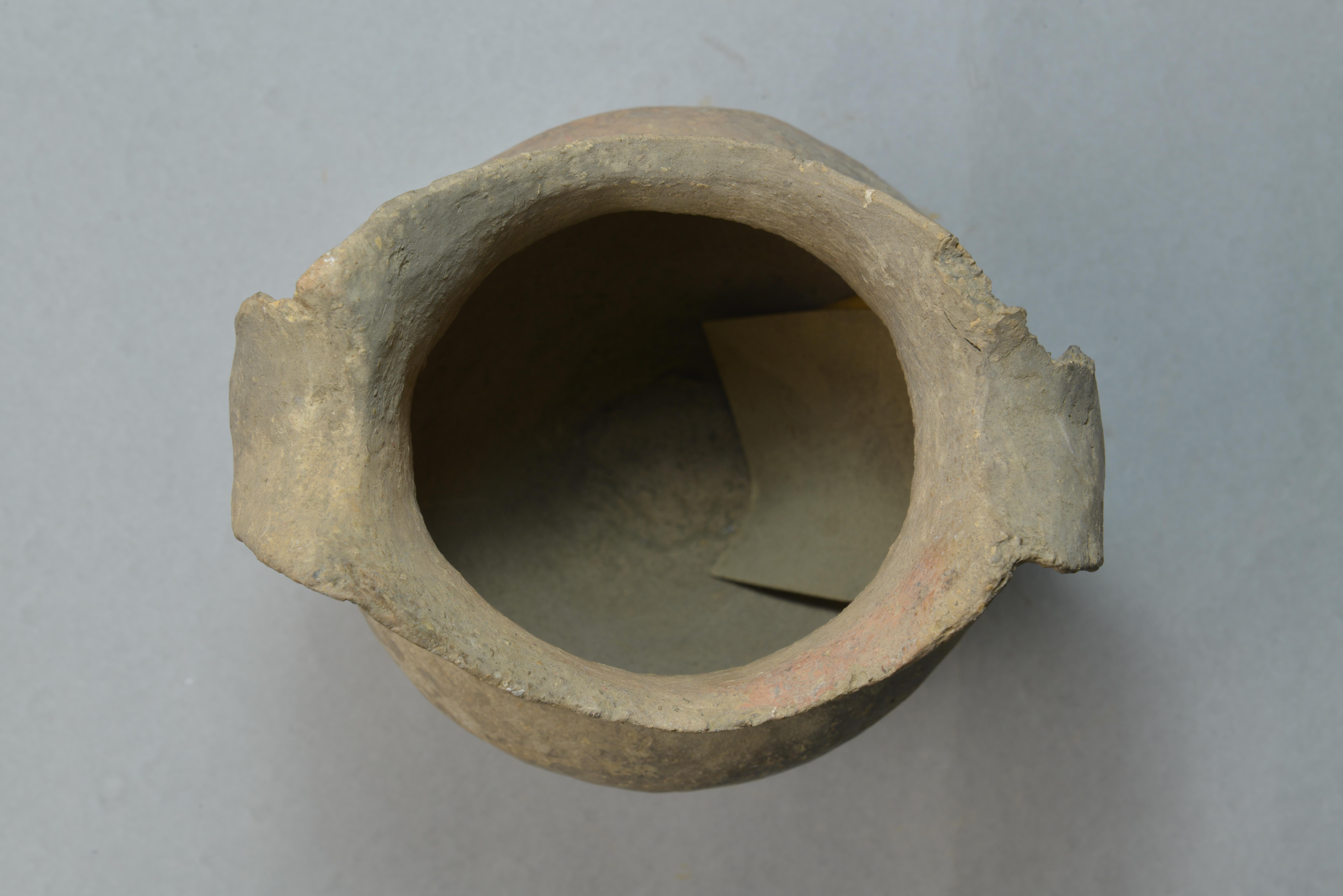 夹砂红陶。马鞍形口,束颈,鼓腹,平底。口腹间作对称双耳。