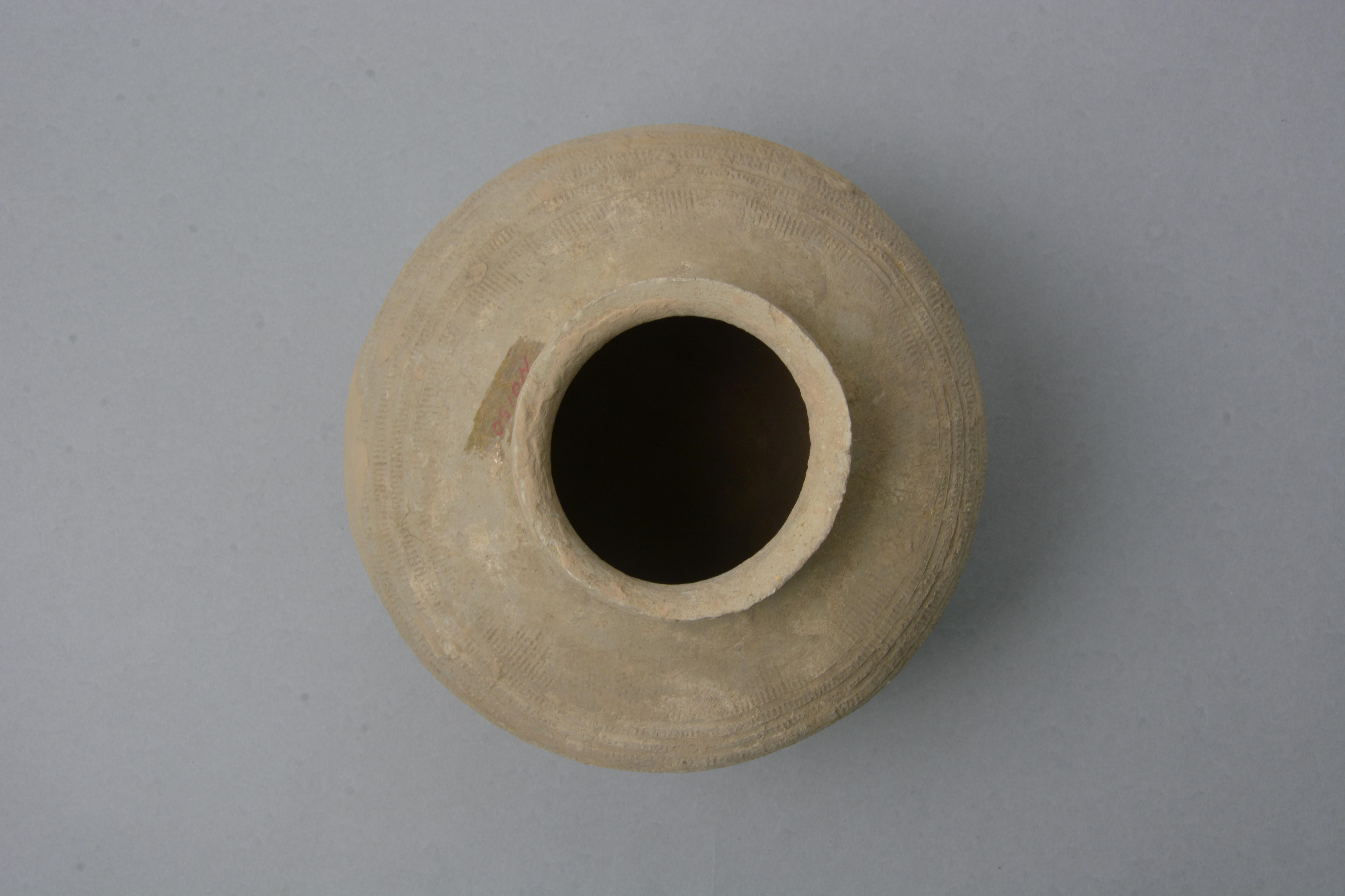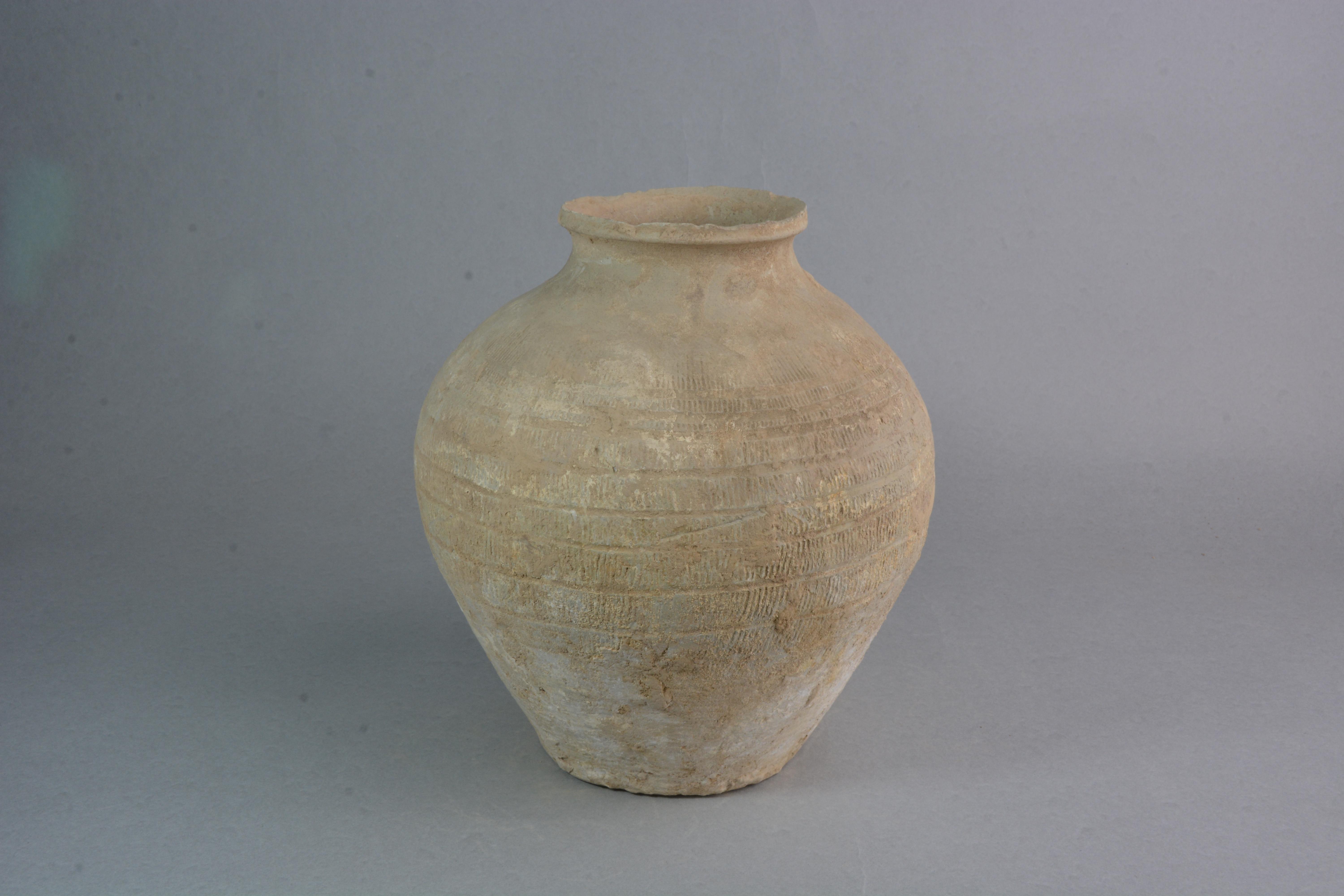 内容:夹砂灰陶,敞口,方唇,短束颈,丰肩,鼓腹下收,平底,肩部至腹上部饰间断绳纹。