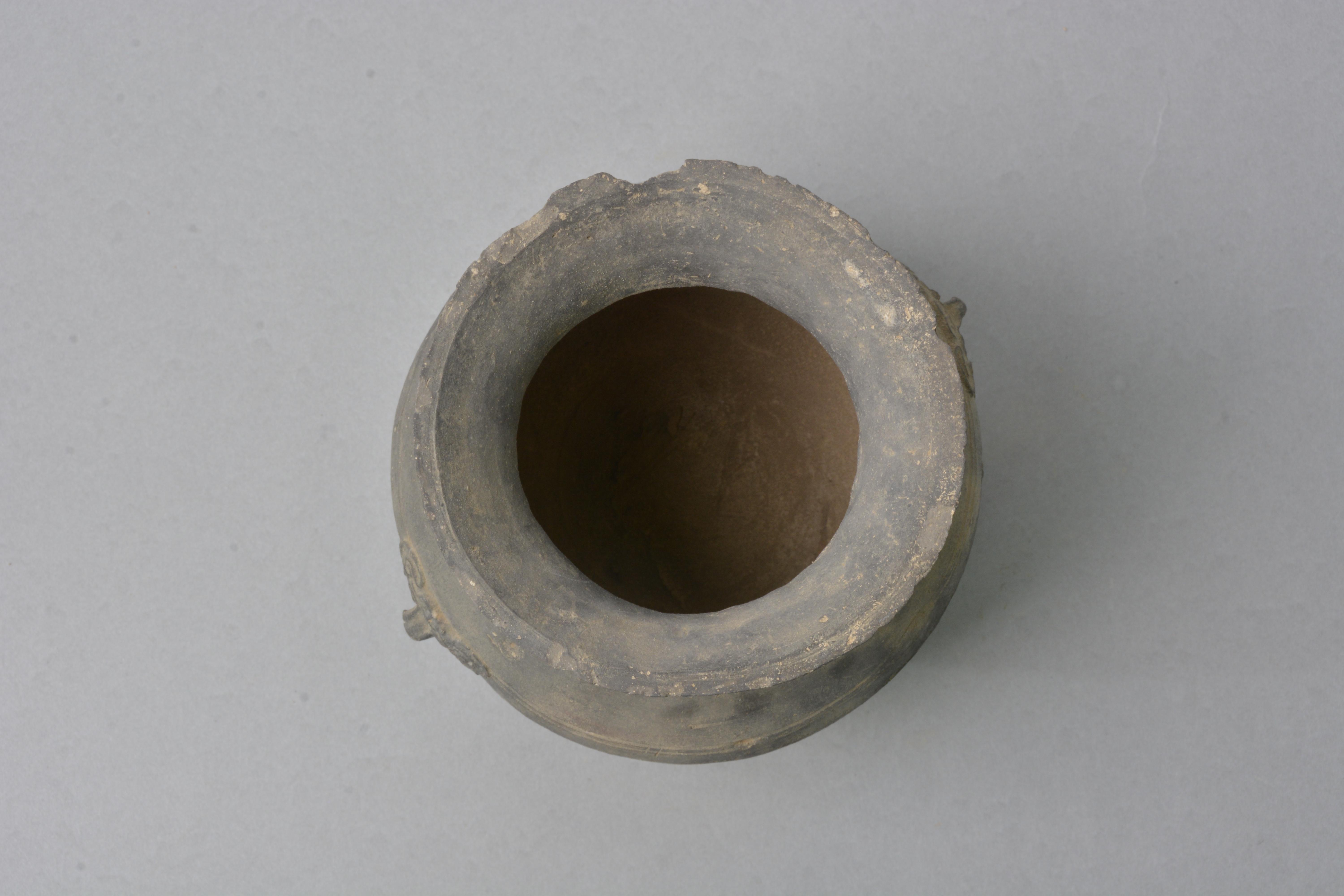 泥质灰陶。敞口,束颈,深弧腹,平底。腹中部浅浮雕饰对称兽面,腹下部饰间断绳纹。