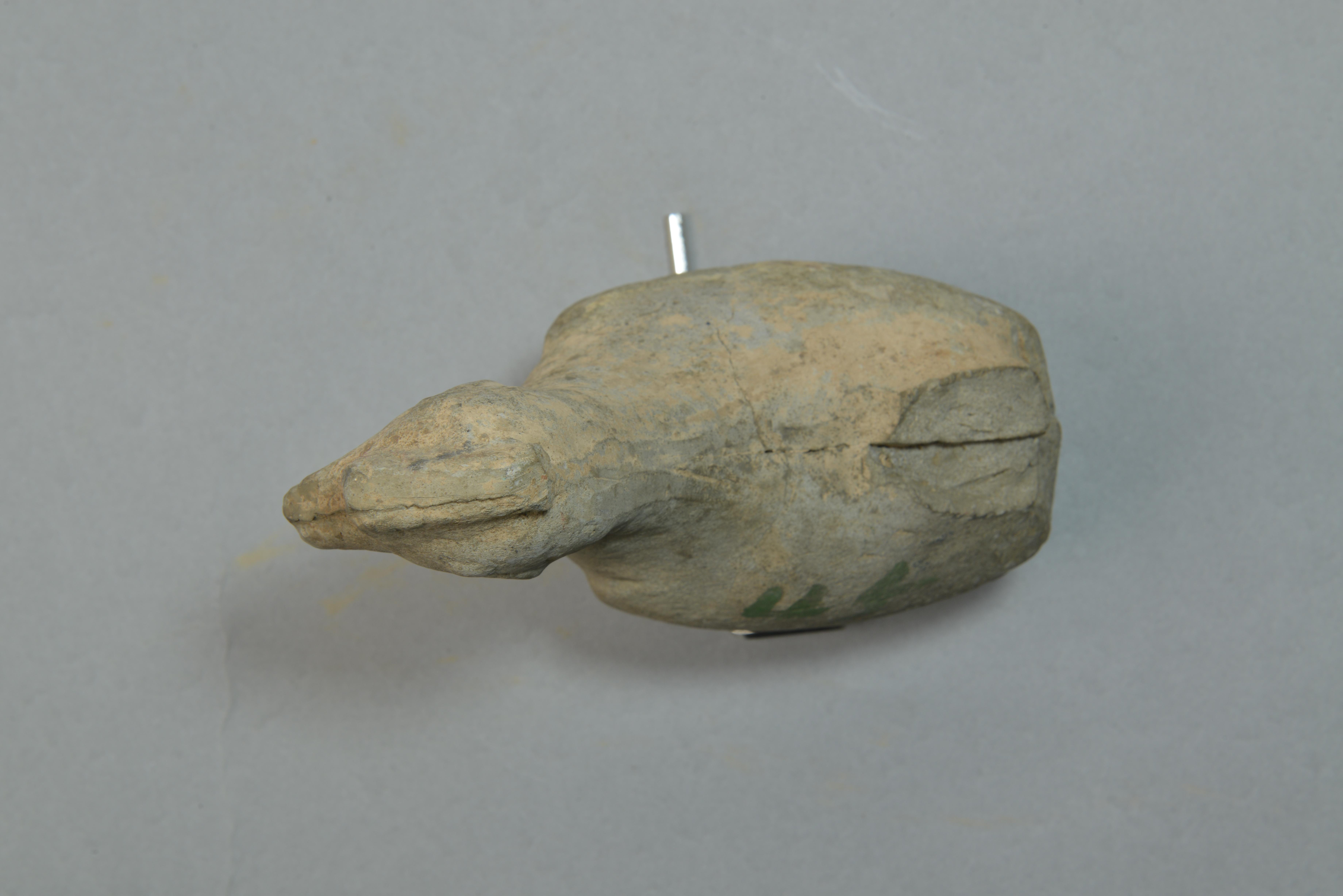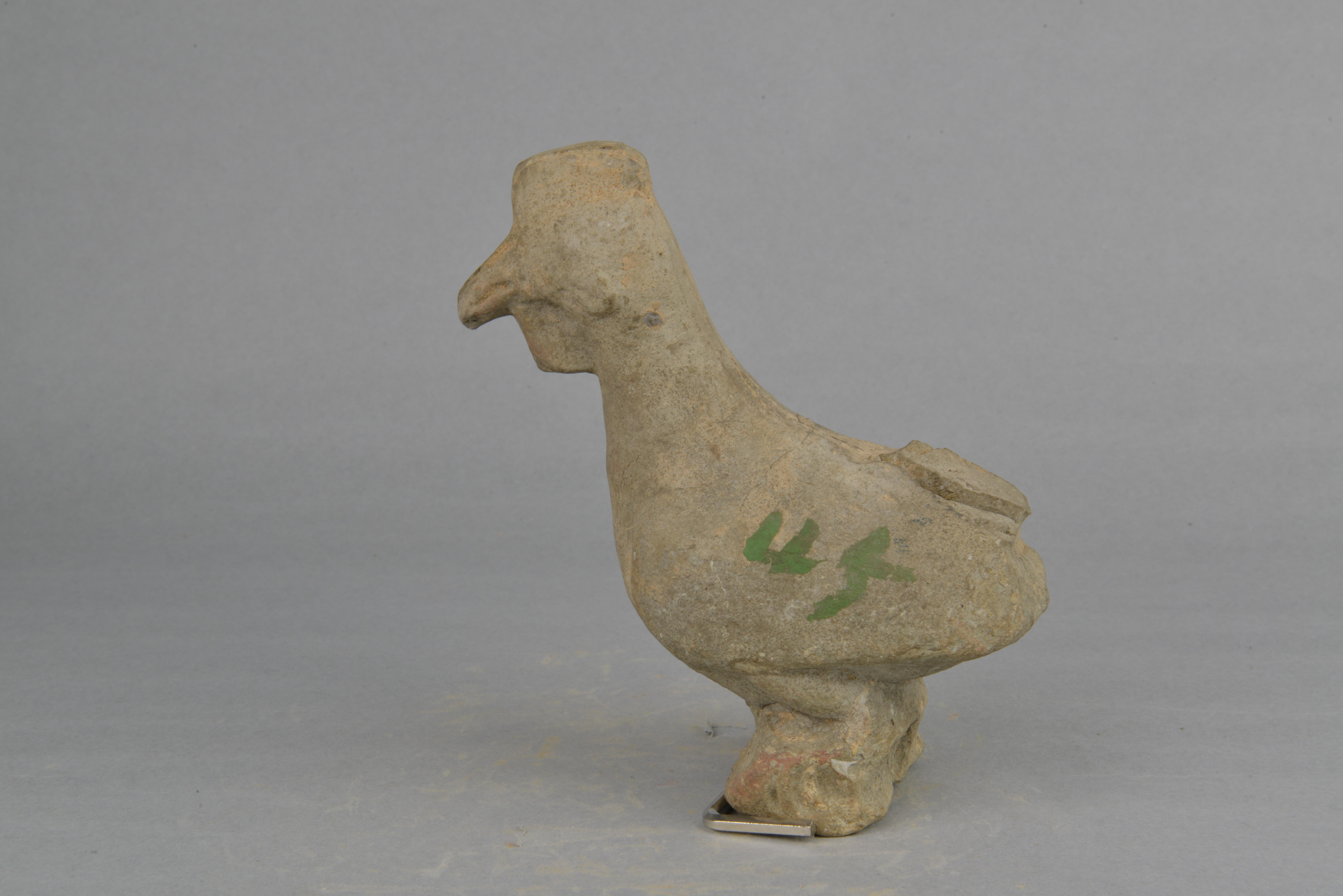 泥质灰陶。站立状,头顶有冠,颈下有重冠,双翅刻划不明显,双爪合并作长方形。