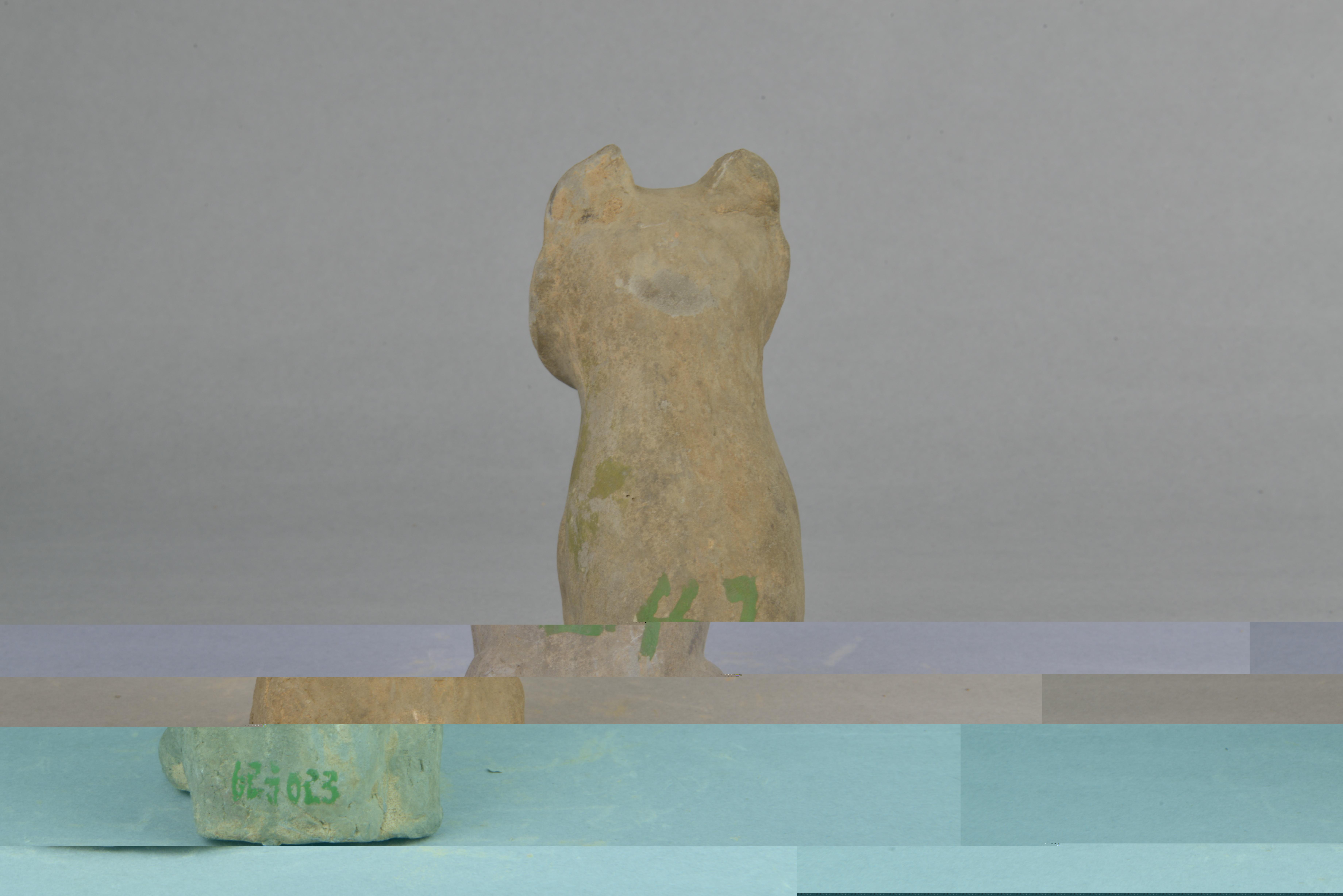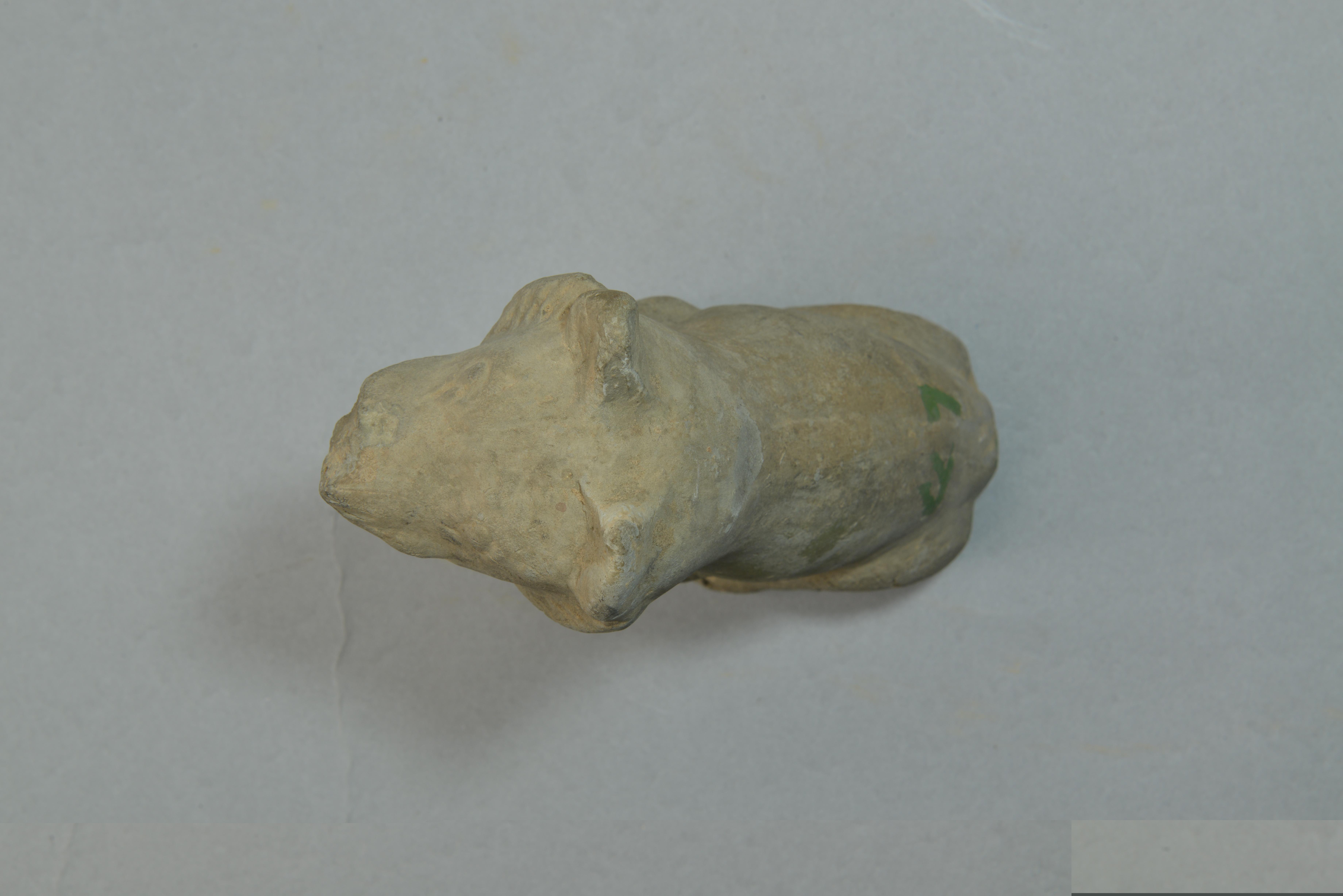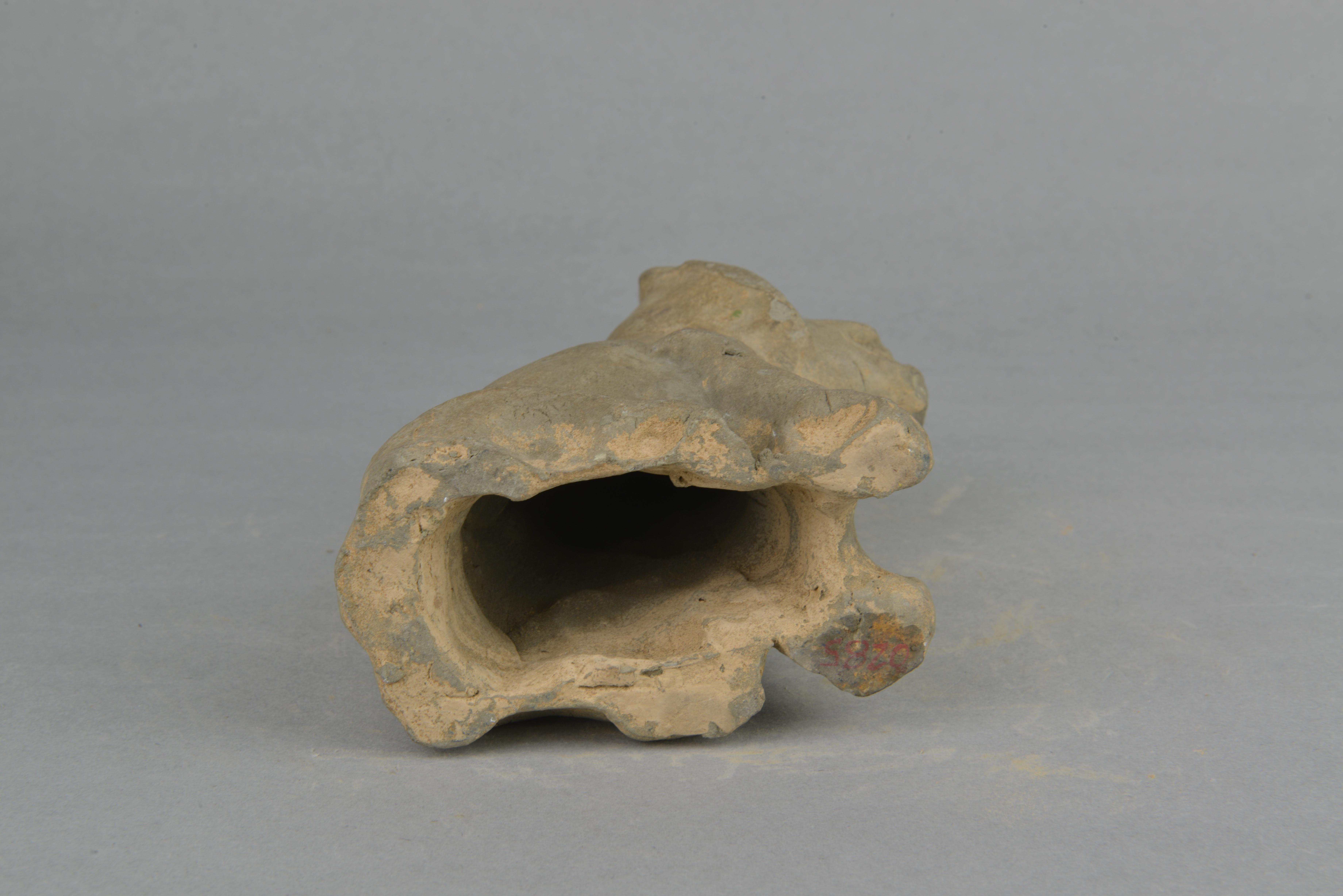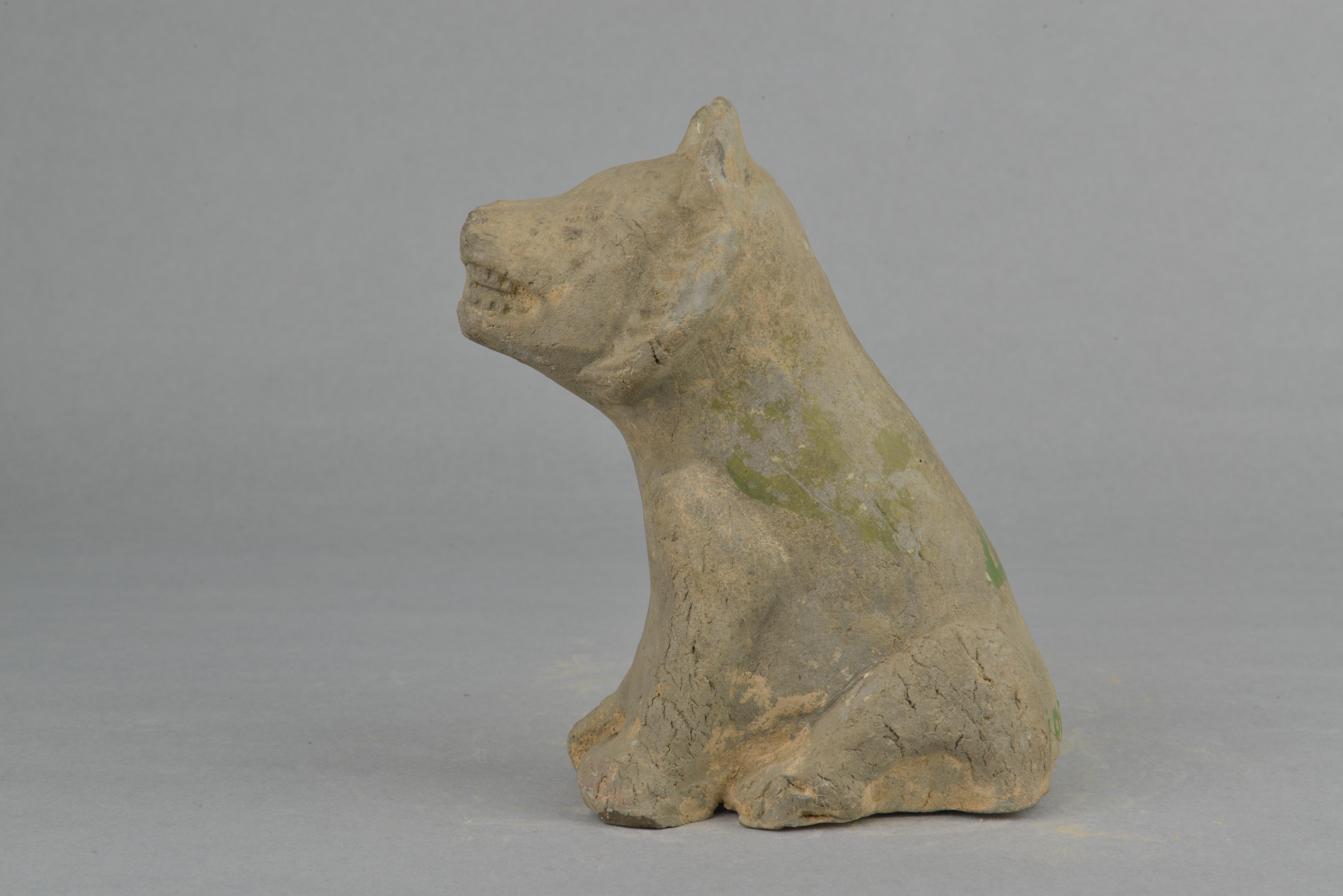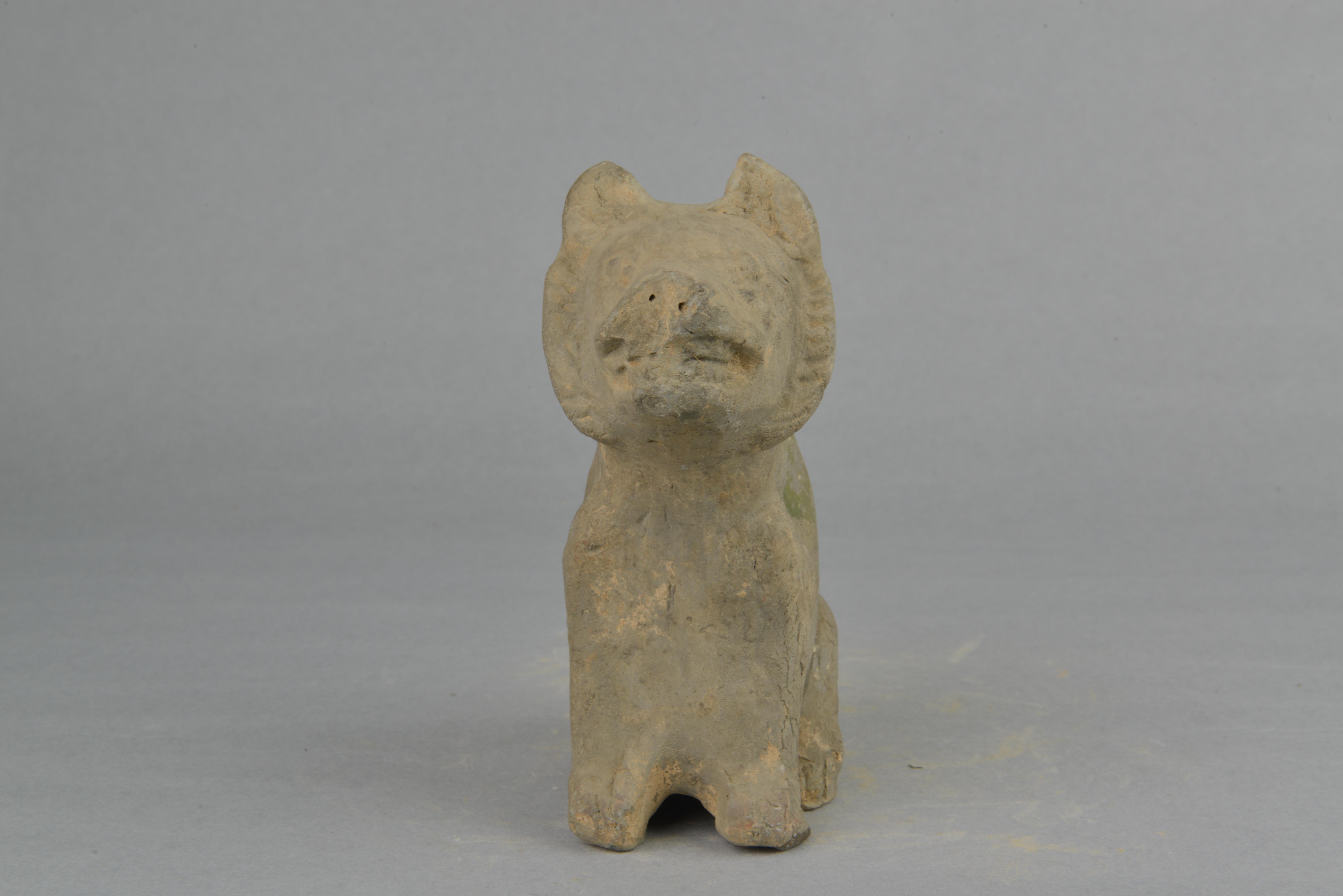 泥质灰陶。狗呈坐姿,昂首,立耳,两眼圆睁,龇牙咧嘴作狂吠状。形态生动逼真。
