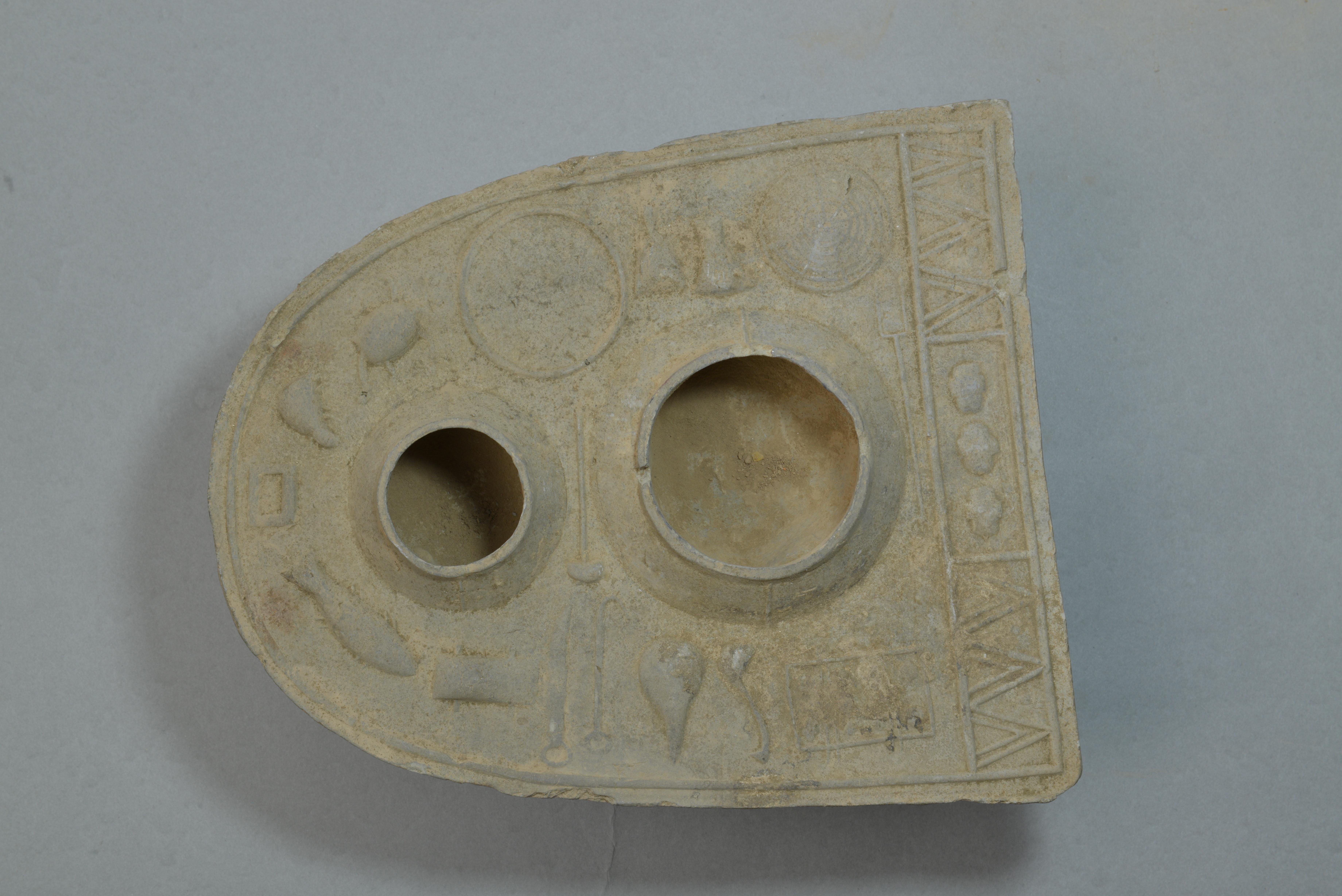 泥质灰陶。灶面前方后圆,上有两个连釜火口,上置一甑,火口后模印一方形烟囱。灶面上模印火钩,勺,瓢,铲,刀,鱼等物,前部模印双曲折纹,并有遮烟檐。前壁有一方形通地火门,火门一侧为一跪形人,另一侧为一陶罐,外围饰曲折纹及菱形纹。