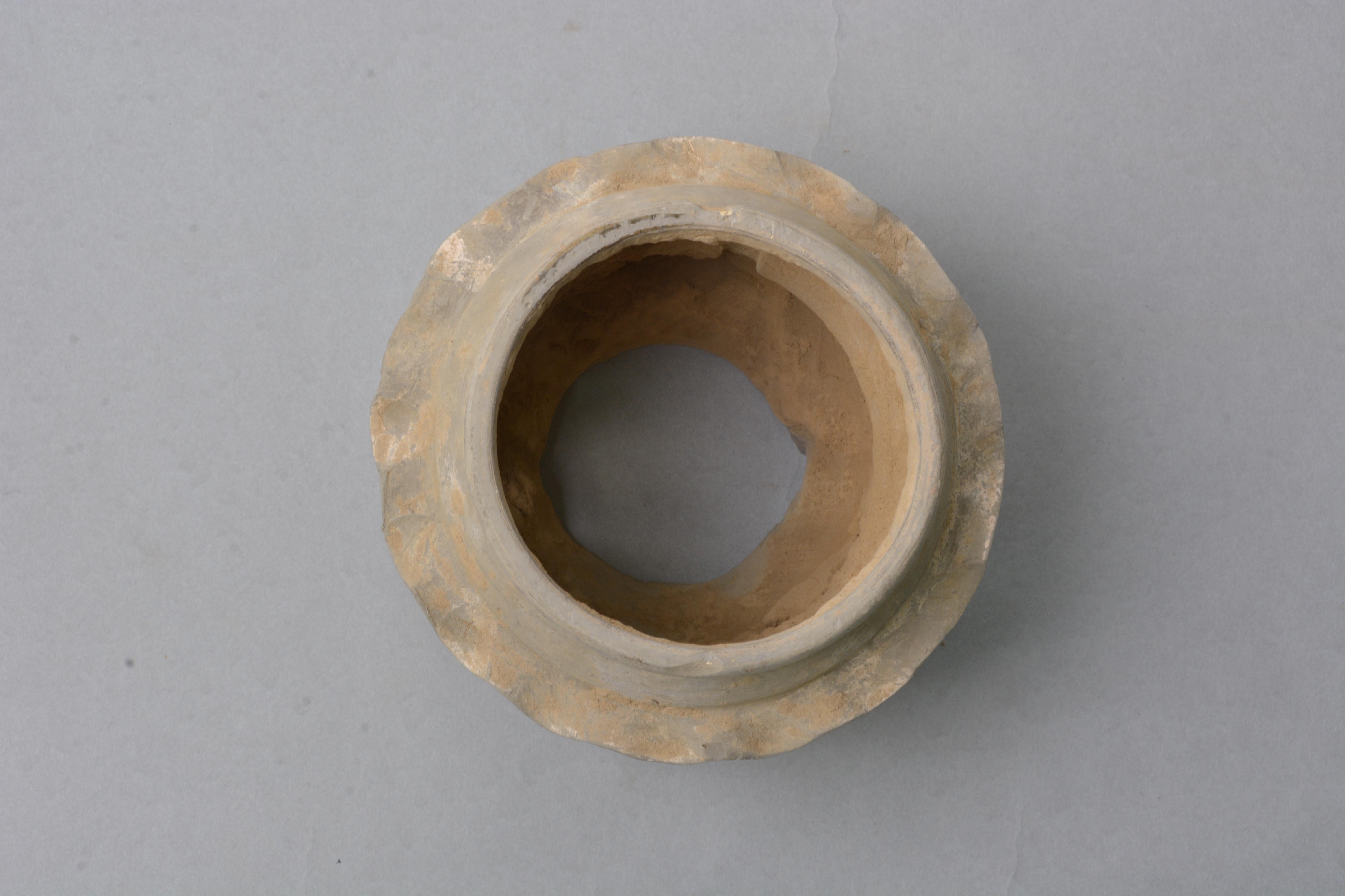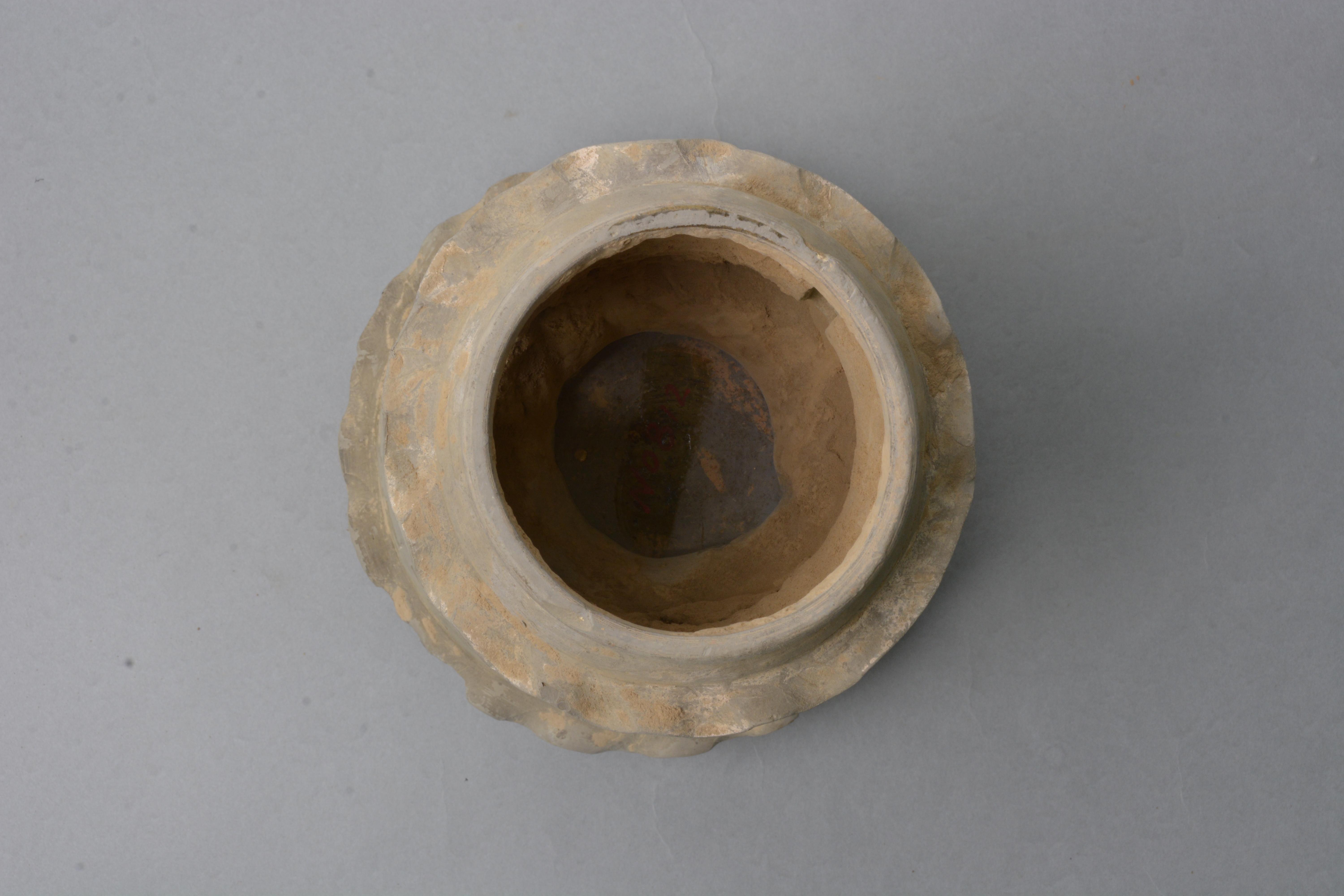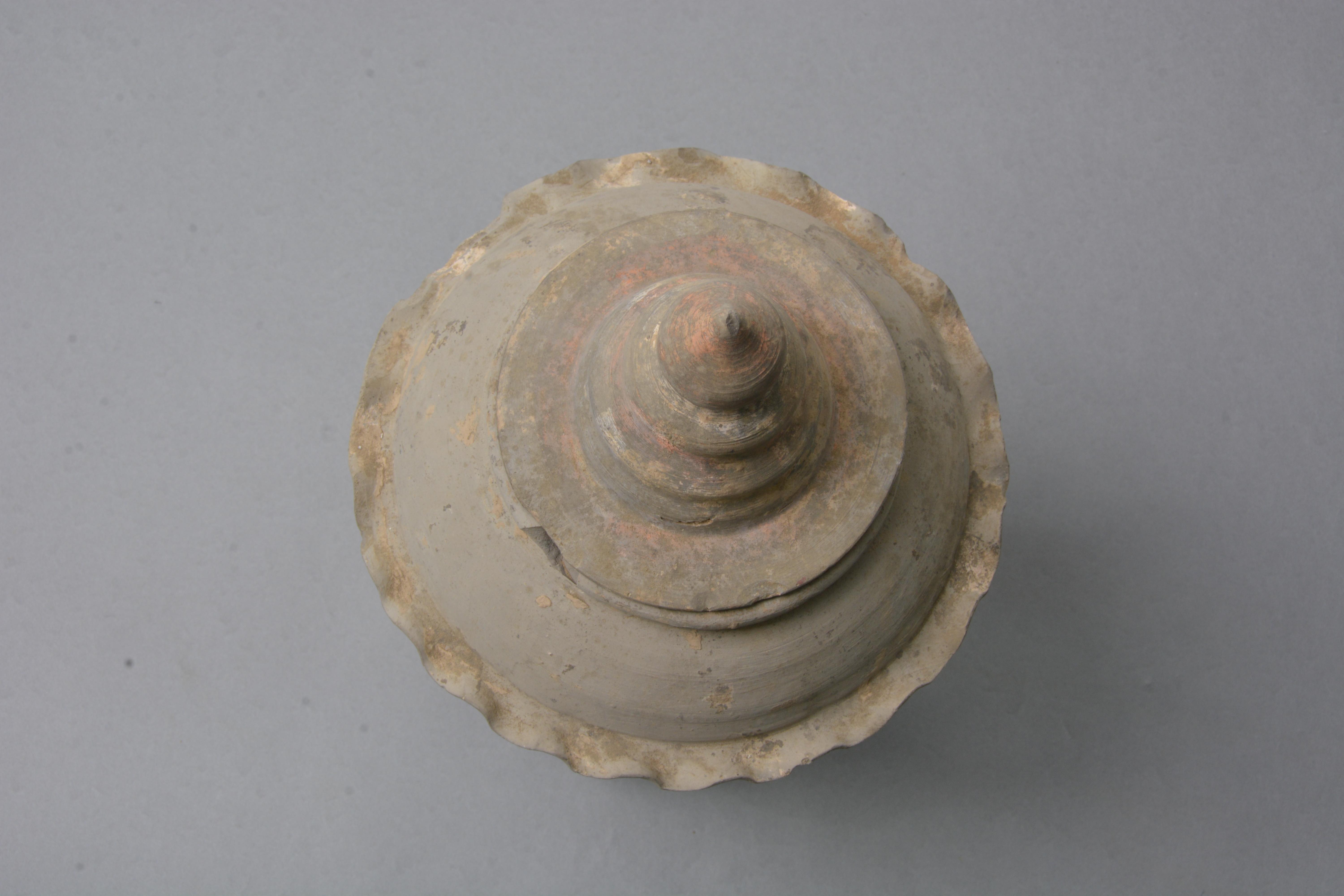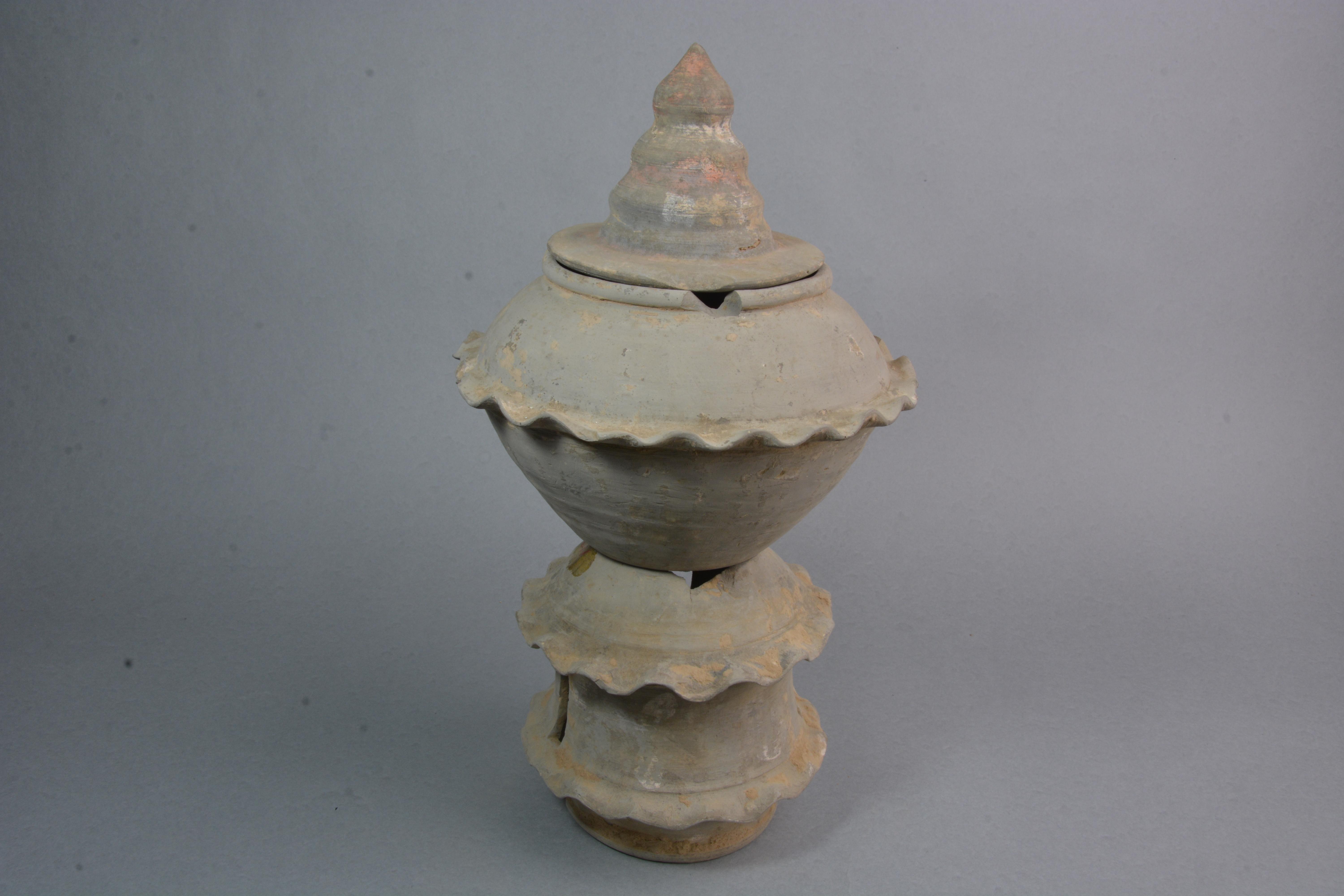 泥质灰陶,存盖、罐、座三件,盖为三级文物塔形,出宽平沿,子母口,罐作圆唇口,鼓腹,平底,腹部加一道堆塑花边,座加两道堆塑花边,呈两层檐塔式,中空,中部镂三组长条孔,有白陶衣和红彩饰绘痕迹。