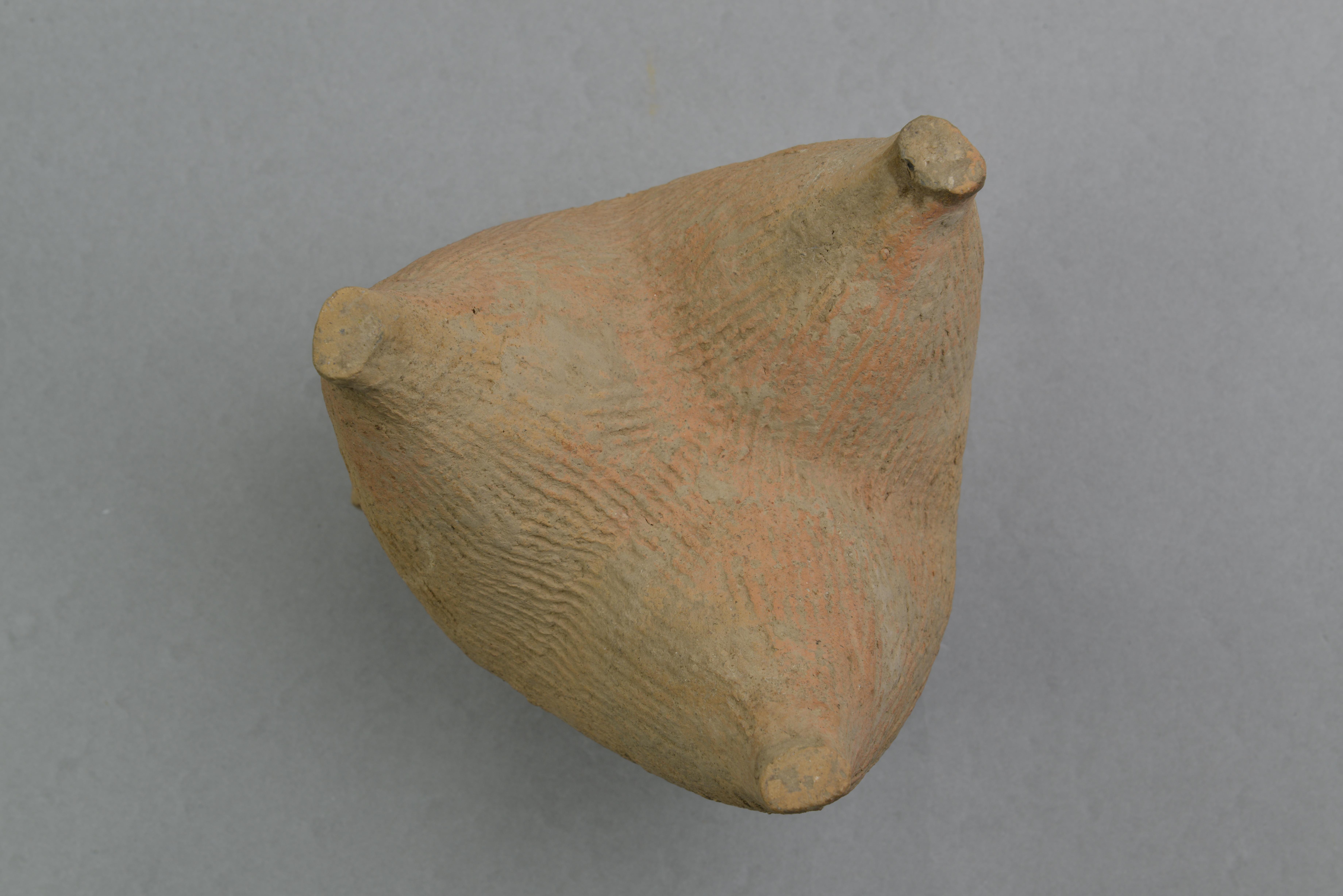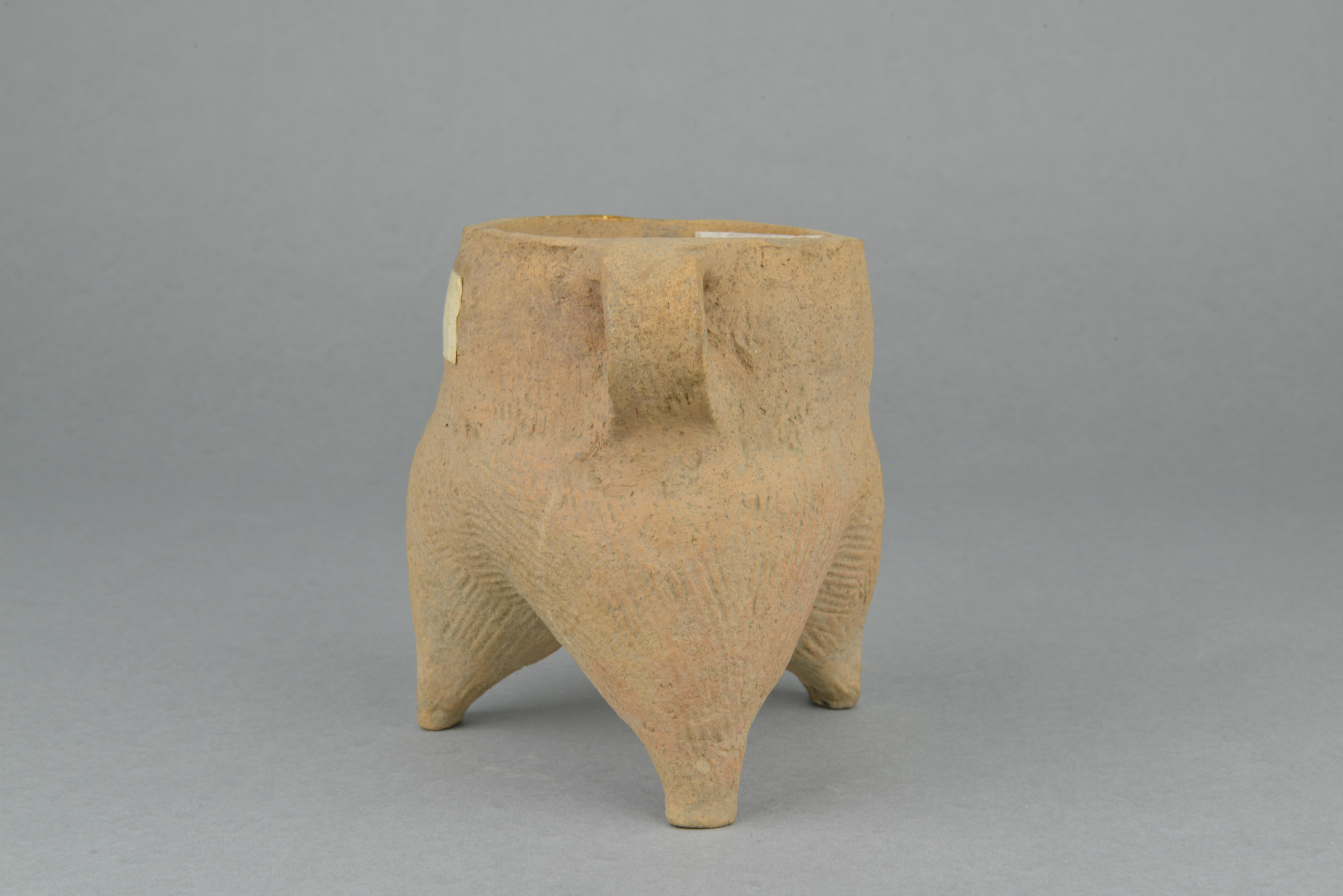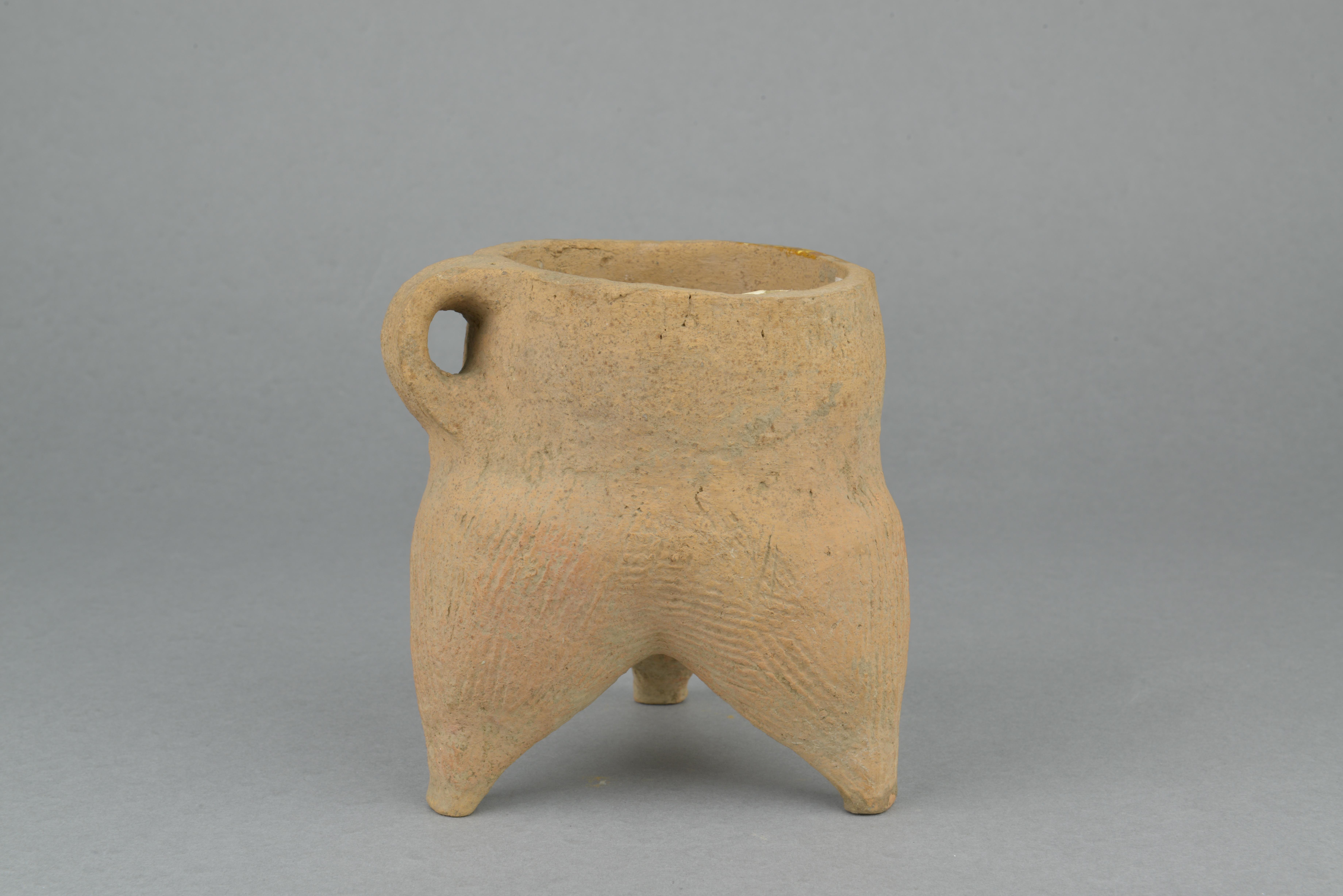 夹砂红陶,直口,方唇,直颈,三袋足,分裆。颈部作一宽带耳,颈以下饰绳纹。