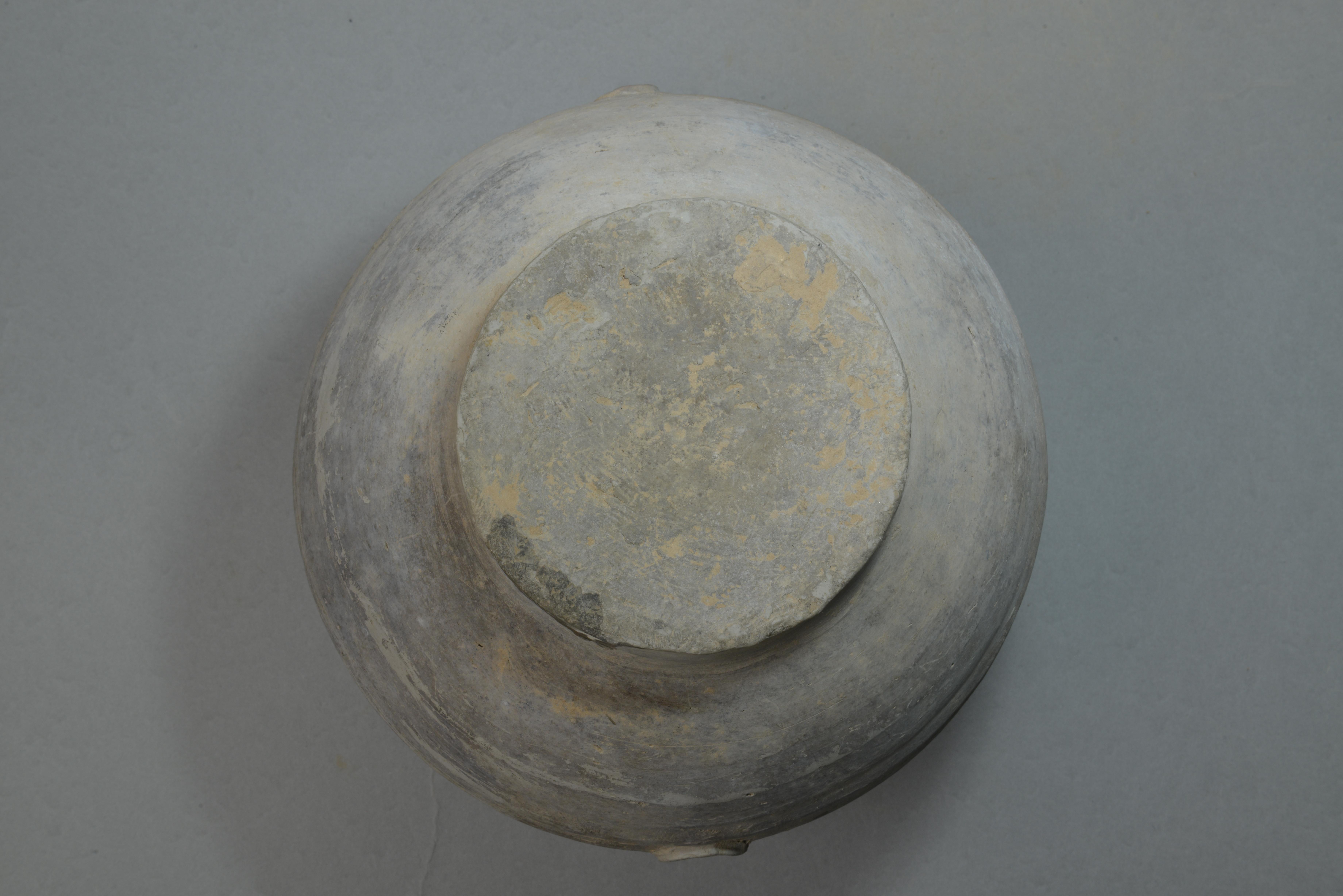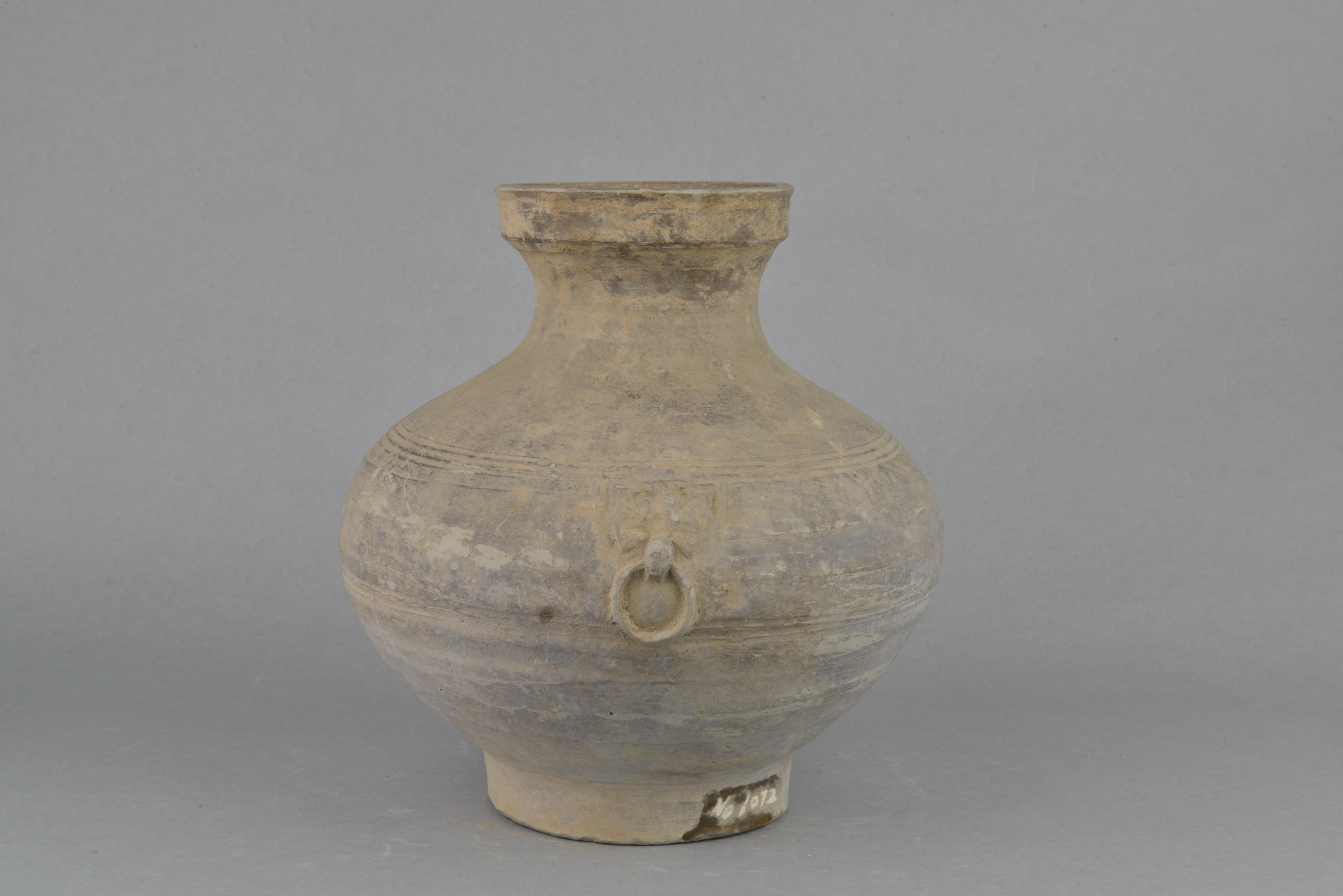 泥质灰陶。敞口,方唇,束颈,鼓腹,平底,腹上部饰三周凹弦纹,腹中部有对称的铺首衔环。