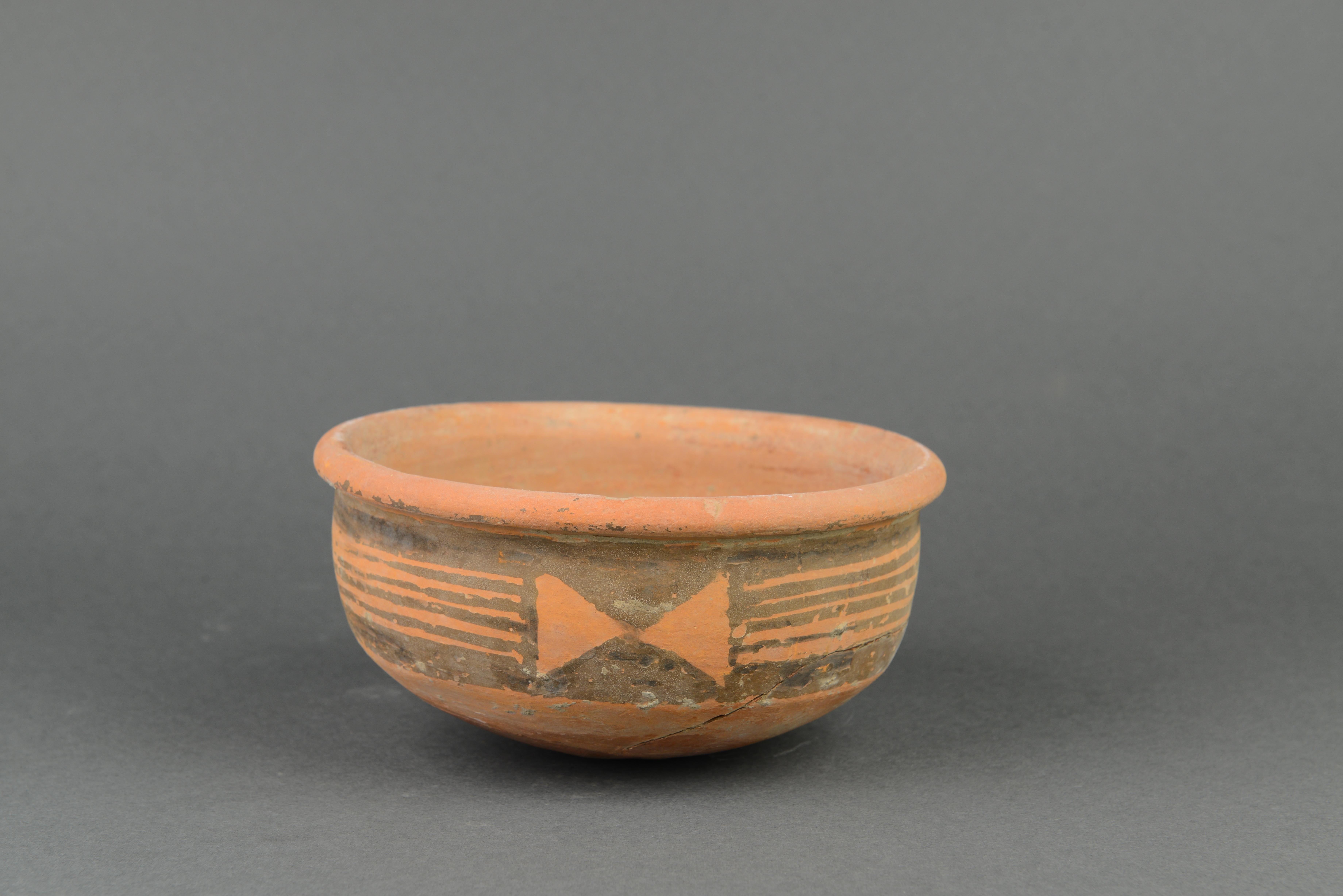 细泥红陶。直口,圆唇,浅腹,圜底,腹部黑彩绘三角形与平行线组成的几何纹。
