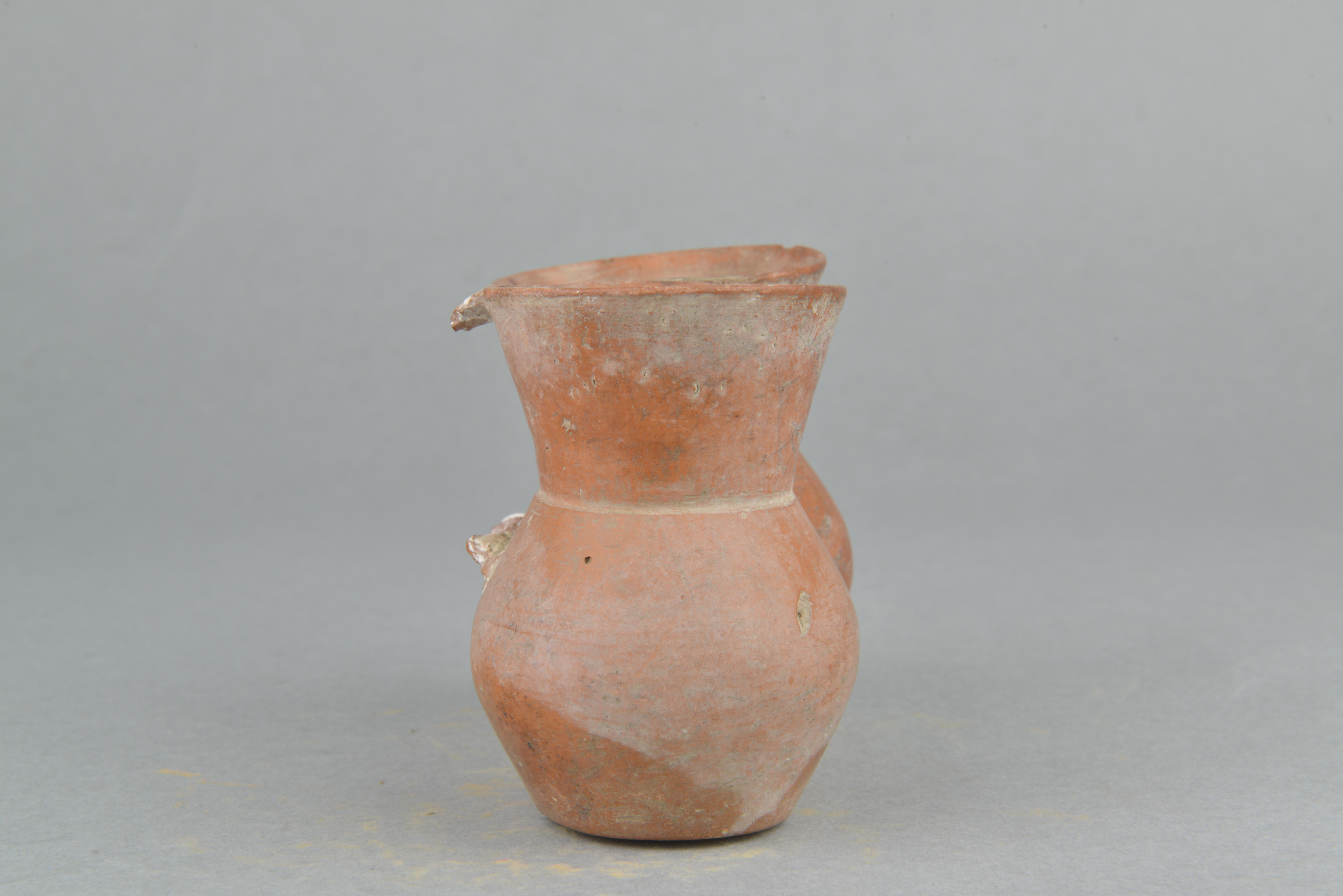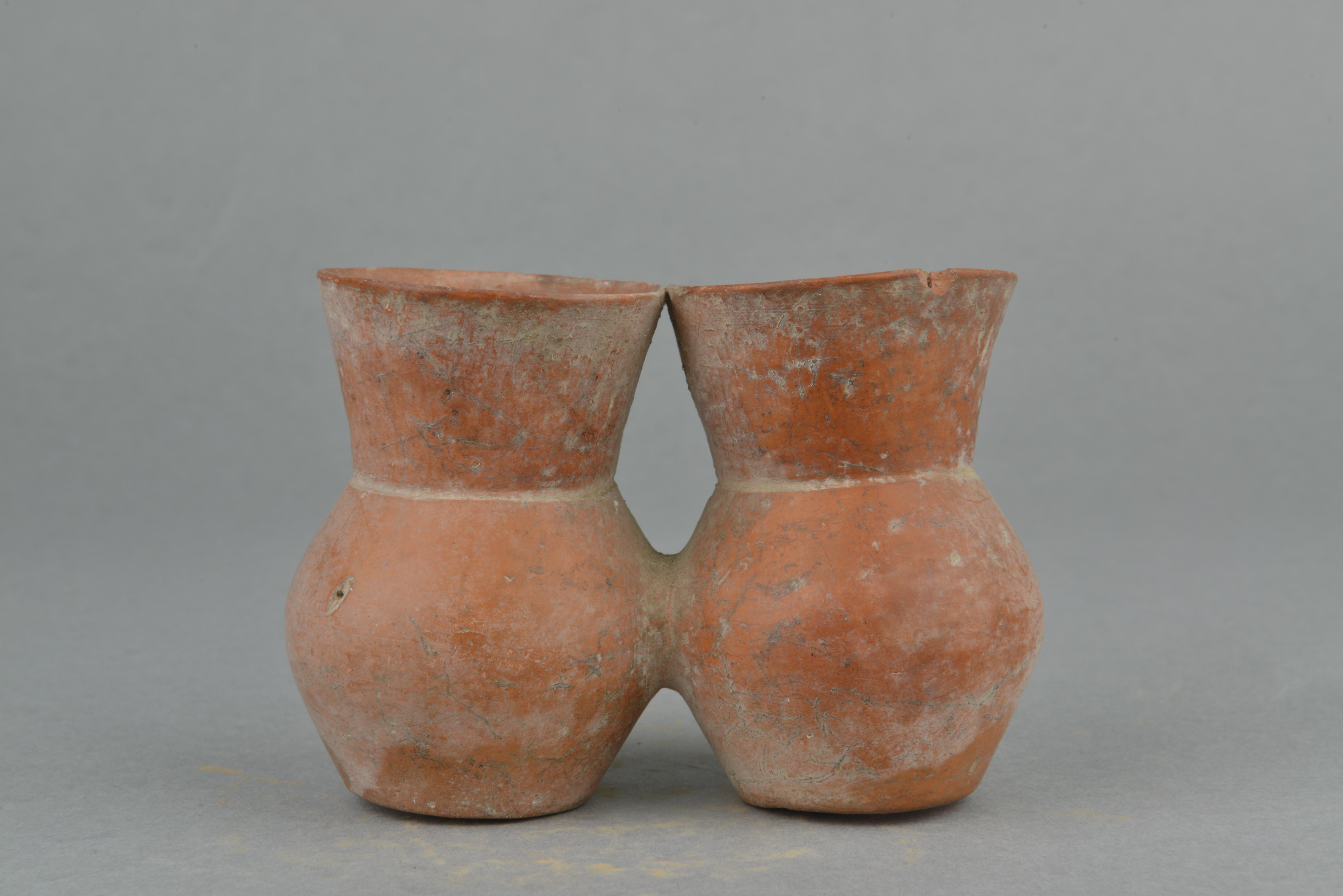 细泥红陶,器型为两单耳罐并排相连,罐为敞口,高领,鼓腹,平底。口至腹上部作一单耳。