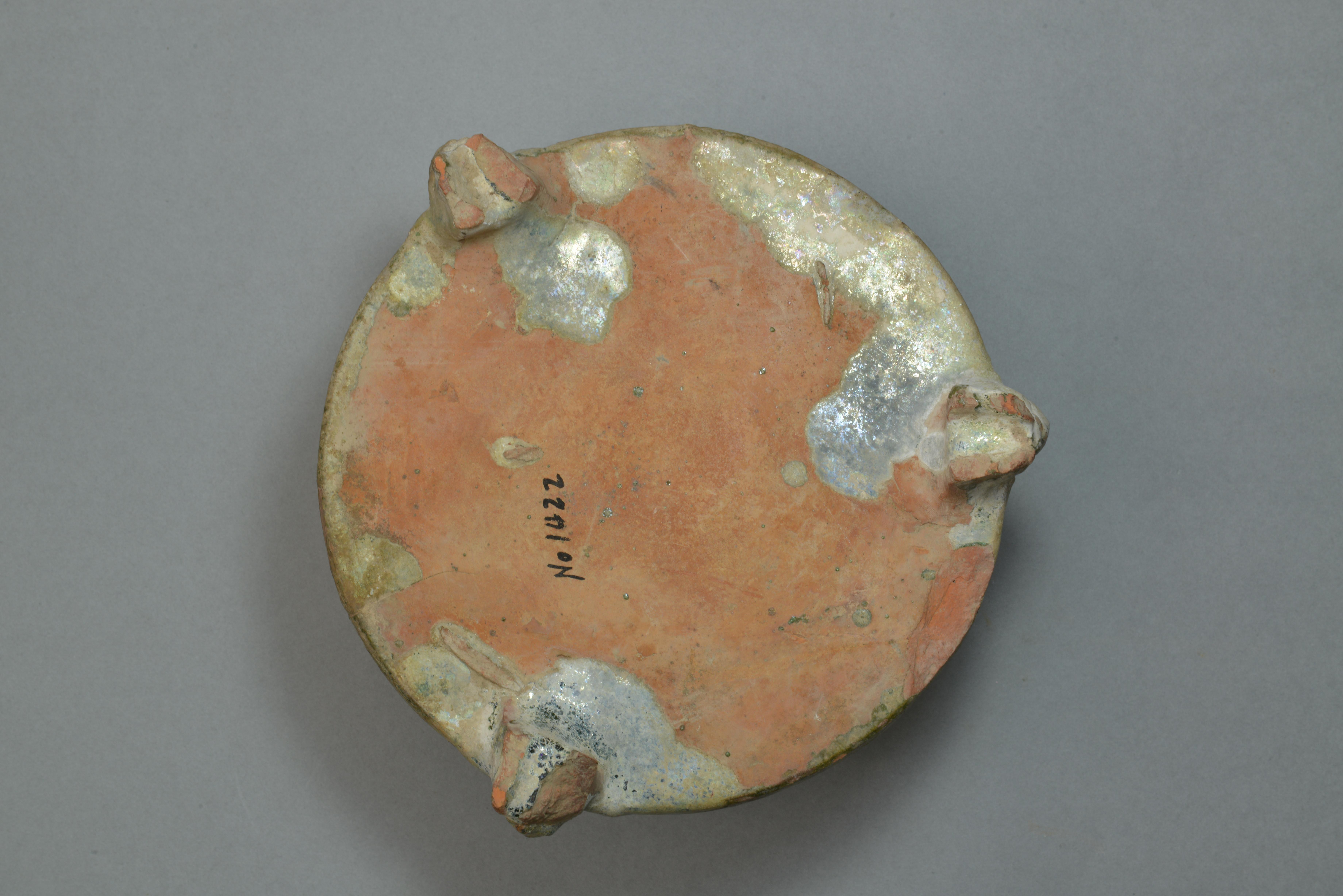 直口,筒形腹,平底,三熊足。腹上下各饰一道凸弦纹,其内浅浮雕饰博山、虎、羊等神兽。器内外皆施绿釉,底部露夹砂红陶胎。