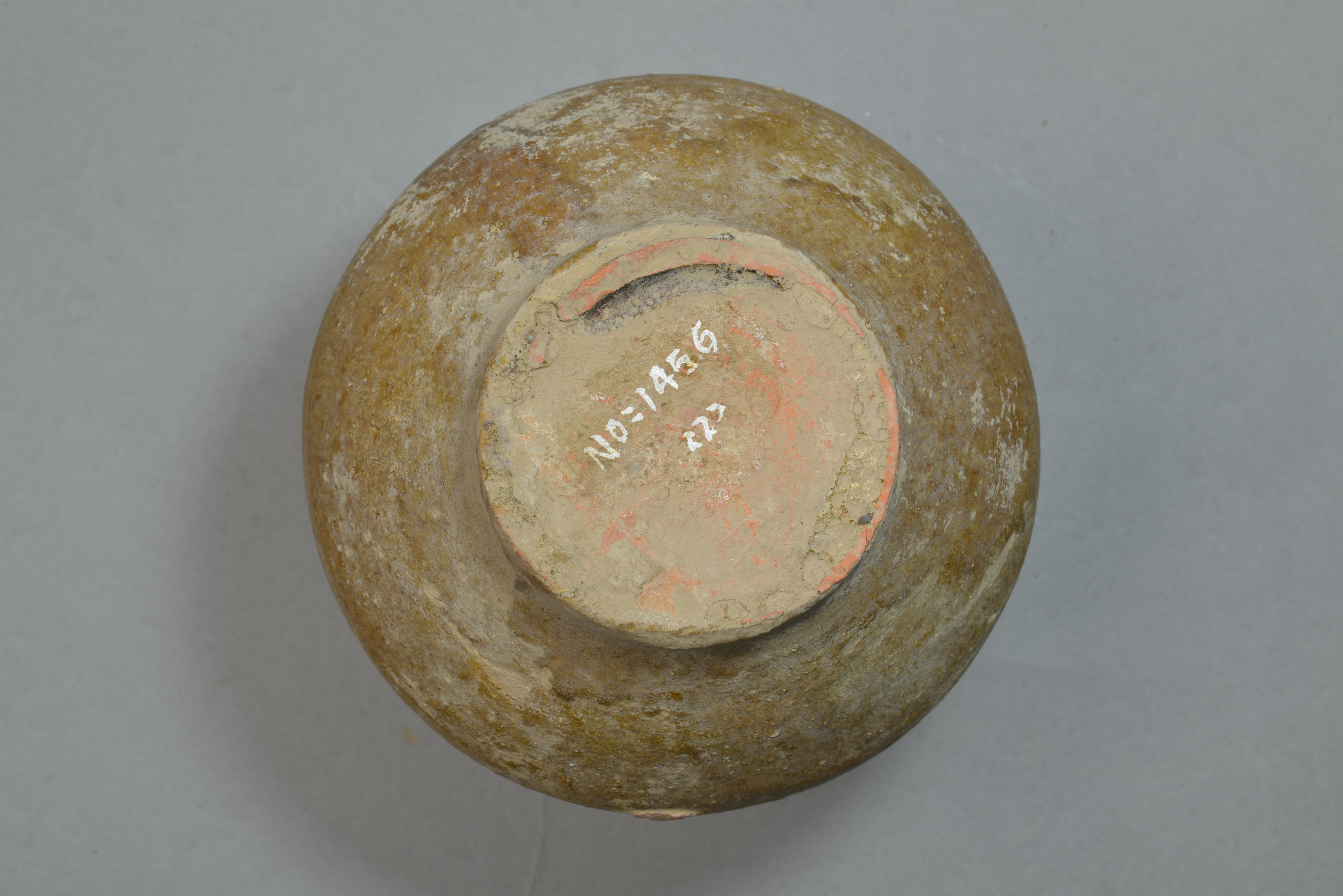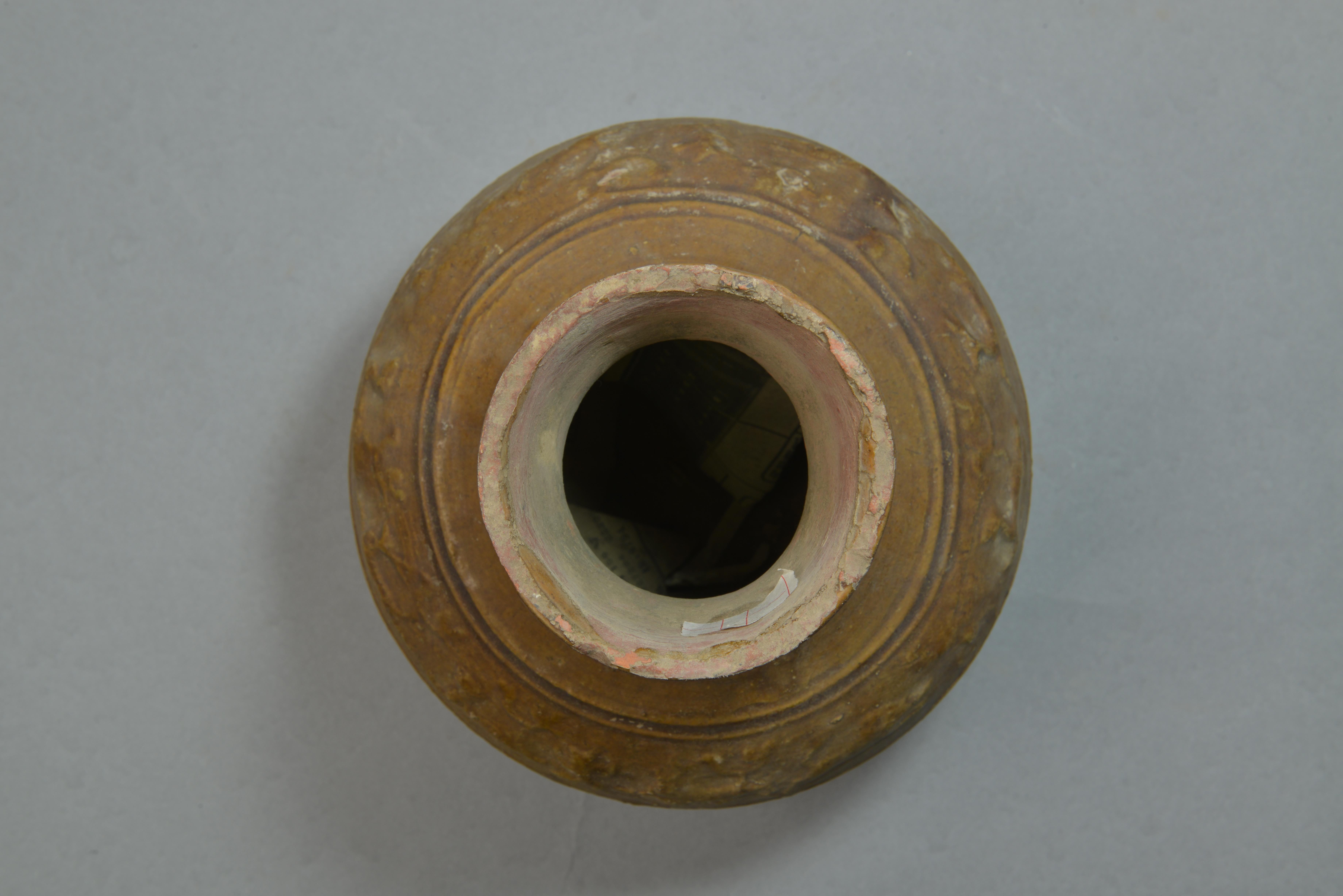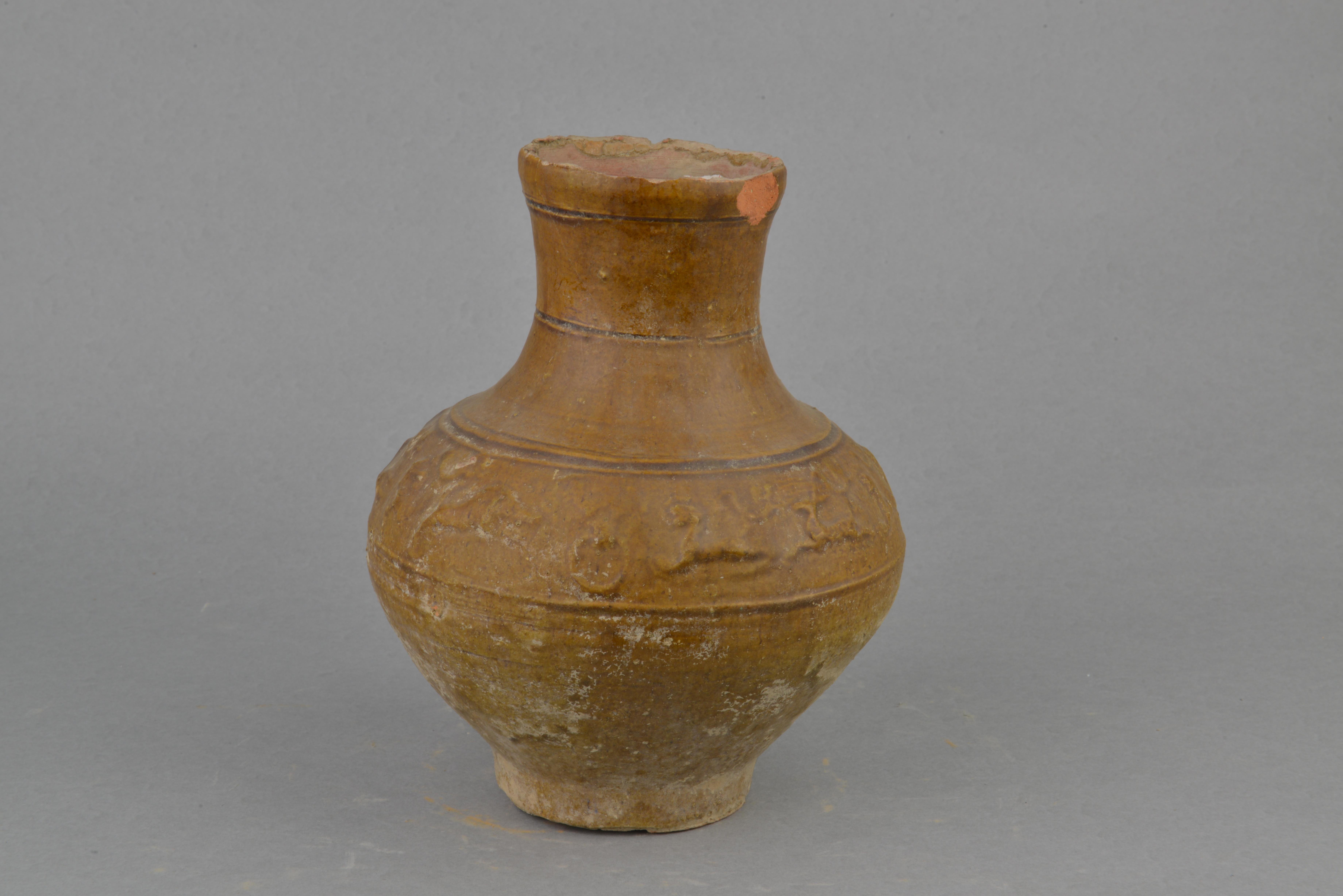 敞口,束颈,鼓腹,平底微凹。颈部至腹部饰四周弦纹,腹部两周弦纹内浅浮雕饰虎、鹿、猴等神兽,左右有对称的铺首衔环。器表罩黄釉,底部露夹砂红陶胎。