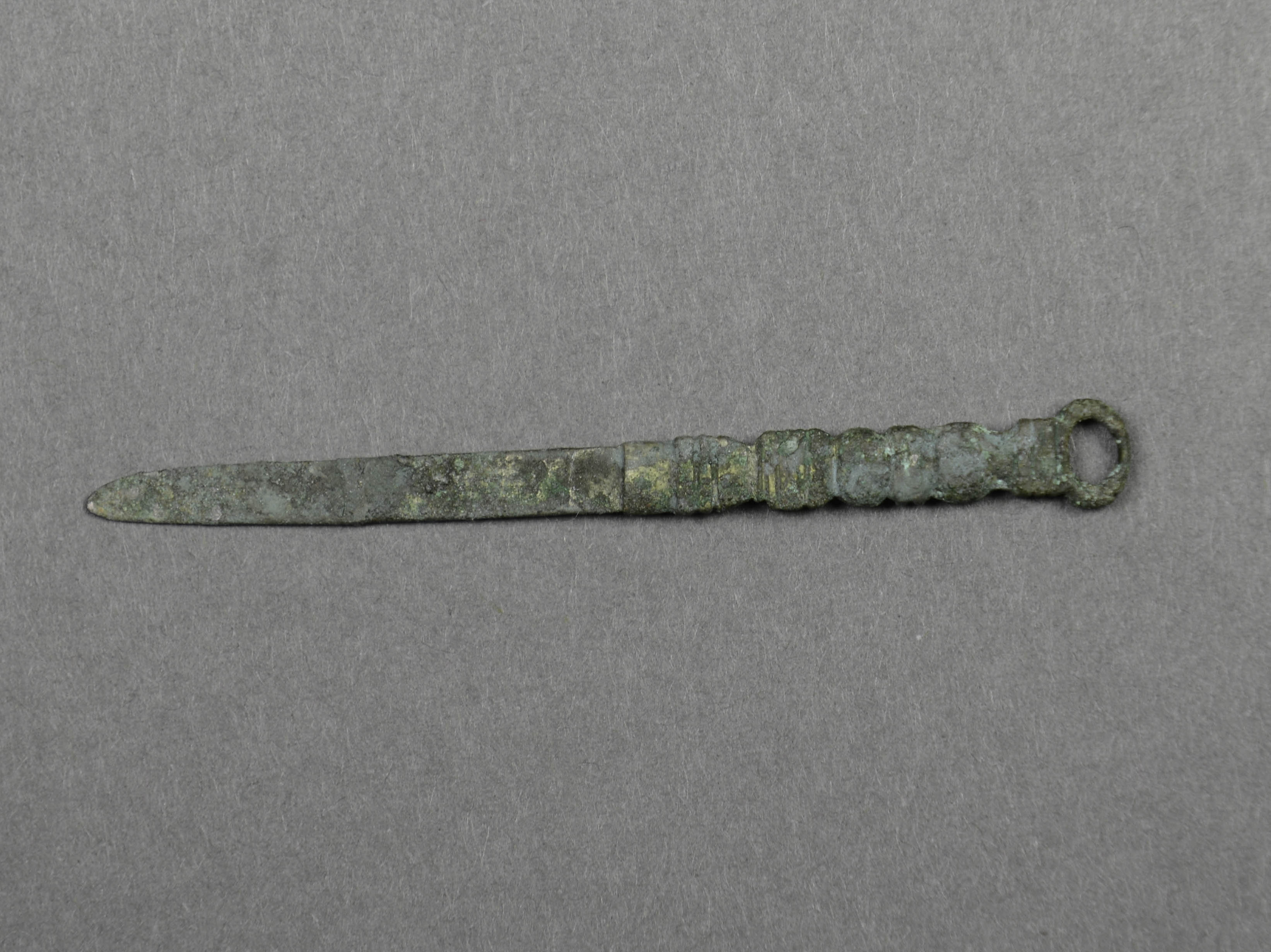 环首,长方形柄,斜刃,柄端刻两道凹弦纹,刃口较锋利。