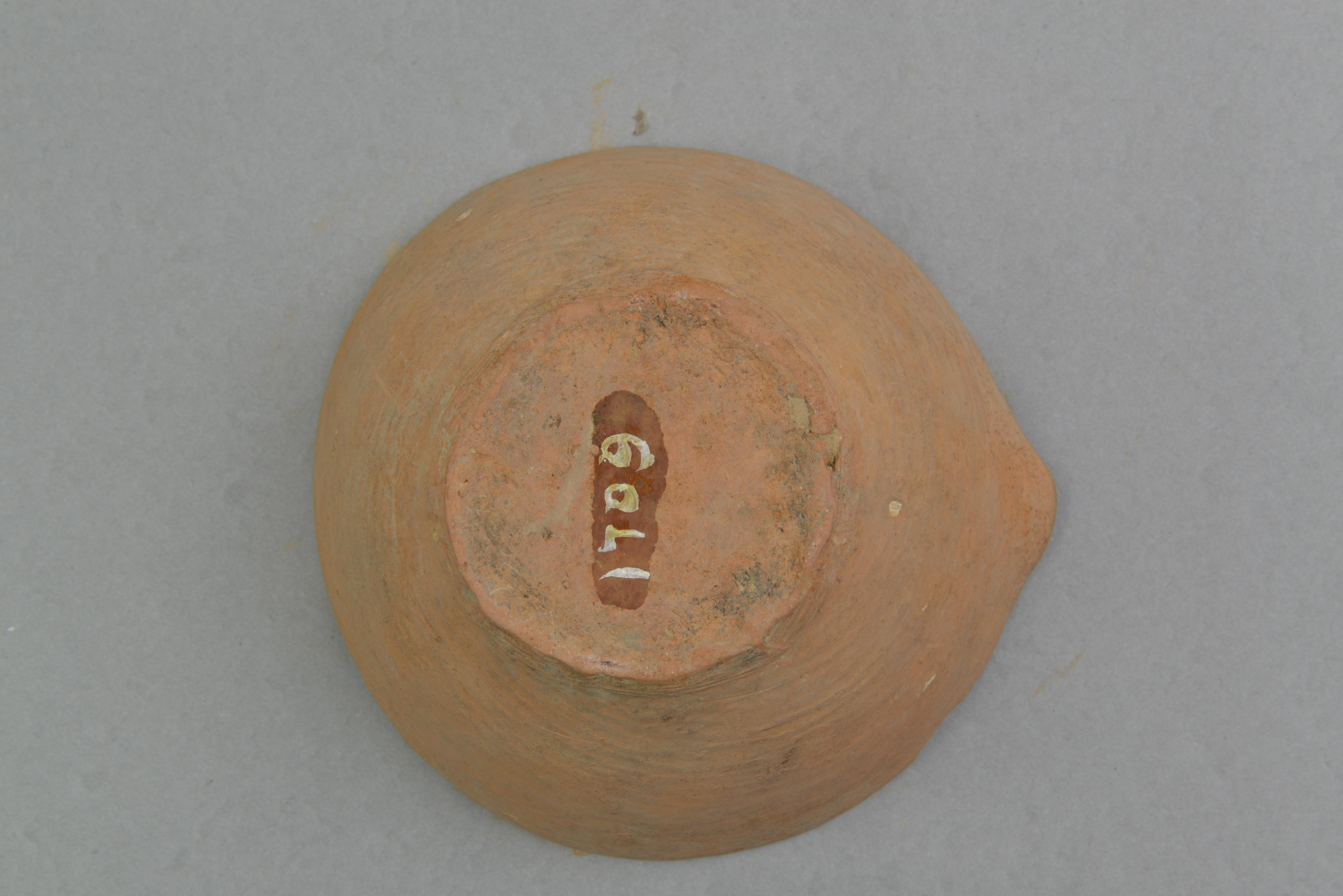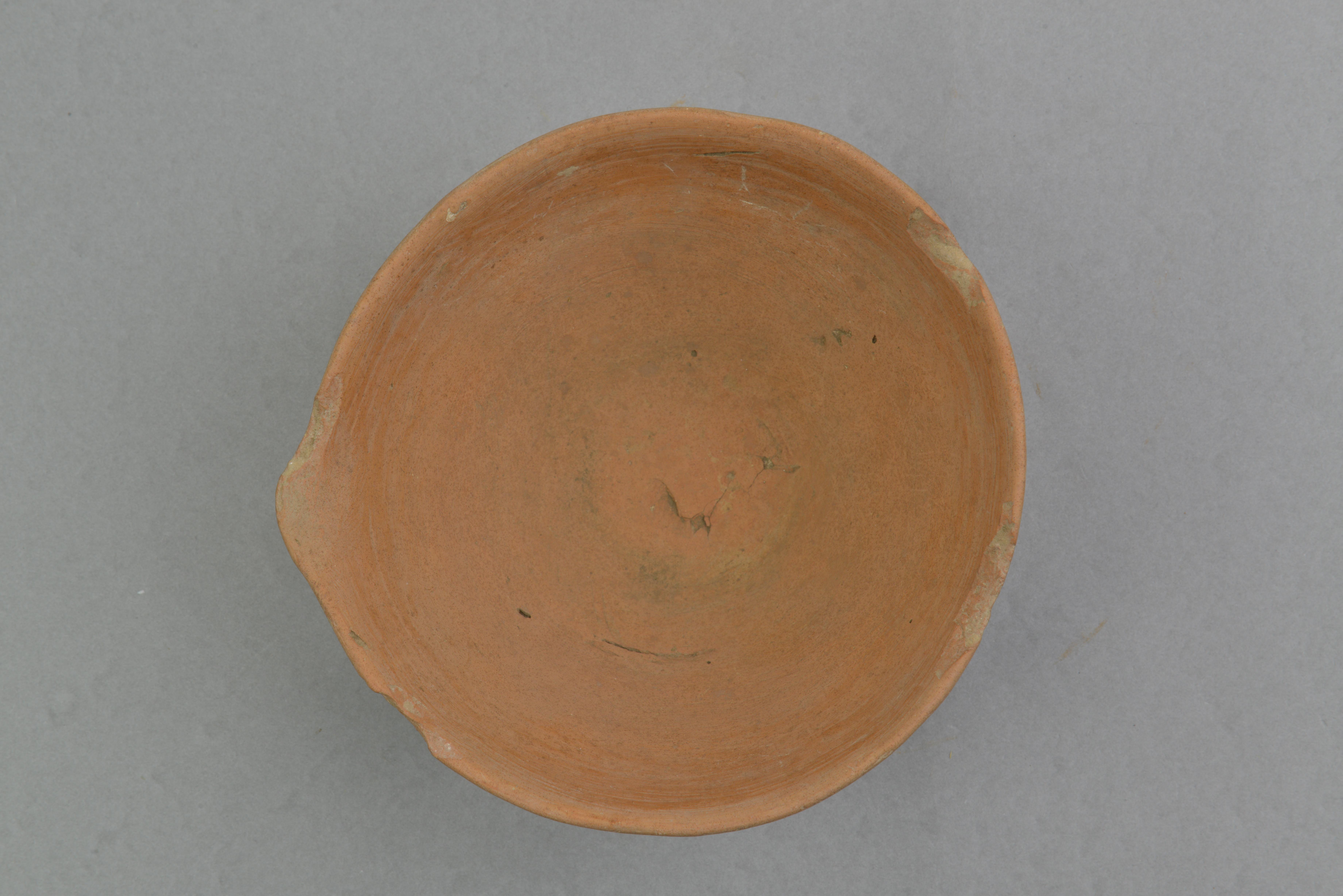 泥质红陶。敞口,口沿一侧有鸭嘴状流,弧腹,平底。腹部饰篮纹。