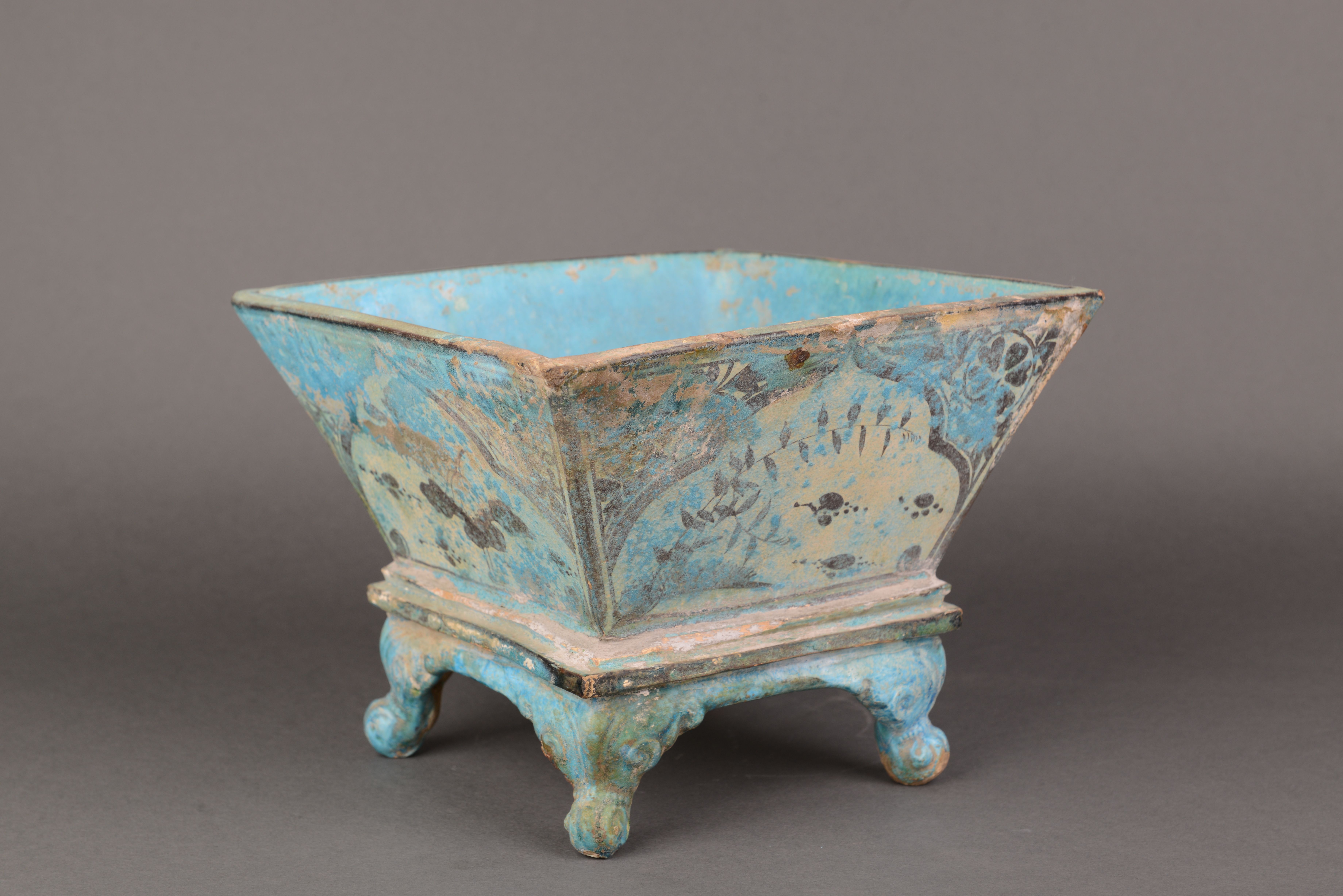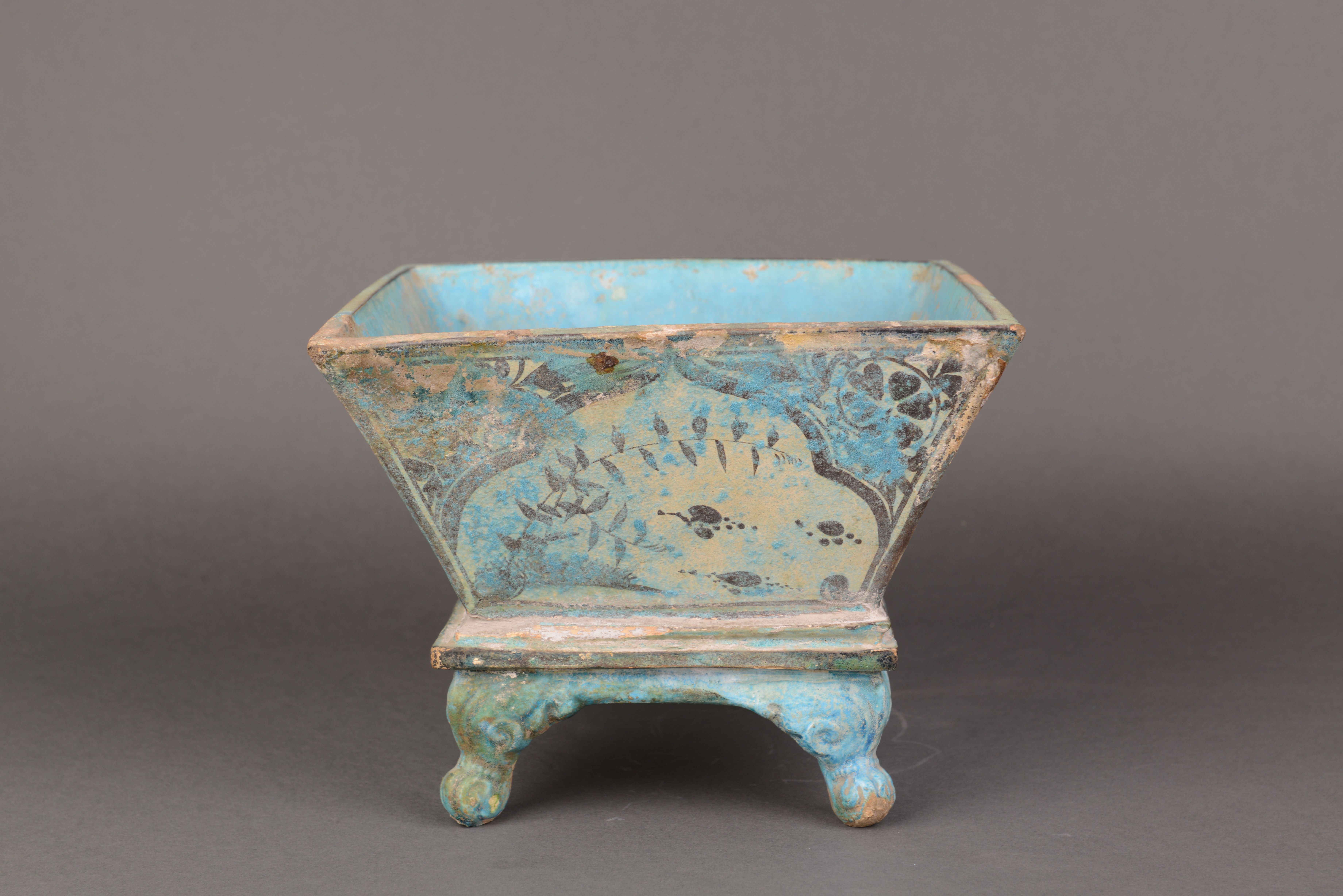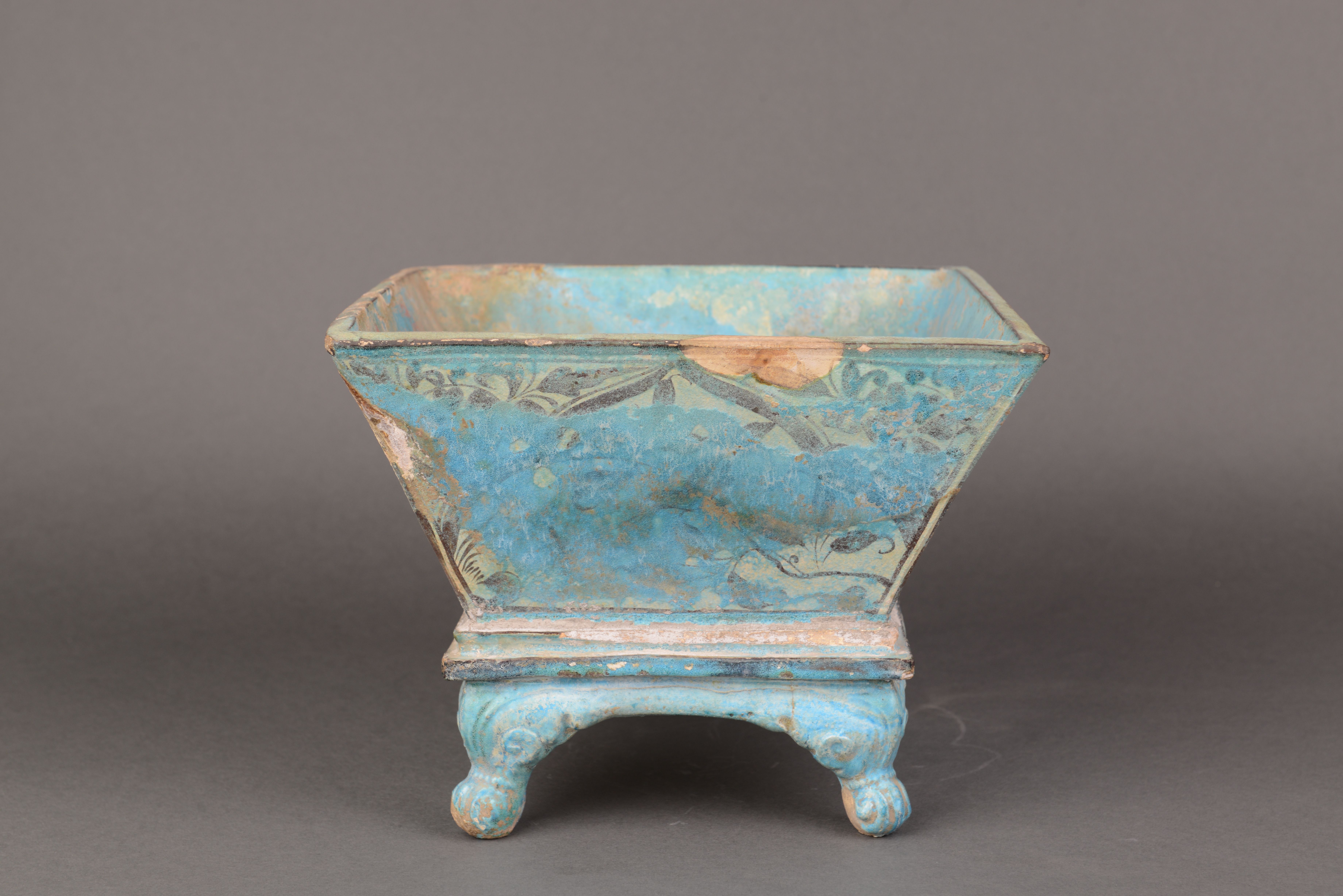 斗口方形,上大下小,四兽足。足上出二层垂沿,斗体四壁黑彩绘如意头窗,内饰芦雁纹,外绘折枝花卉纹。通体罩蓝绿色釉,外底露胎。