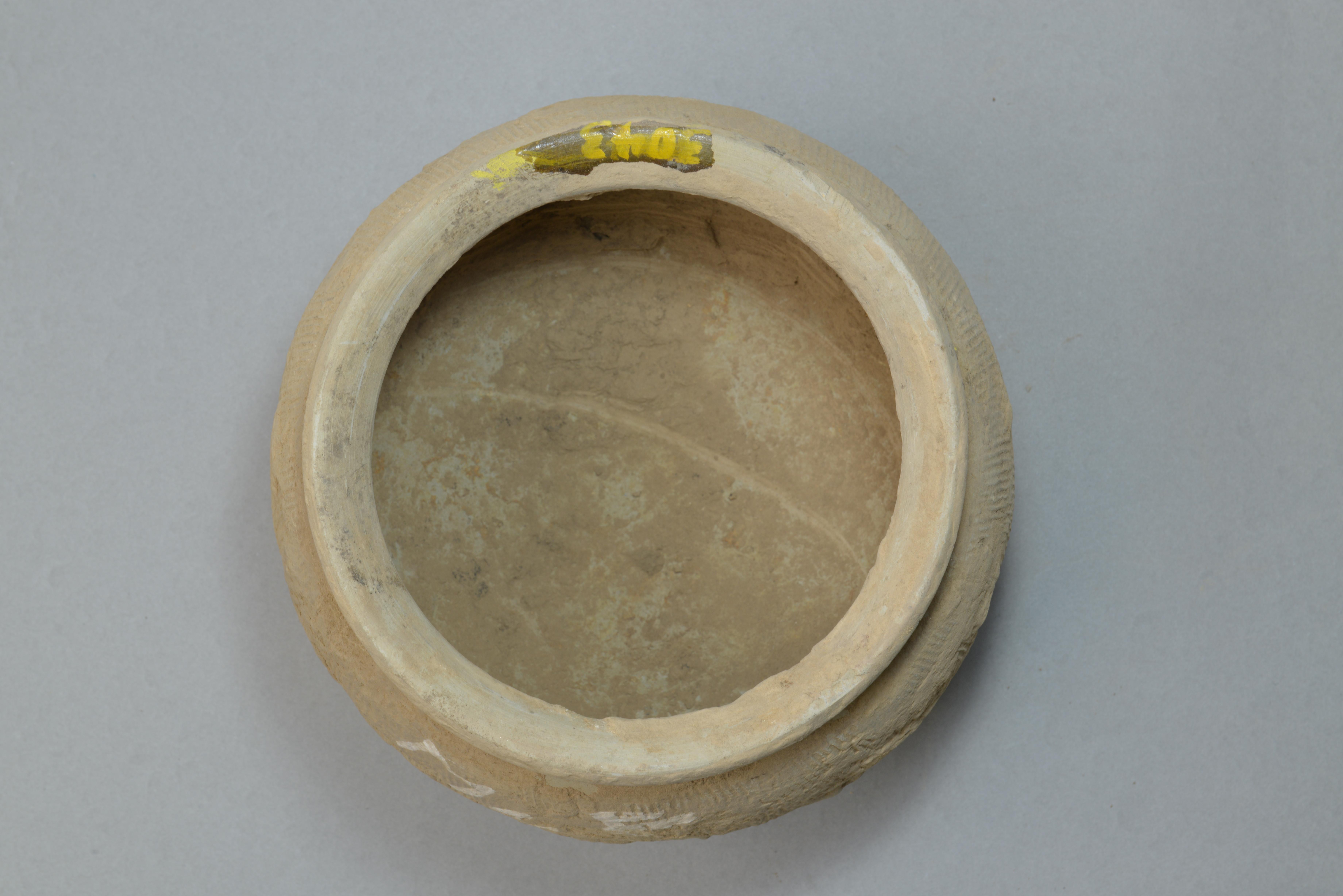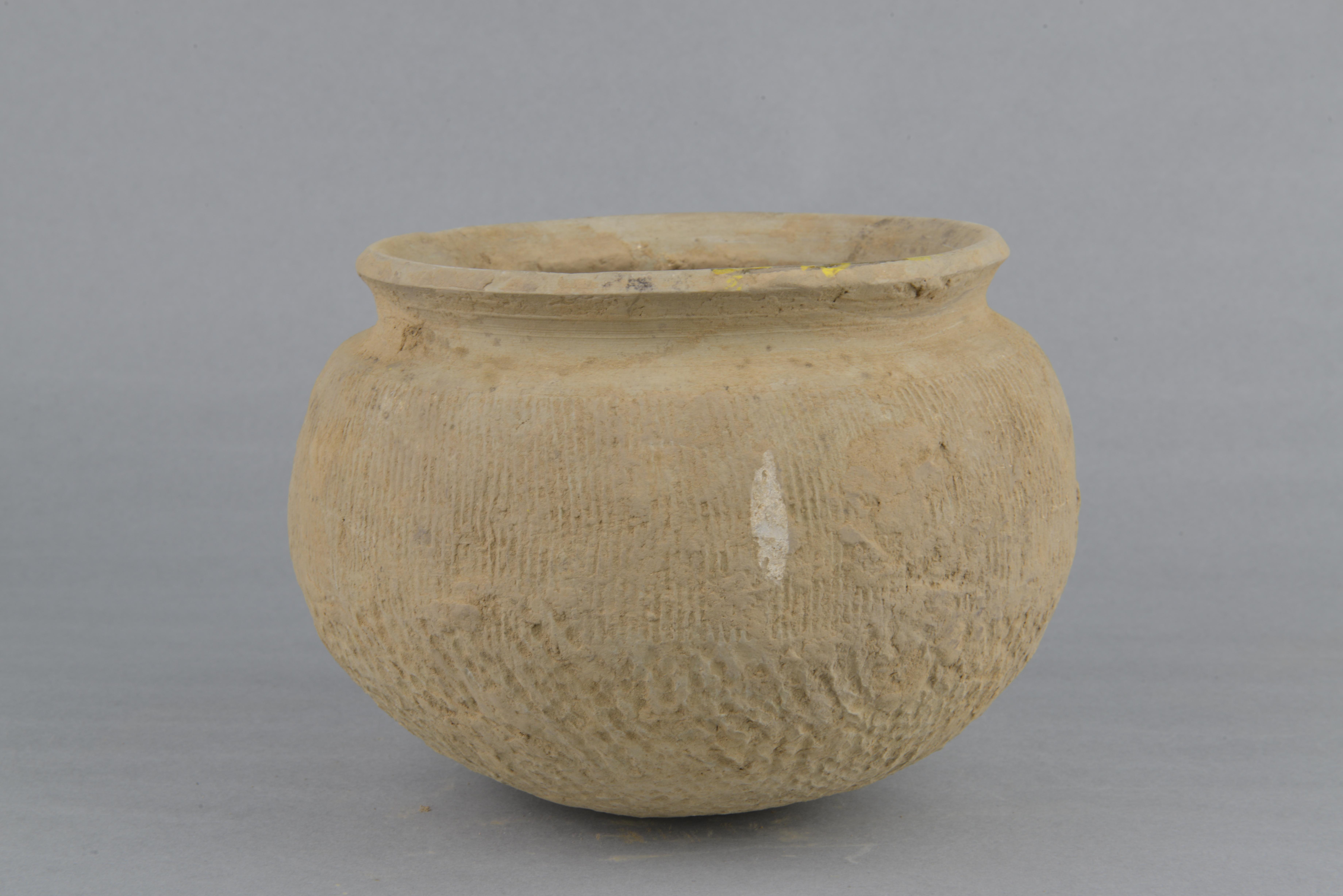 泥质灰陶。侈口,方唇,束颈,半球形腹,圜底。腹部及底部饰绳纹。