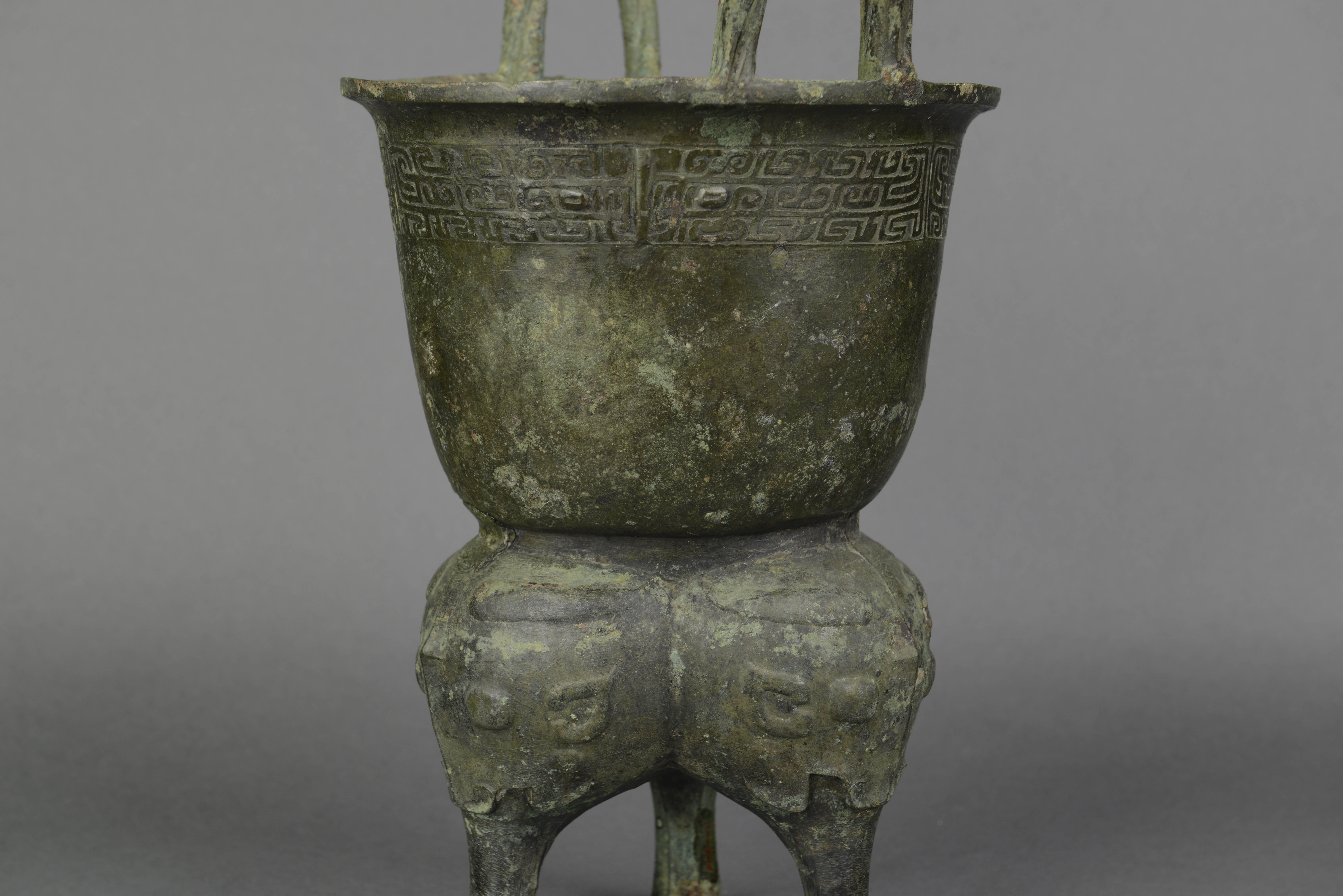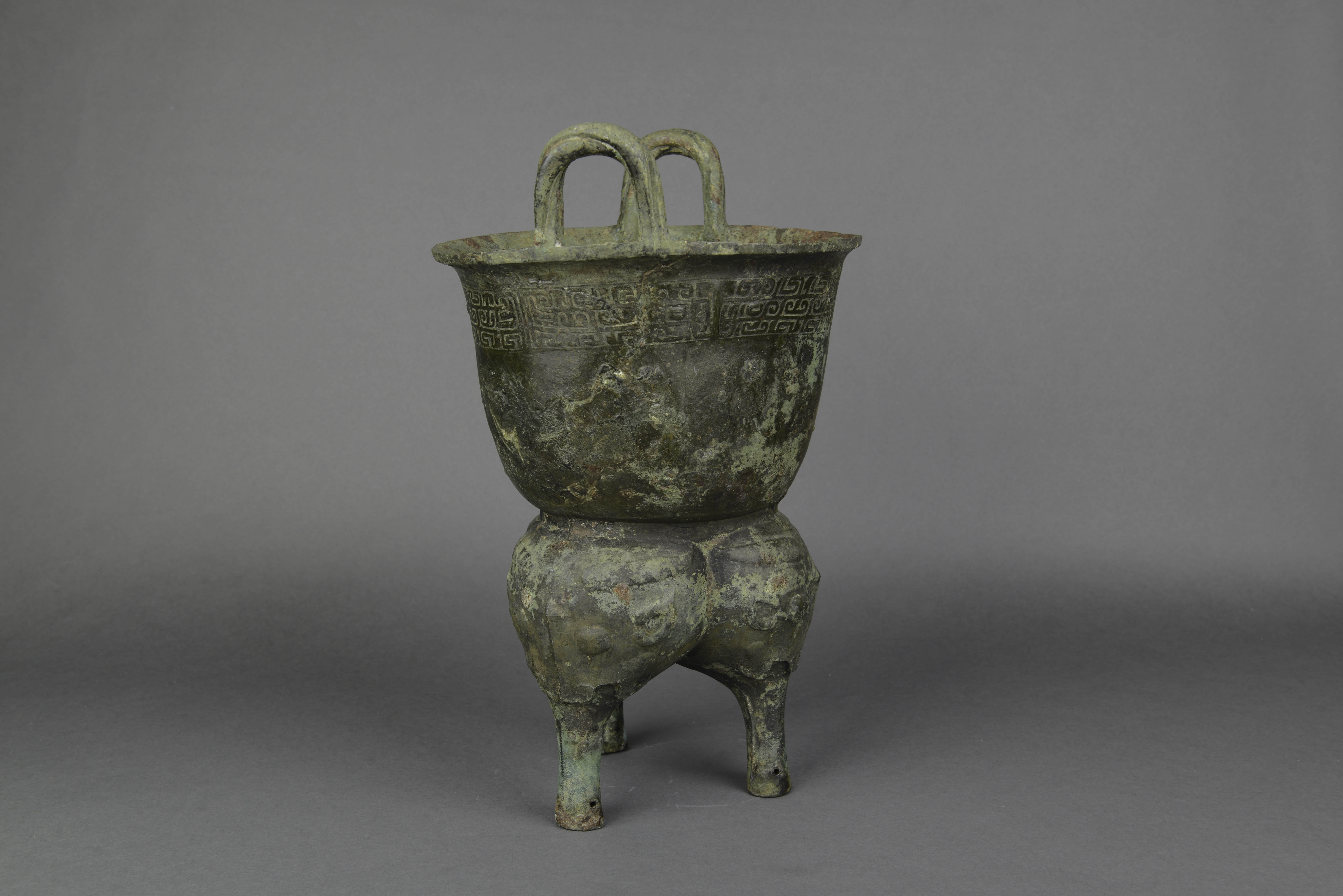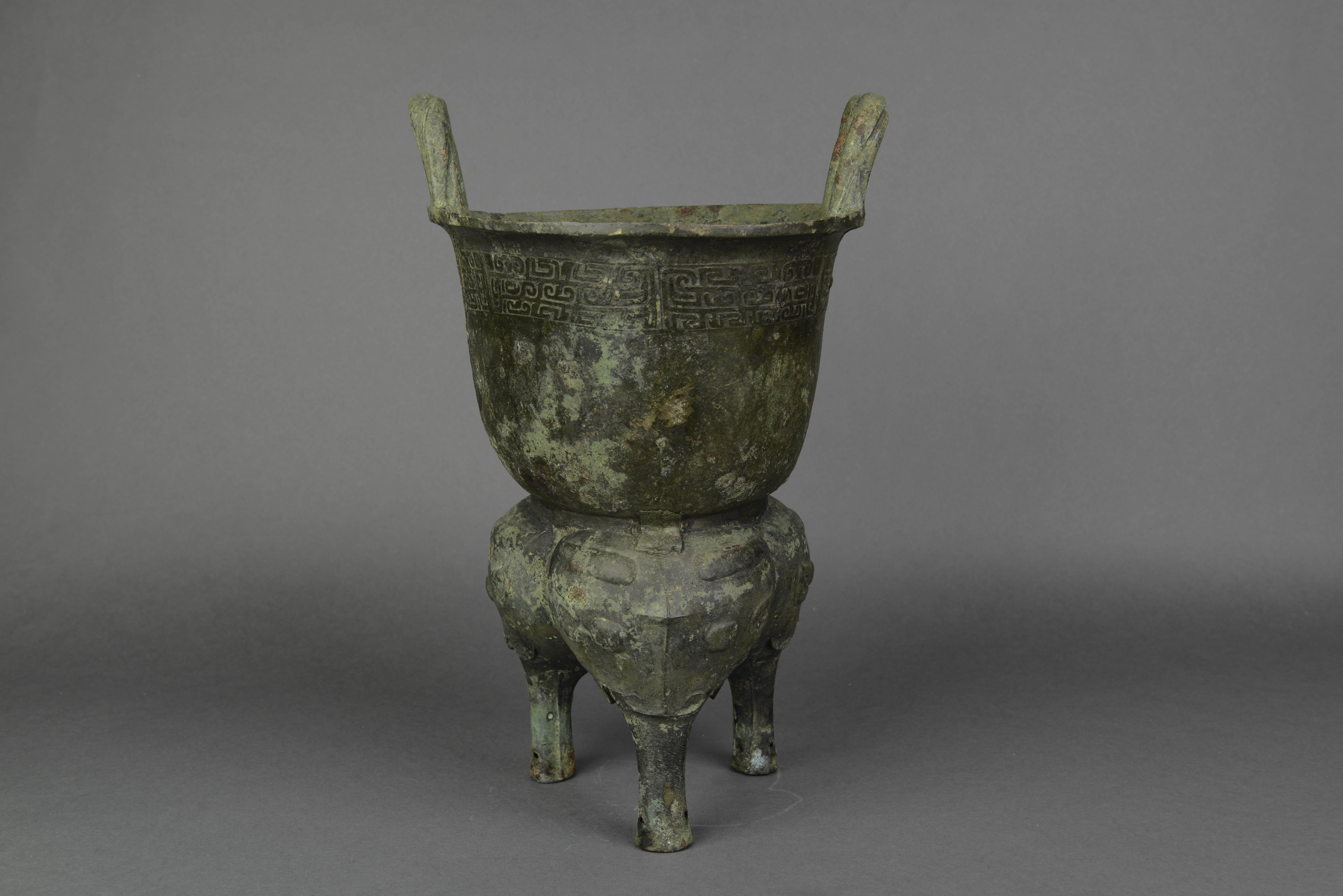 甑侈口,斜尖唇,口沿上作两对称索状立耳,斜腹,底部作箅,上有五组十字形箅孔,并有半环钮可以启闭。鬲短束颈,分裆,三柱足。甑口沿下饰夔龙纹作地的三组简化饕餮纹,鬲足上部饰三组高浮雕兽面纹,范痕明显。