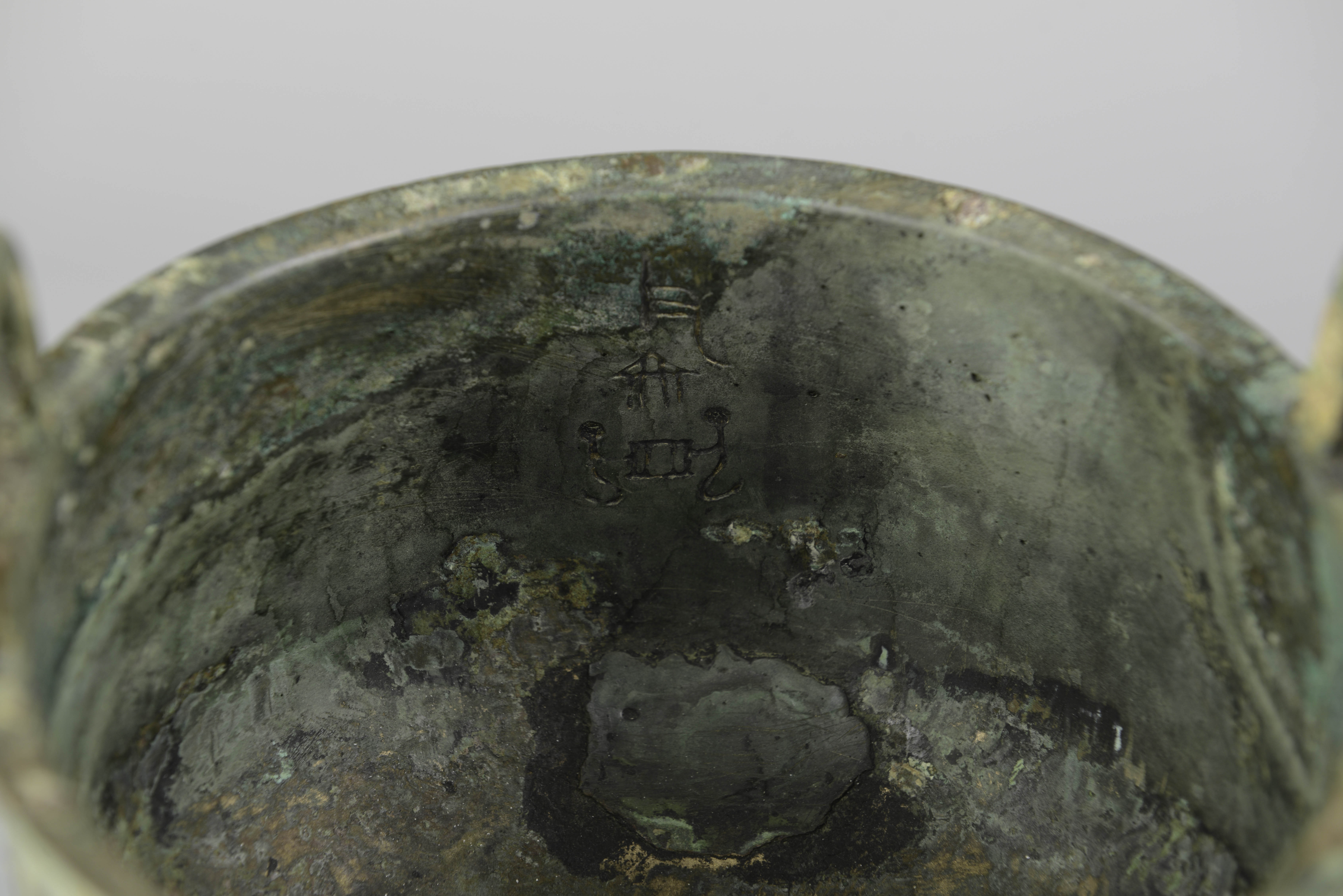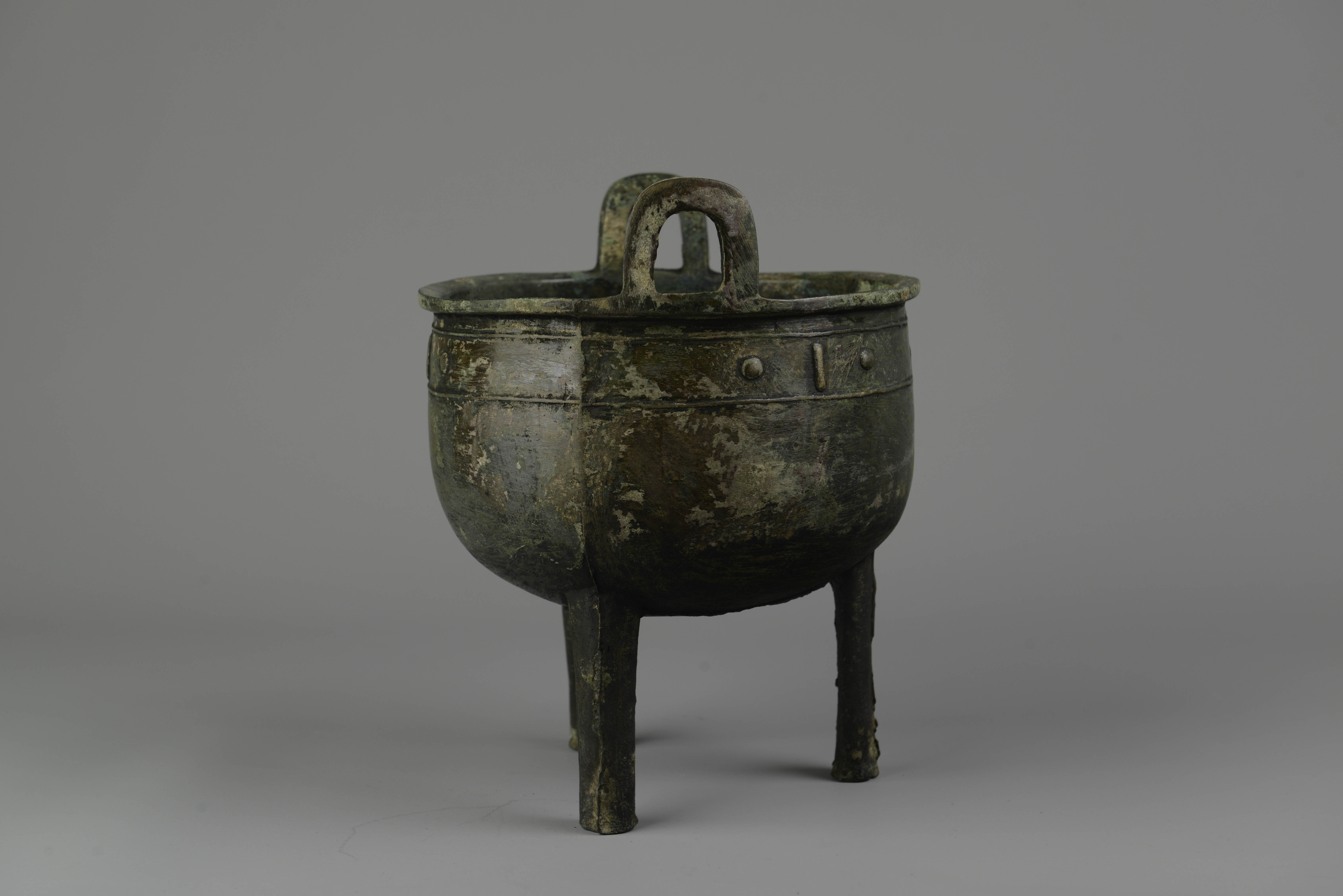 窄平沿上作两对称环形立耳,深腹,圜底,三柱足。腹上部饰两周细凸弦纹,其间均匀分布三组简化饕餮纹,底部有三角形范痕,腹内壁有籀书“父京兴”铭文。