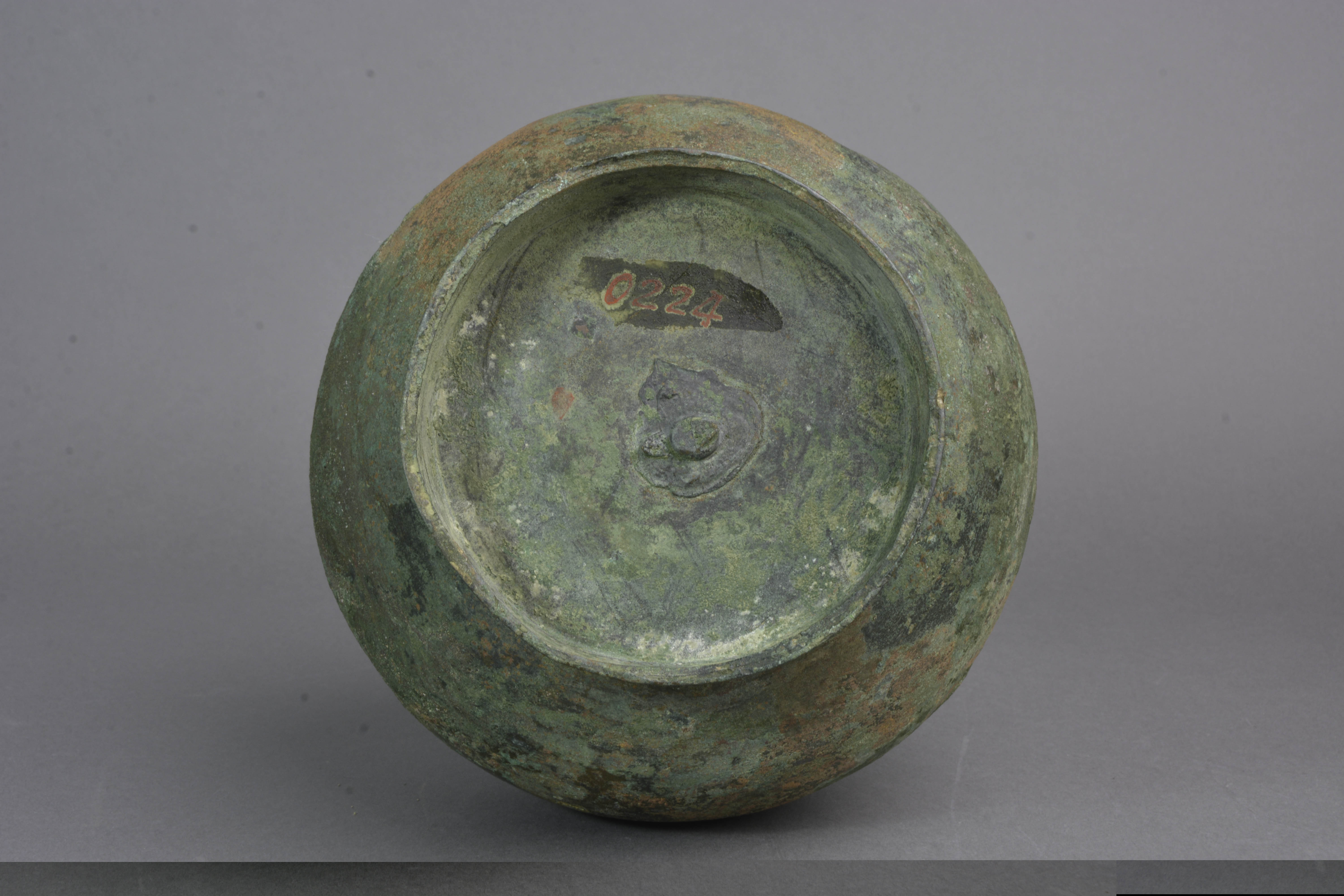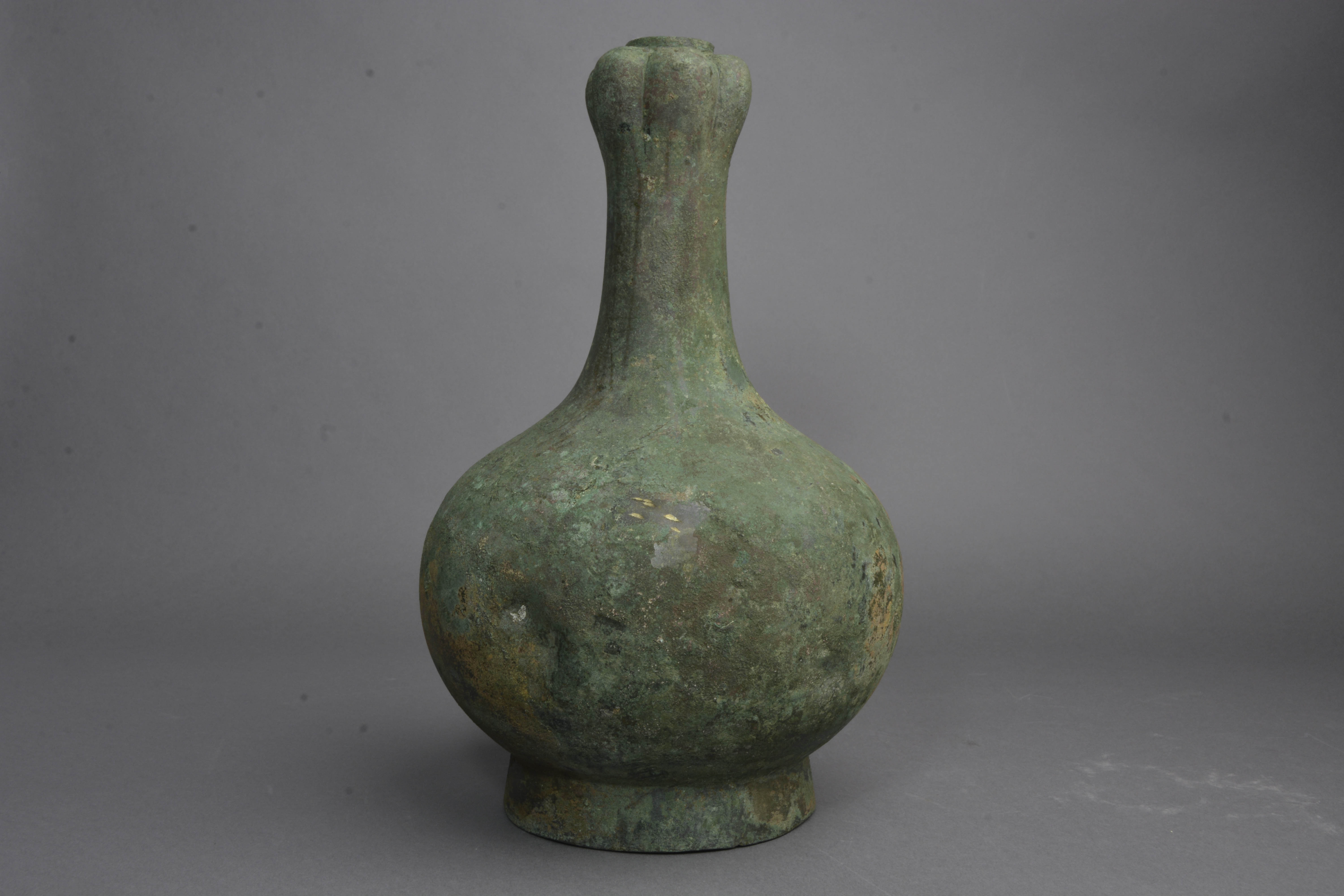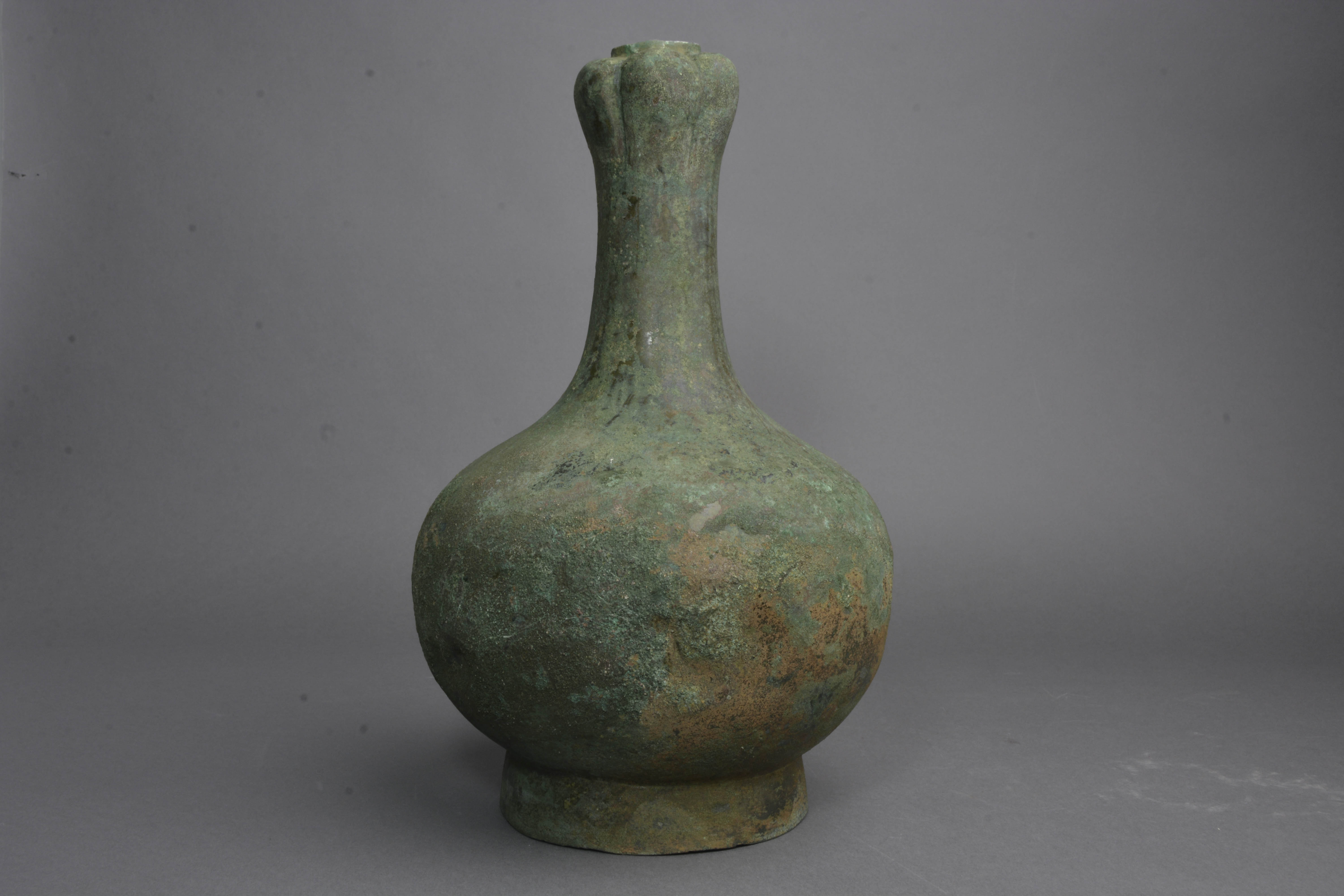 小口,口外作蒜头形,细颈,球形腹,高圈足。