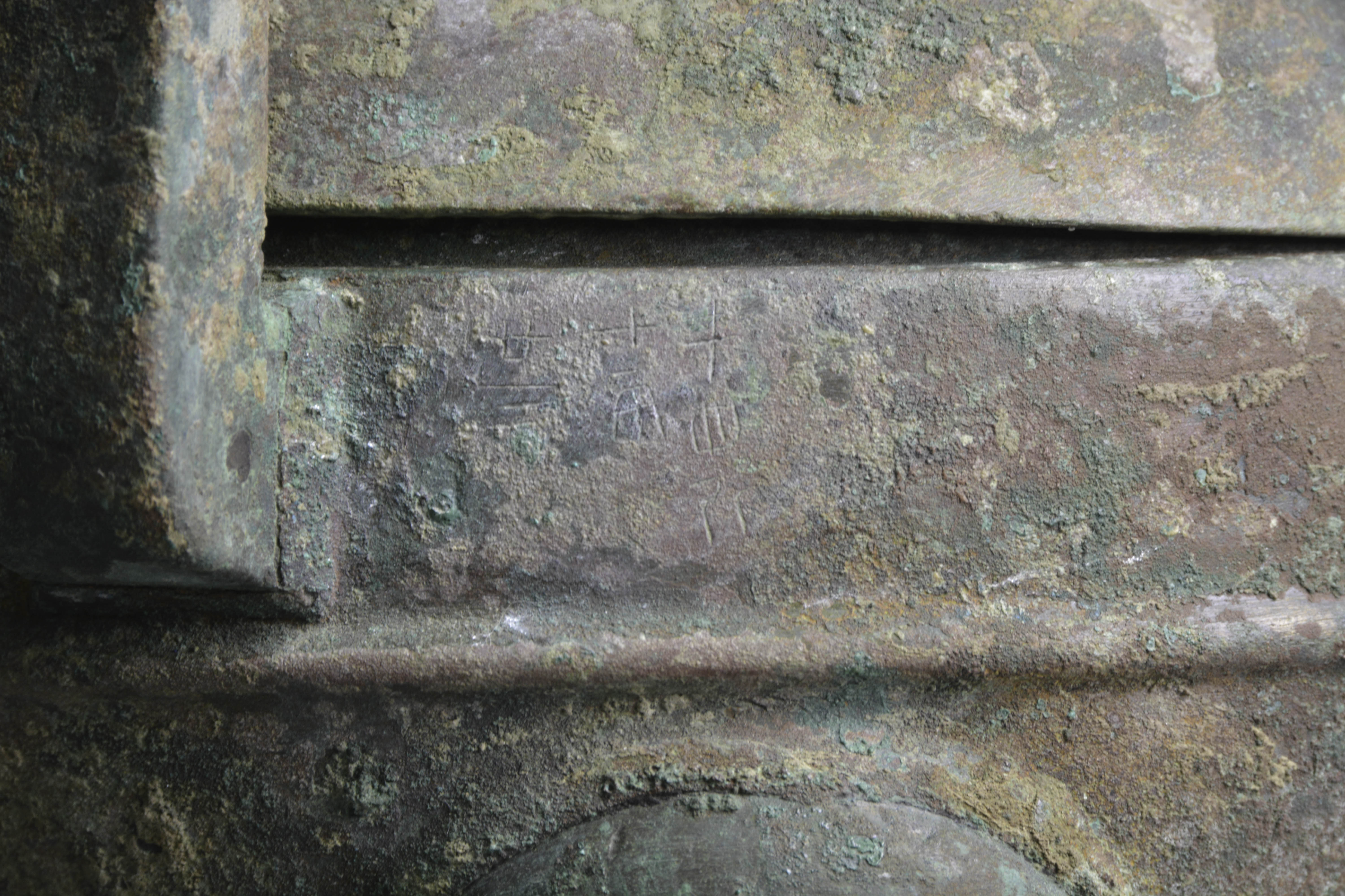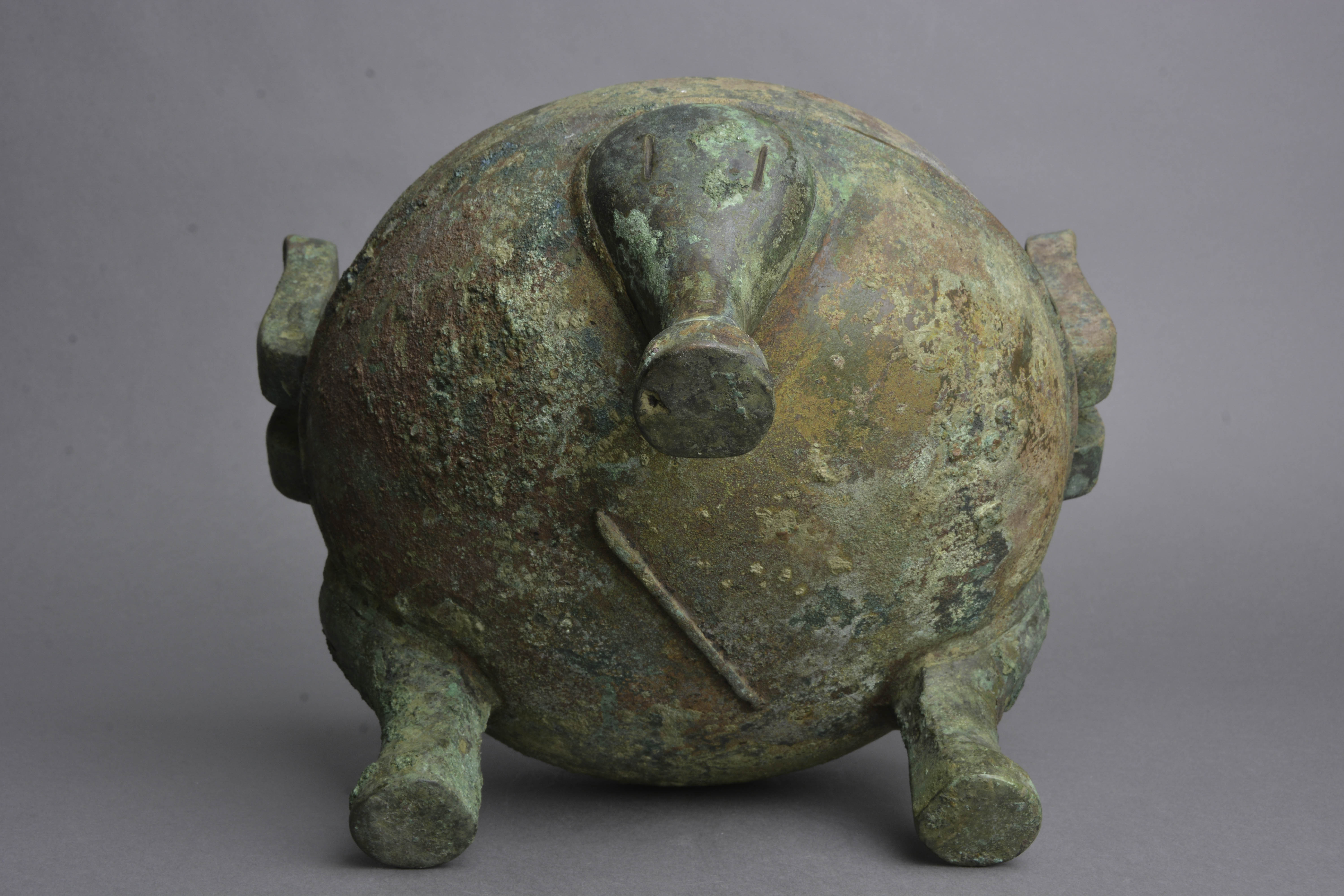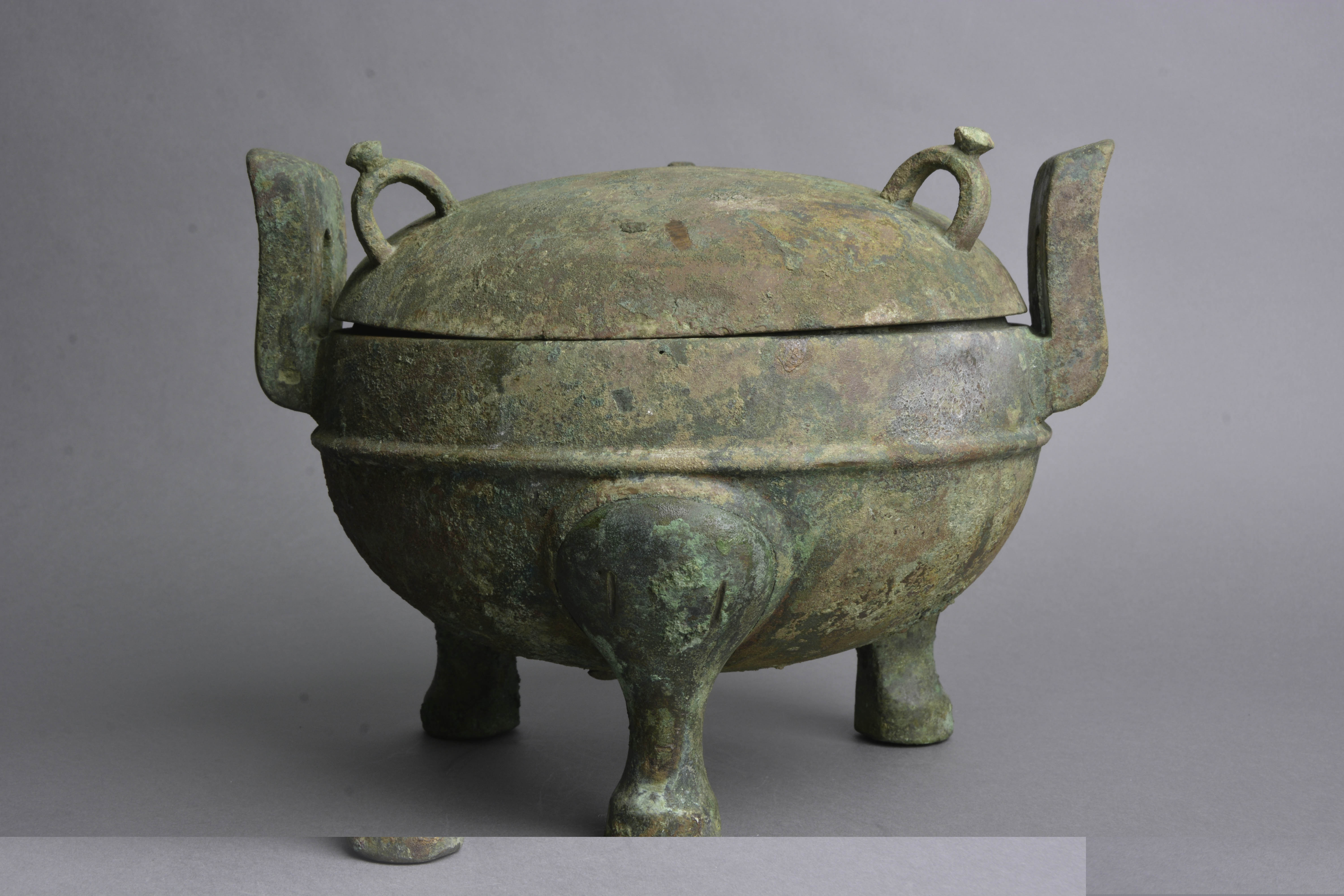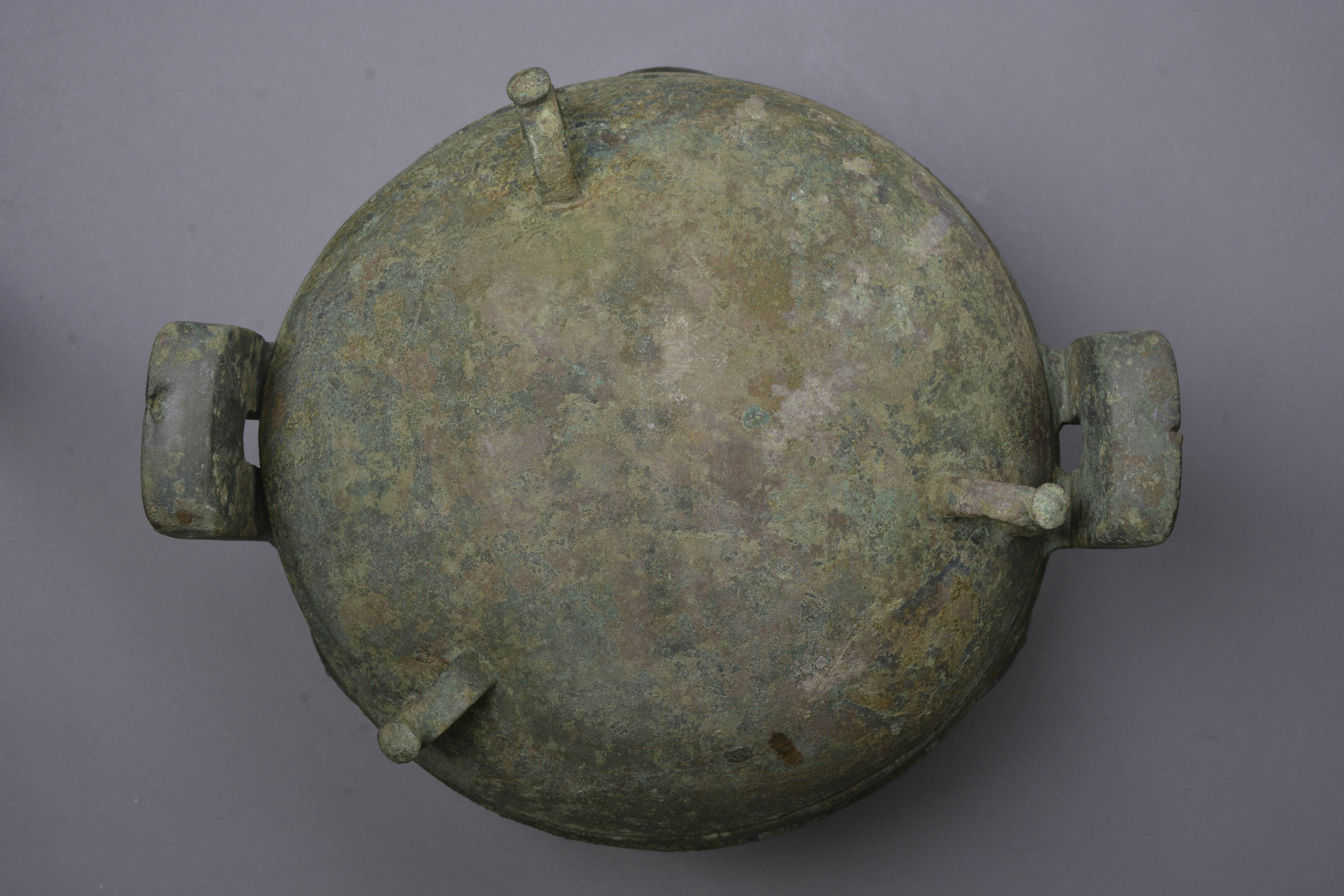 半球形盖,盖顶均匀分布三环,环上起乳。子母口,两对称附耳,圜底,三矮蹄足,腹中部饰凸弦纹一周,盖口阴刻“二斤十四两”铭文,一耳两侧近口沿处分别阴刻“十四斤七两廿三”和“□□和官一□六□”铭文。
