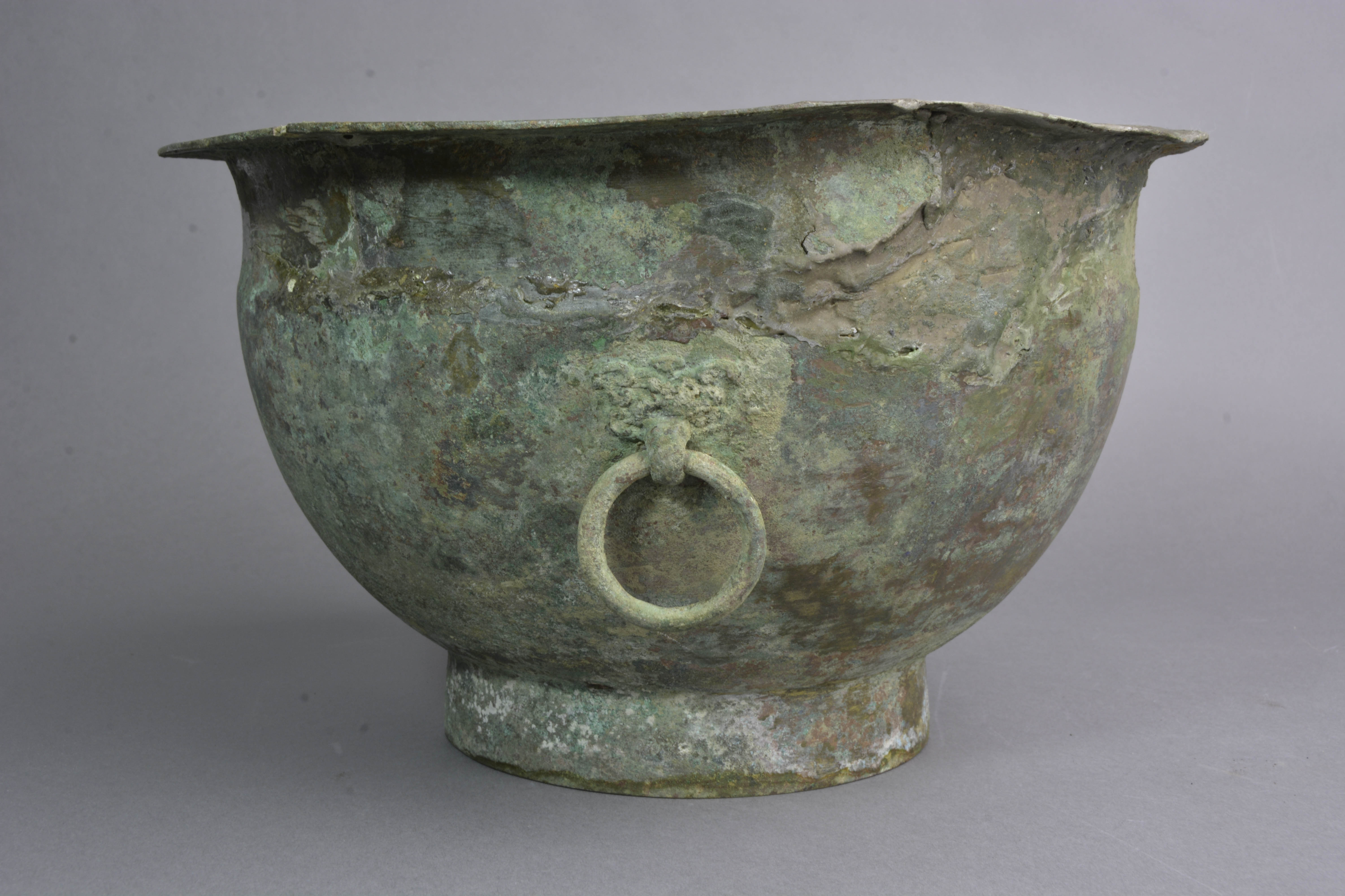 平折沿,深弧腹,高圈足,箅形平底,腹中部作两对称铺首衔环。