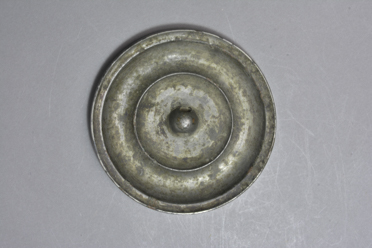 侈口,斜腹,平底,三蹄足外撇,腹部出长曲柄,柄端龙首形。腹底遍饰细密弦纹,底部近中有凸棱一周,足根浮雕人面纹。