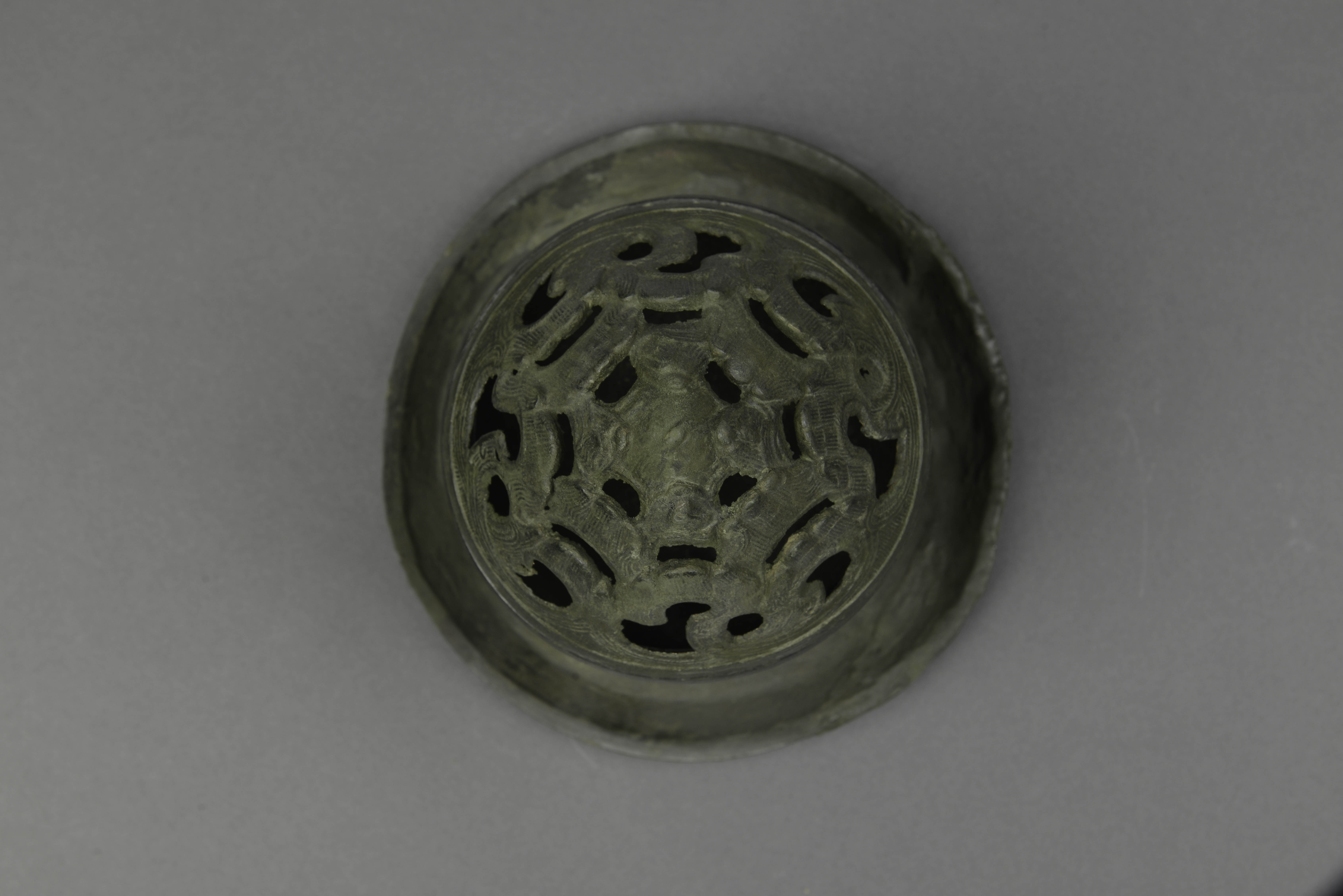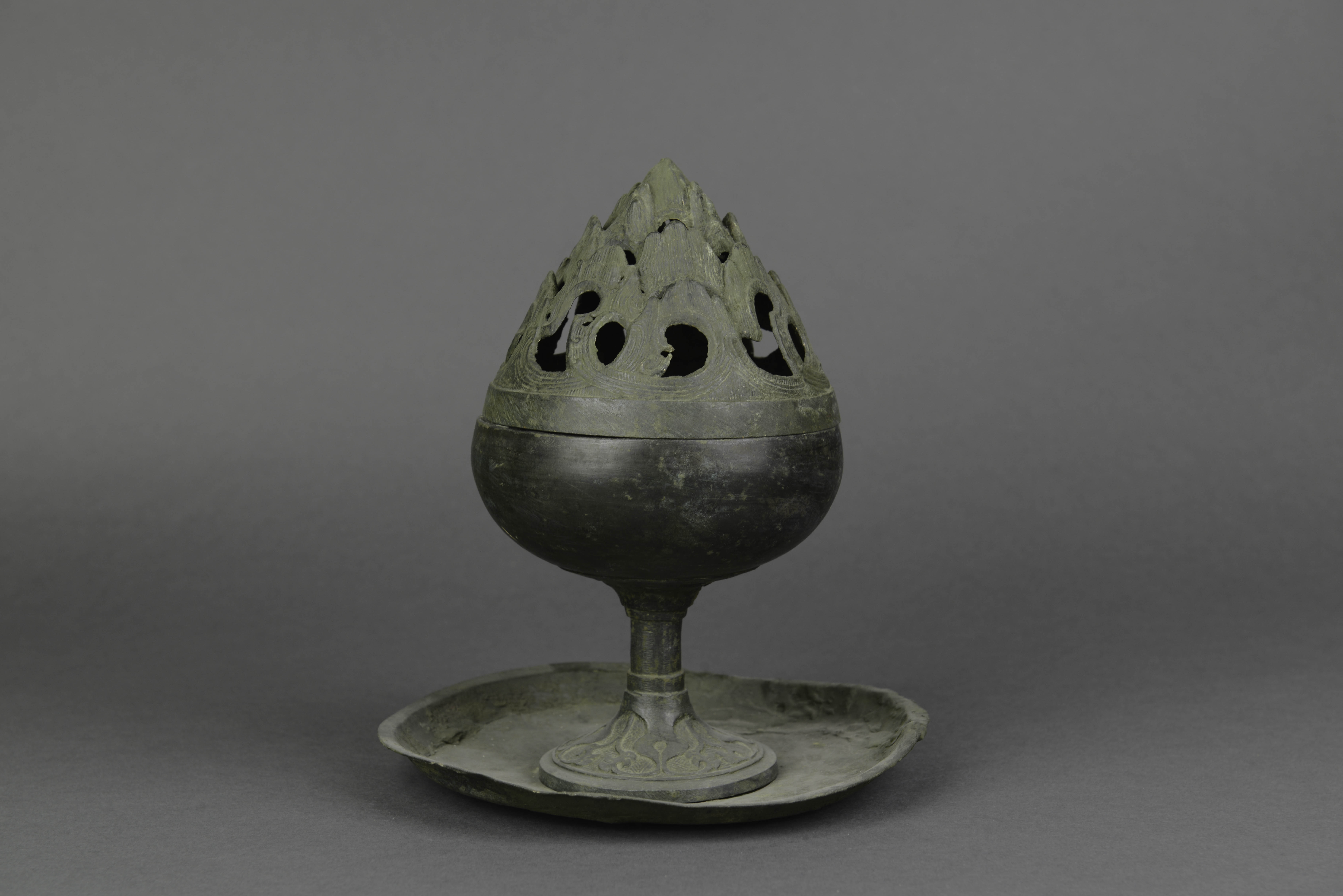 镂空博山形盖,子母口,半球形腹,喇叭形底座与平折沿托盘套接,座上饰席纹作底的柿蒂纹。