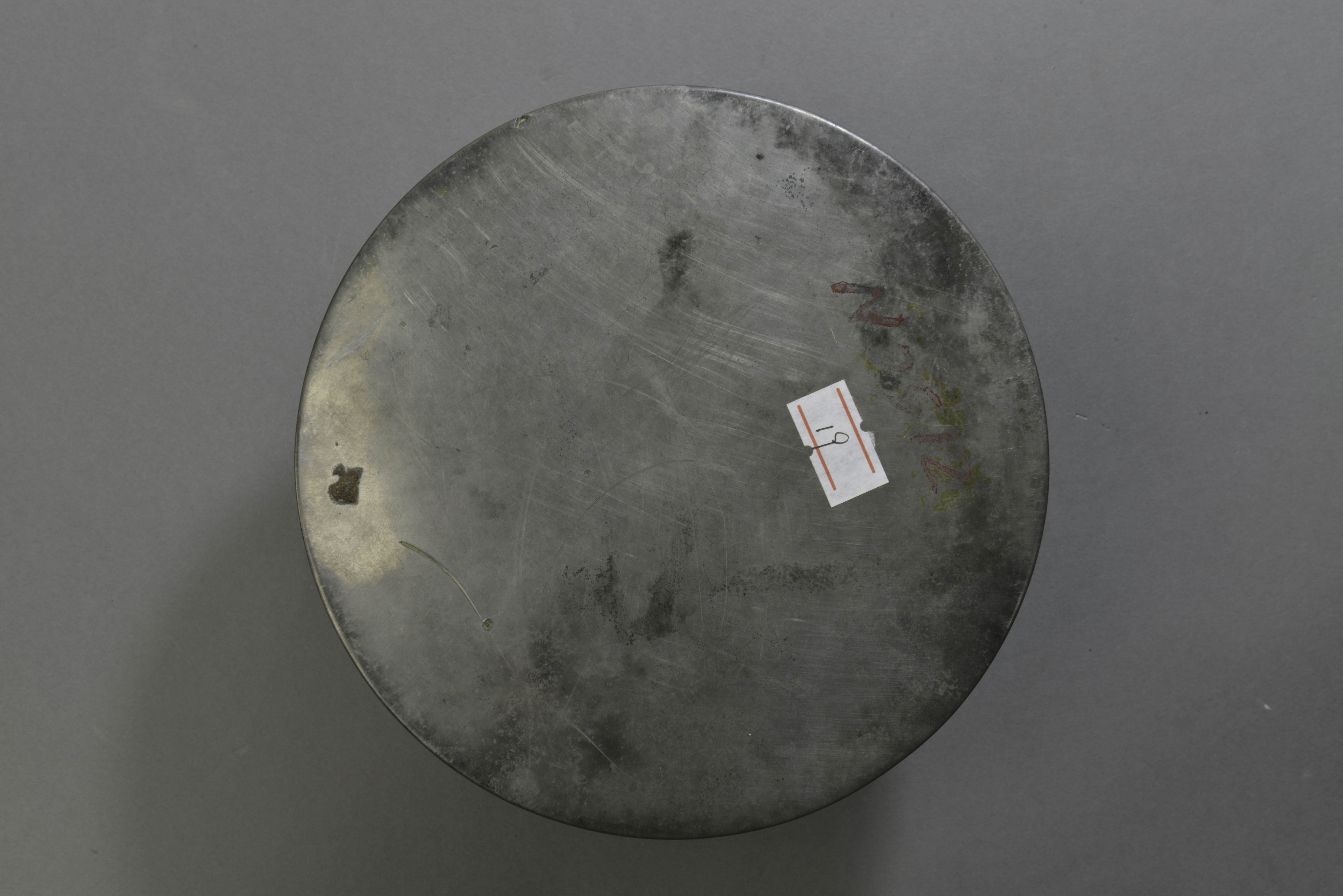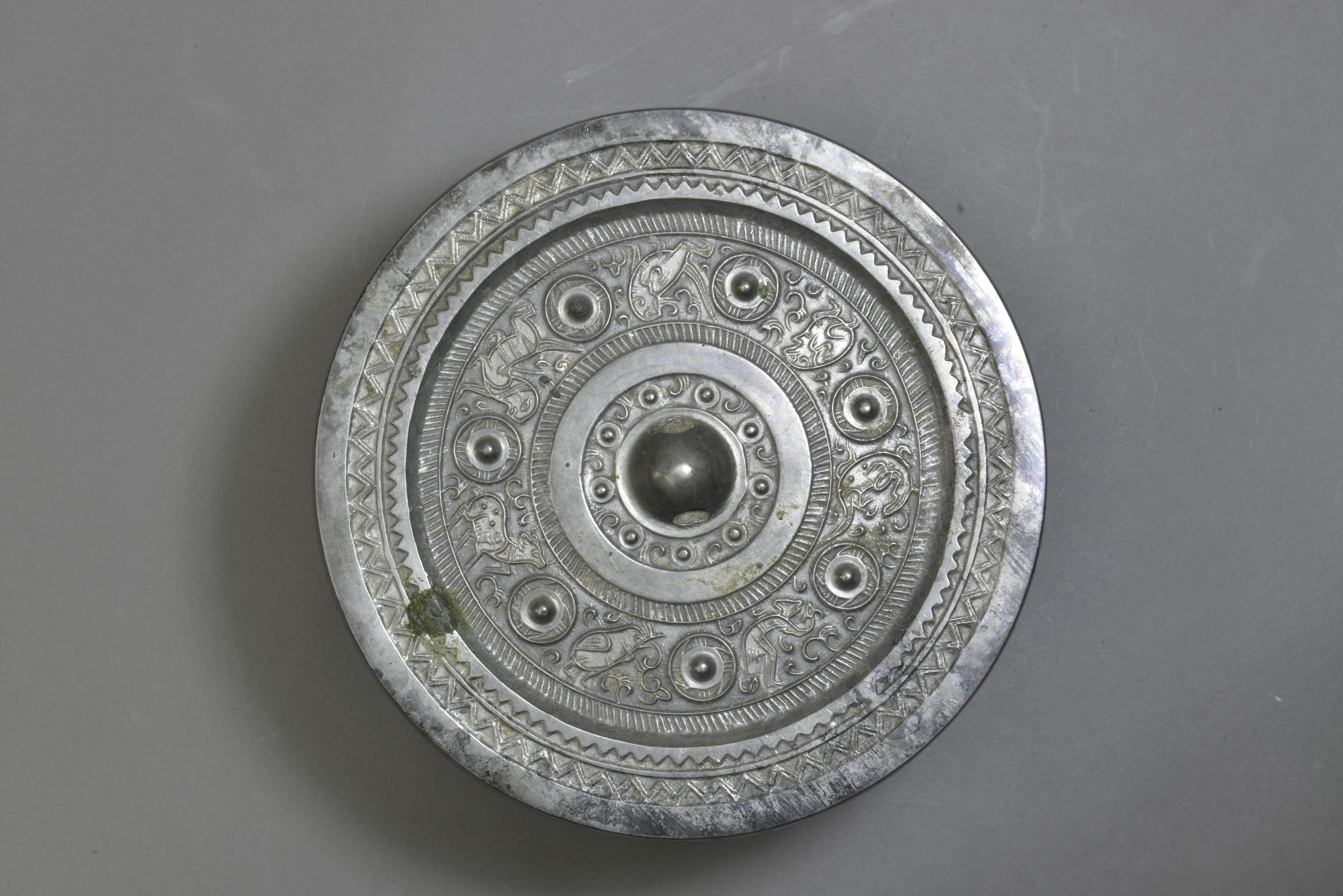 圆形,圆钮,圆钮座。座外饰九枚小乳钉纹,间以云气纹。其外是宽弦纹带和一周短斜线纹。外区主体纹饰为云气纹衬地的七乳神兽图案。宽缘上饰锯齿纹,双线三角锯齿纹各一周。镜面微凹。