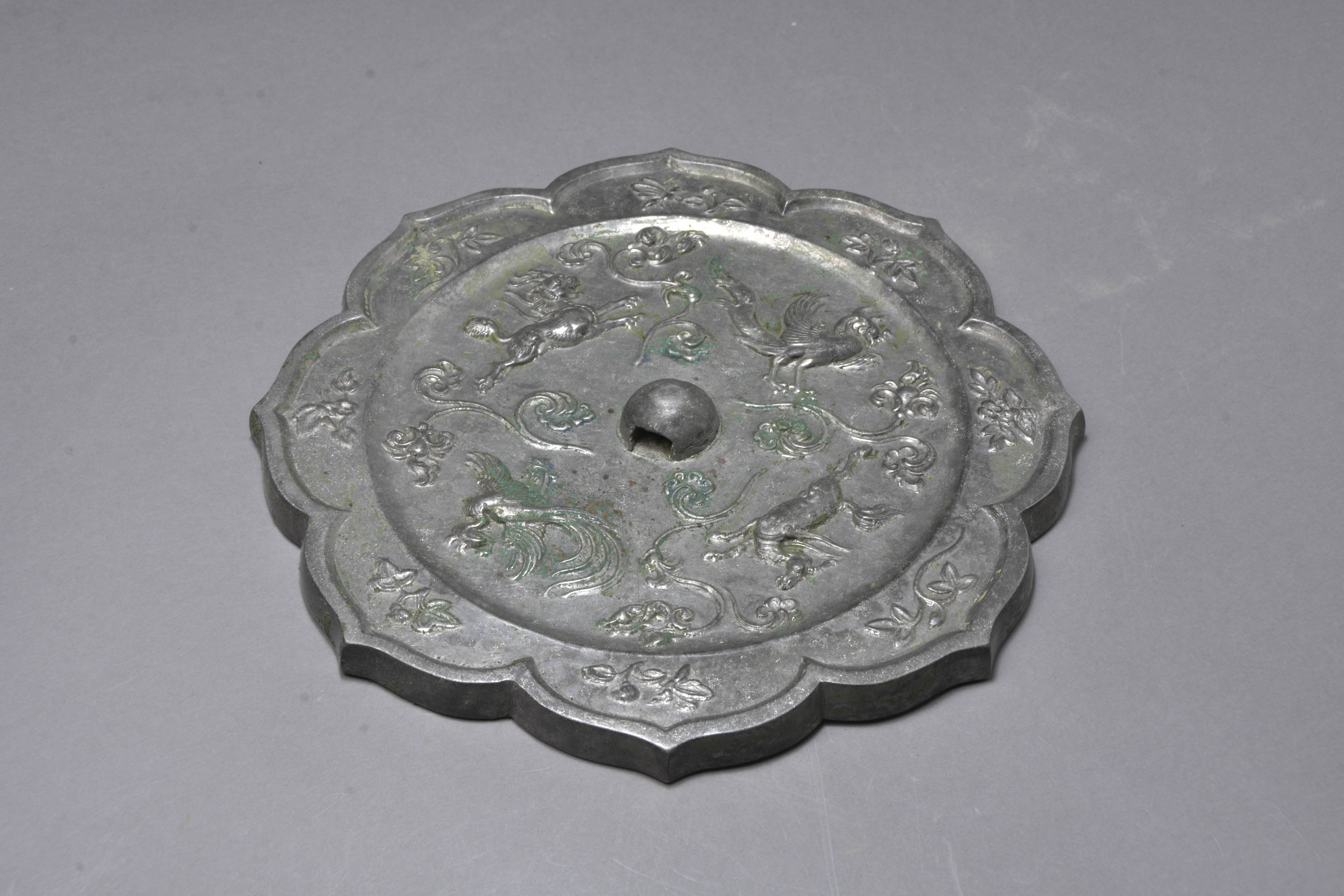 唐菱花形双兽双鸾鸟花枝纹铜镜