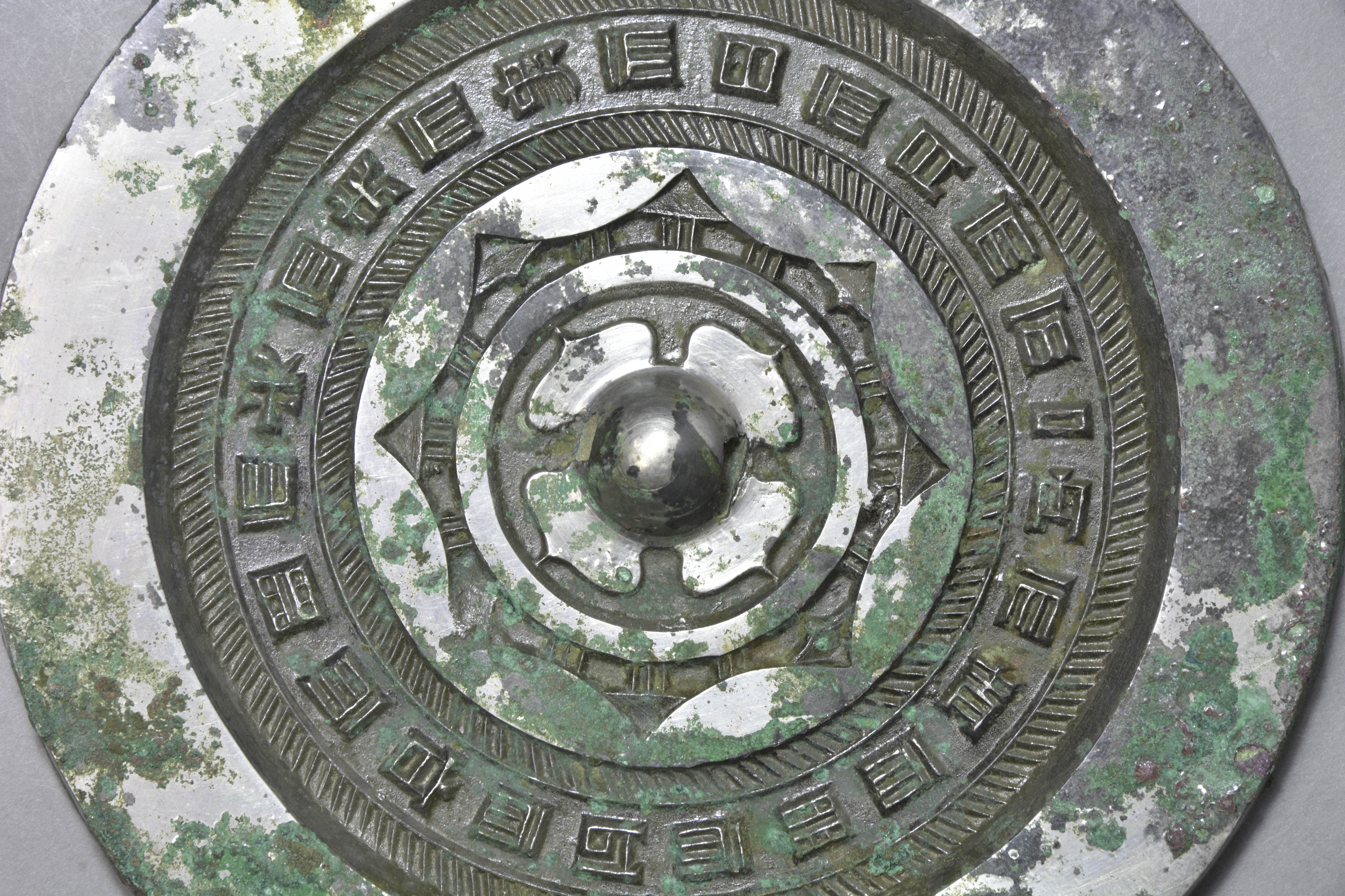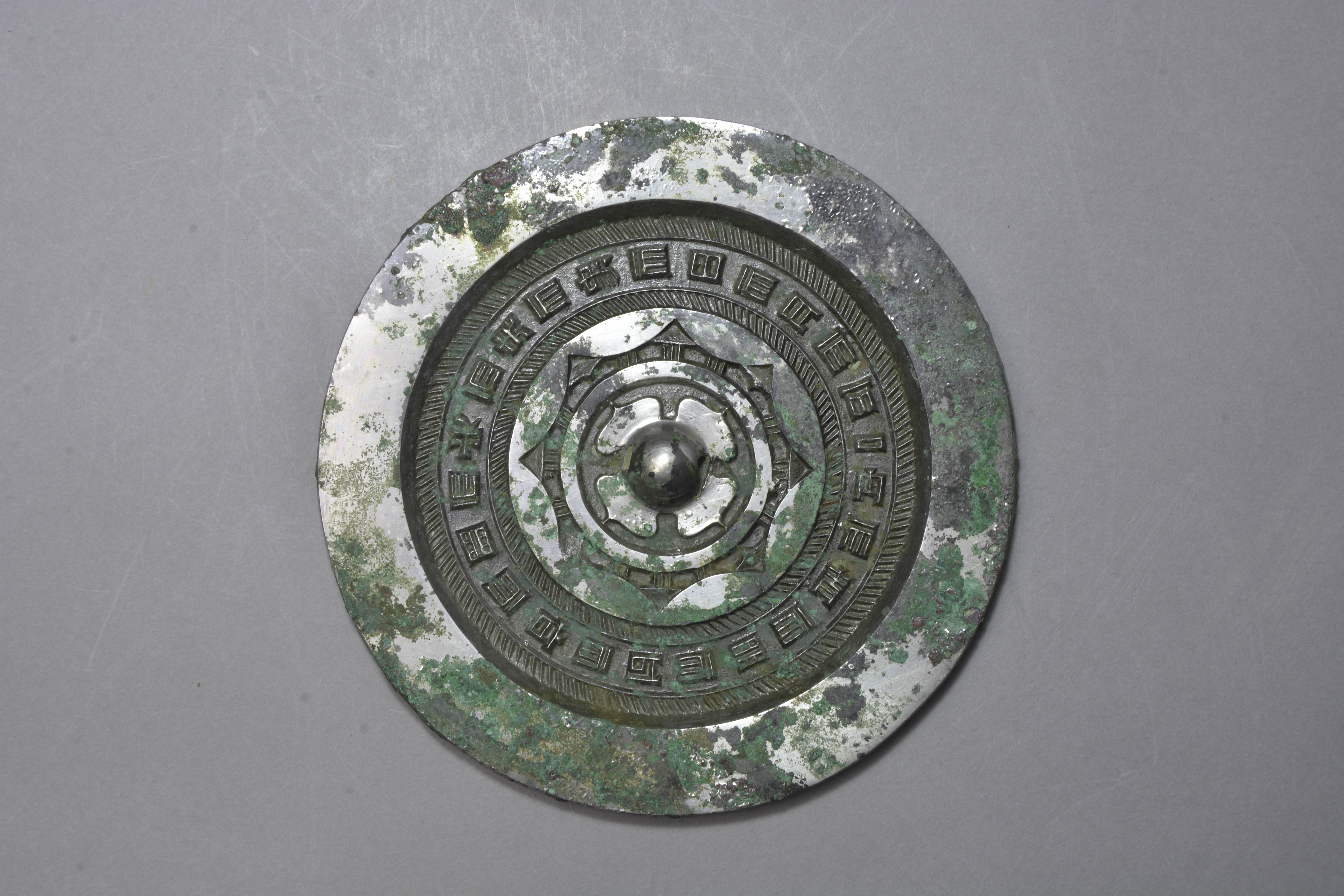 圆形,圆钮,柿蒂纹钮座。座外一周凸弦纹,再外一周内向八连弧纹蒂,弧间有山字纹。外区两周短斜线纹,其间有方正隶书铭文“内而青而明而以而昭而明而光而夬而象而日而月而不”。宽素面。