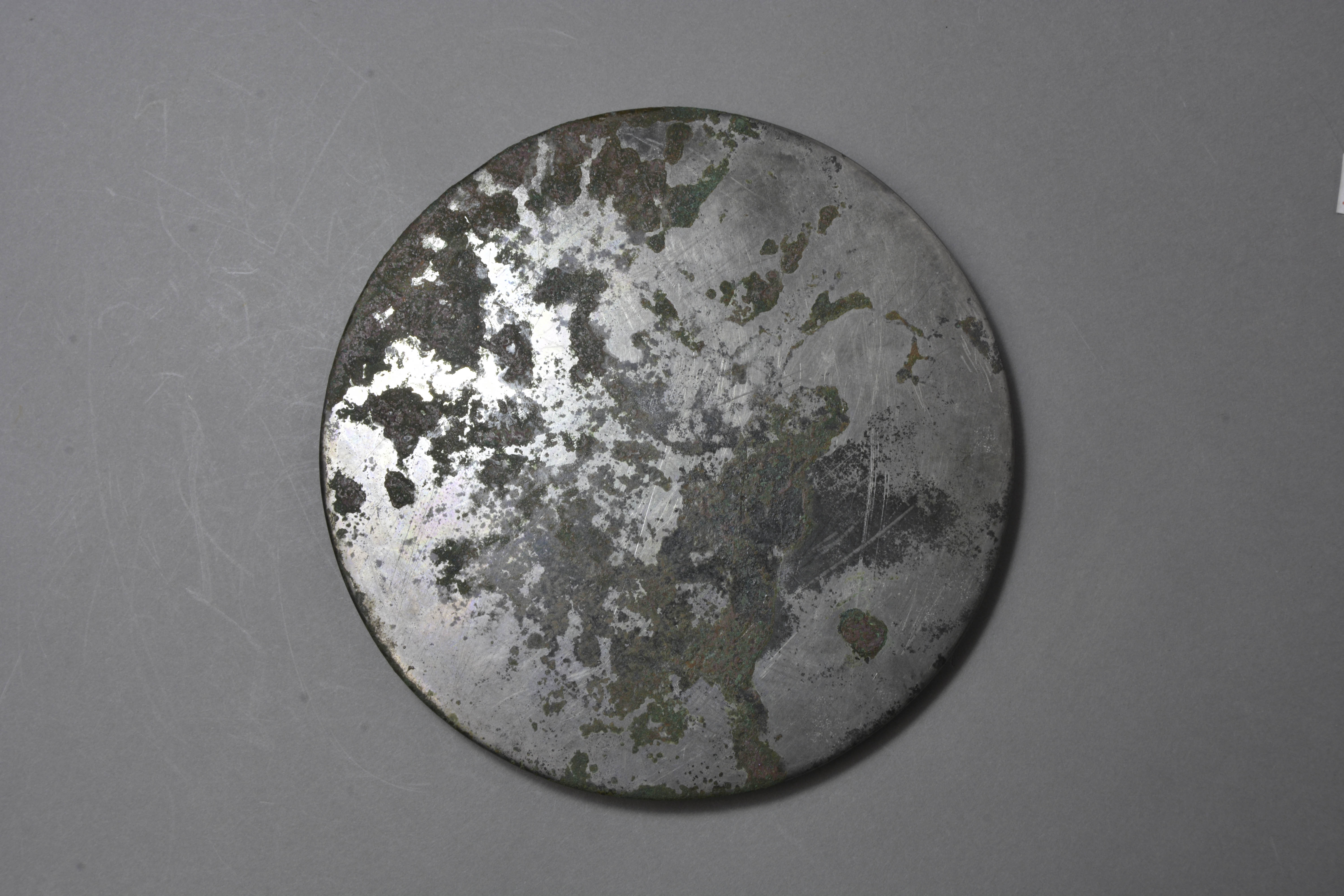 兽钮,钮外由一条凸弦纹分为两区,内区饰海兽葡萄纹,外区饰瑞禽葡萄纹,镜面微凸。