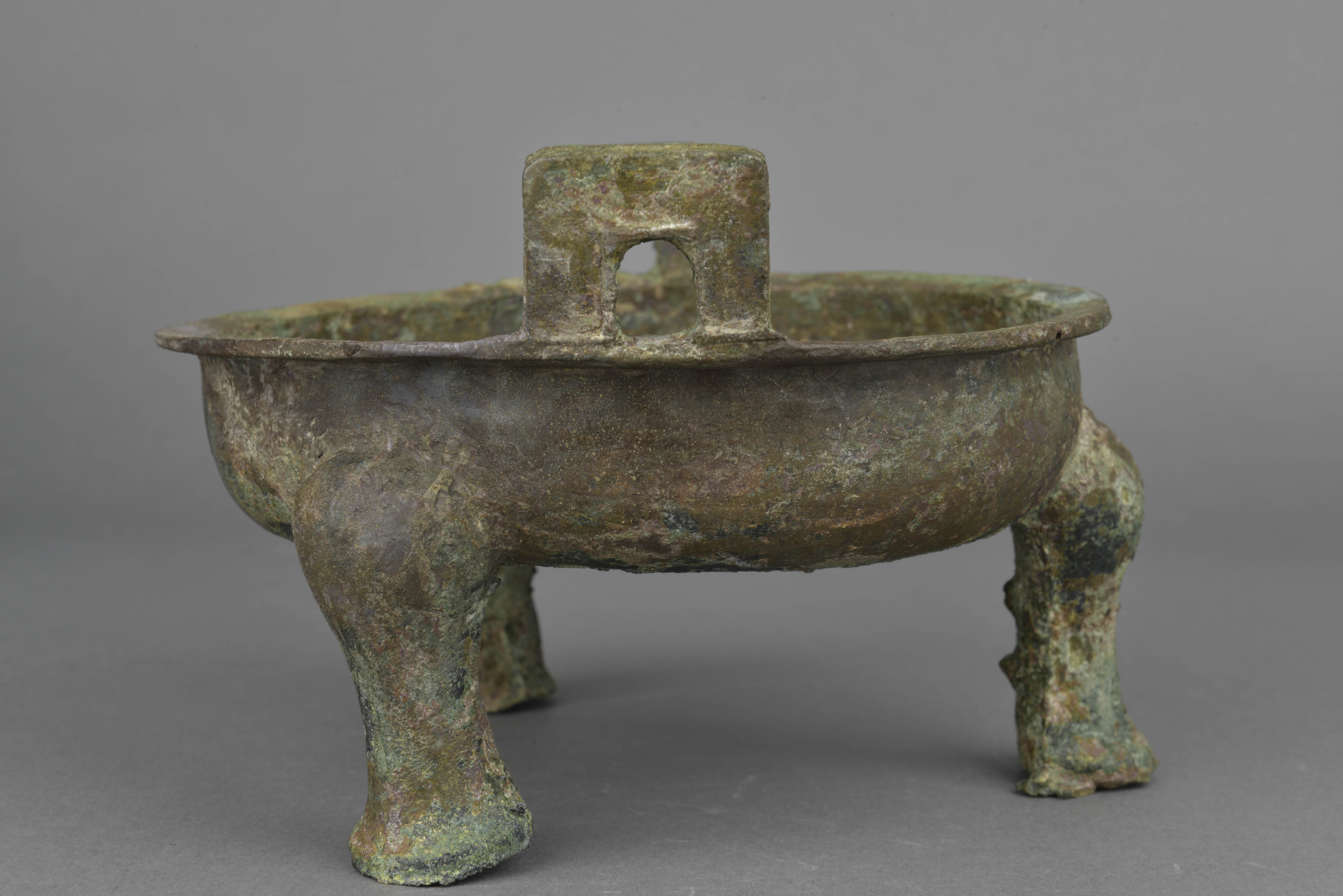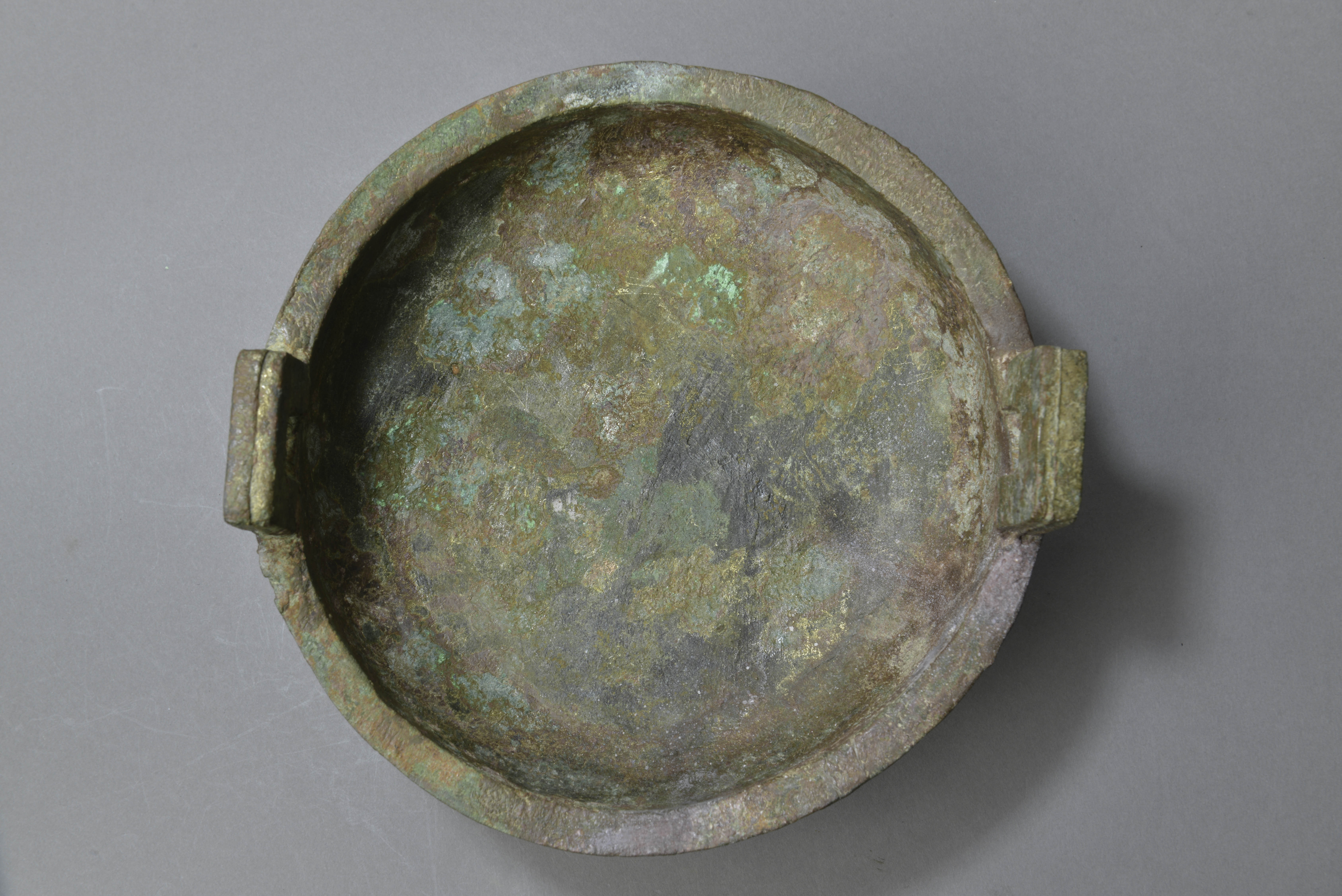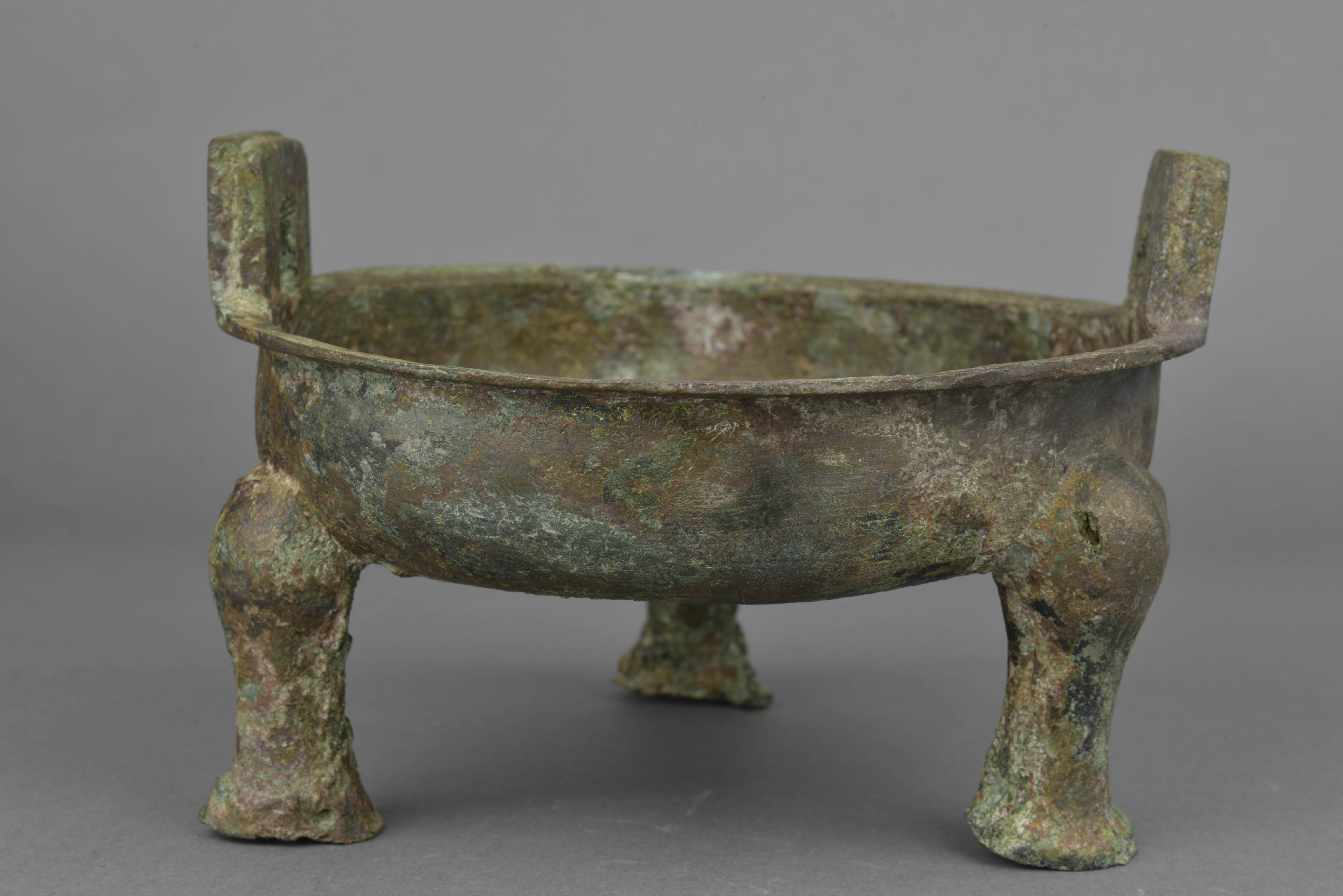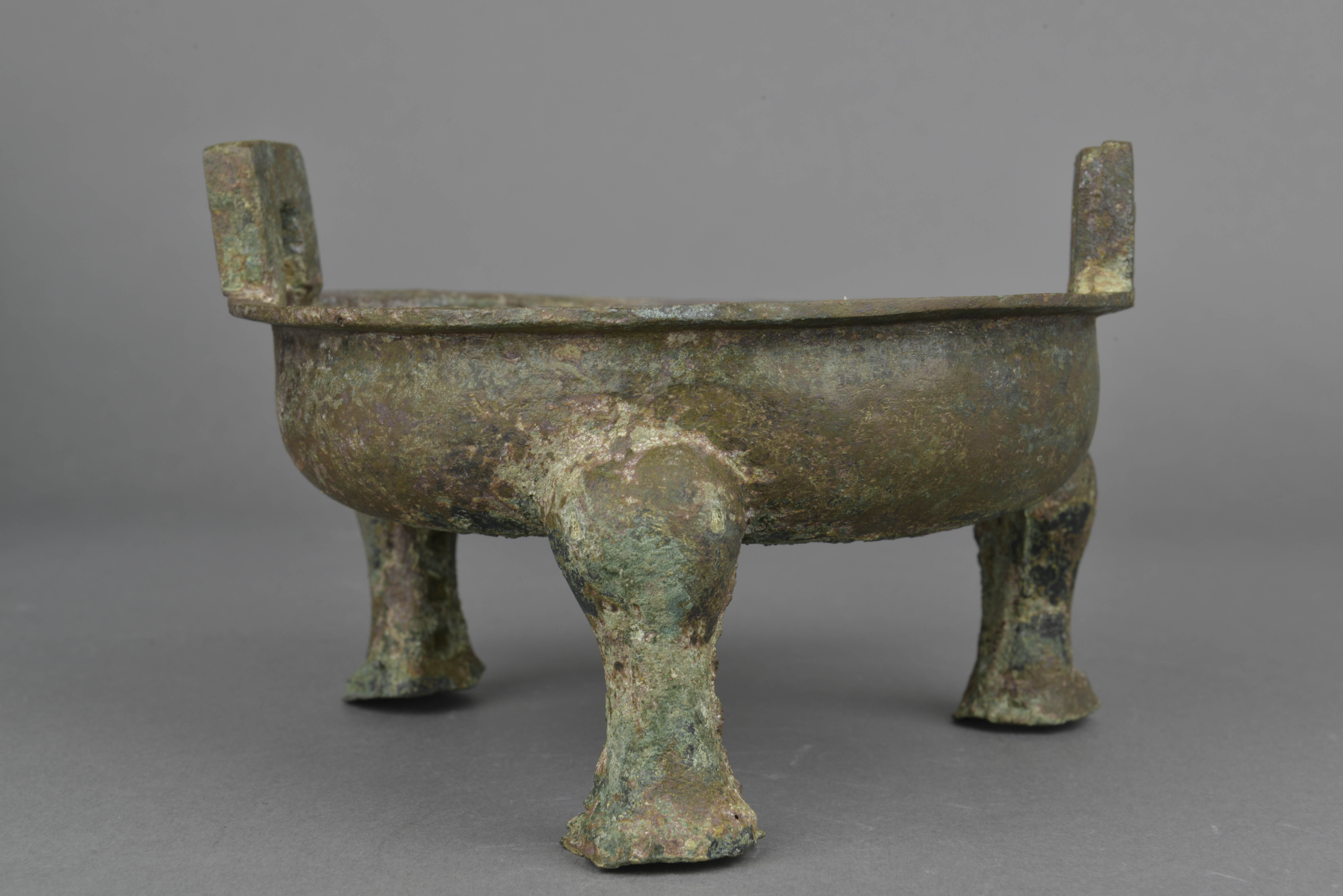 窄平沿上作对称双立耳,浅腹,平底,三蹄足。