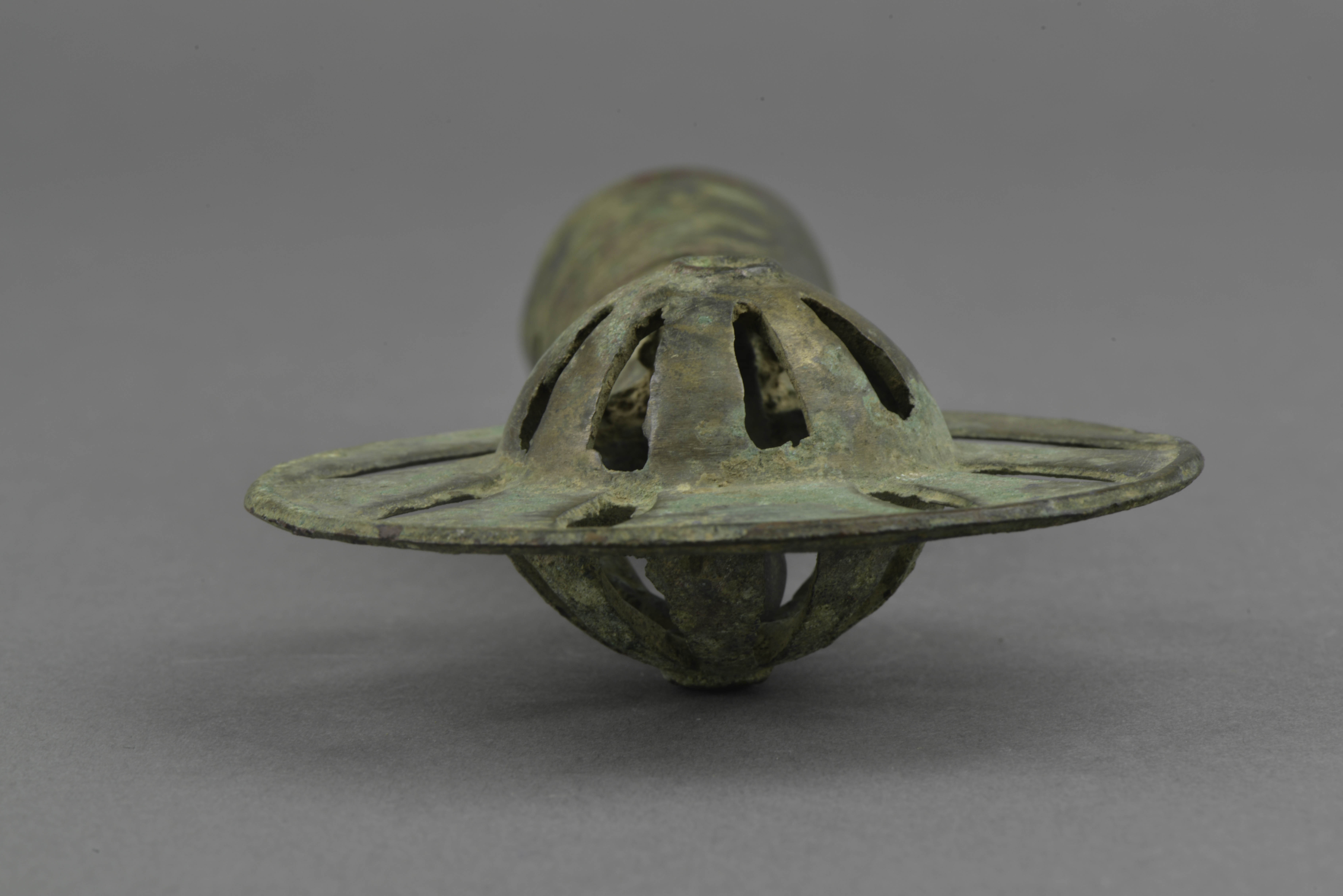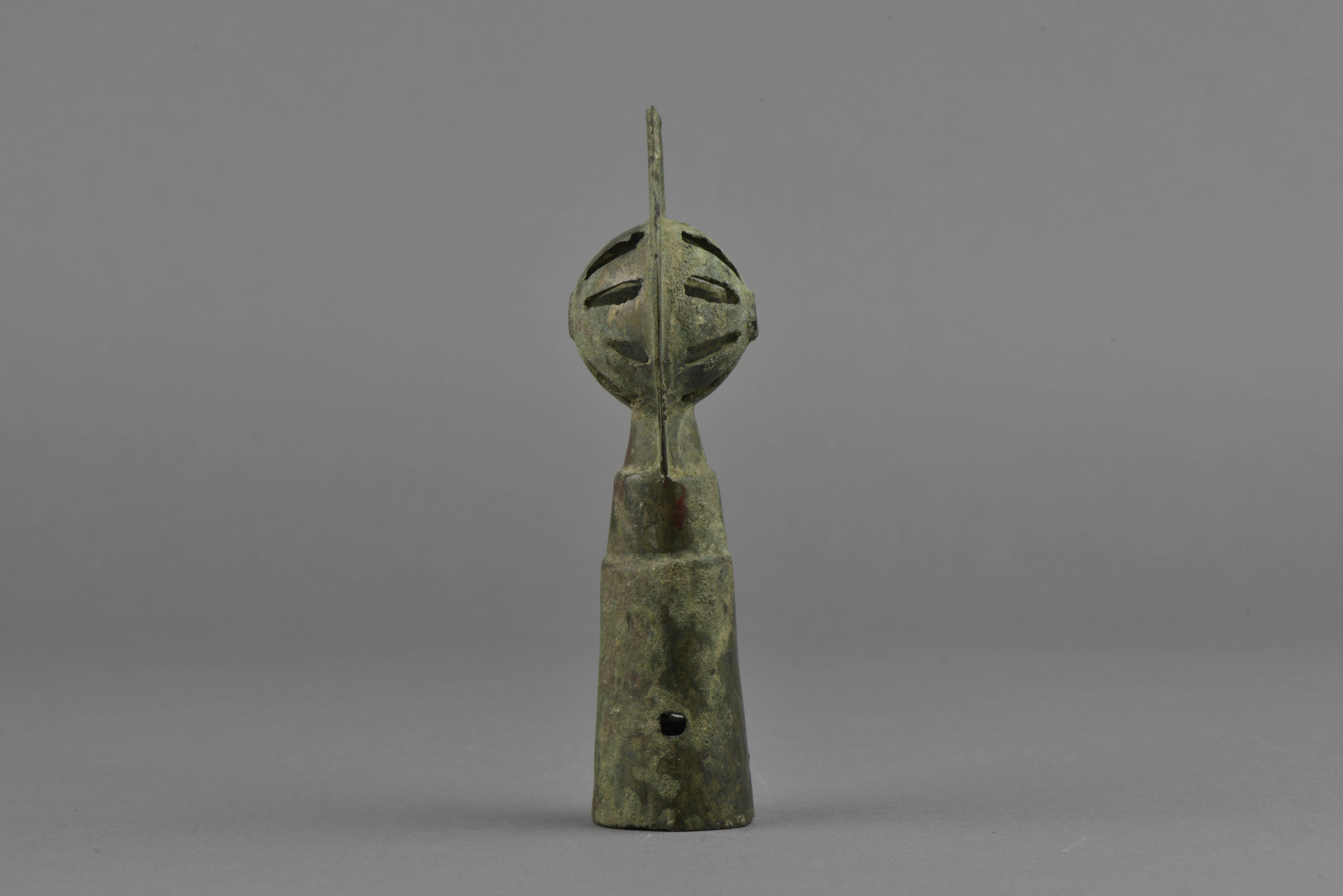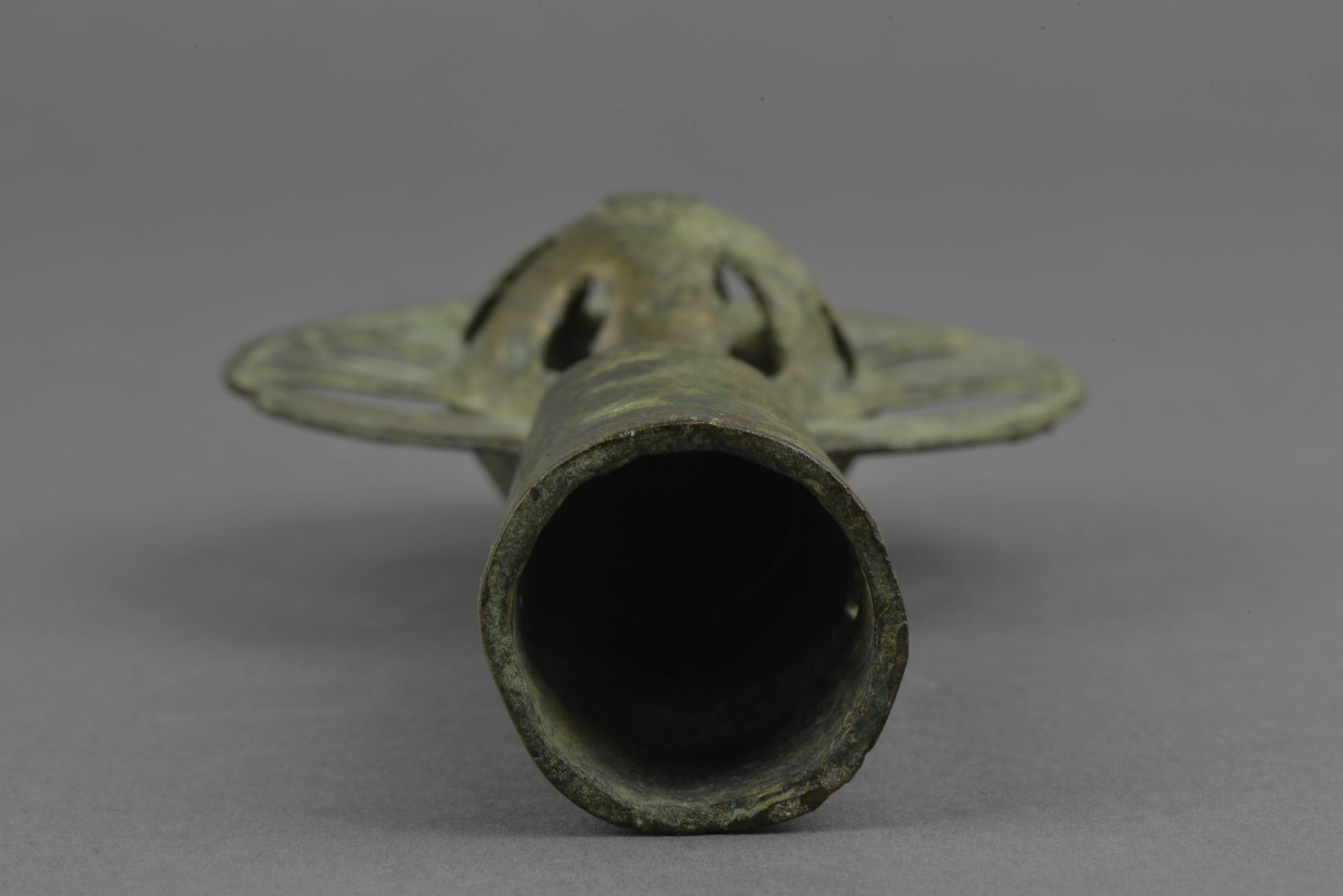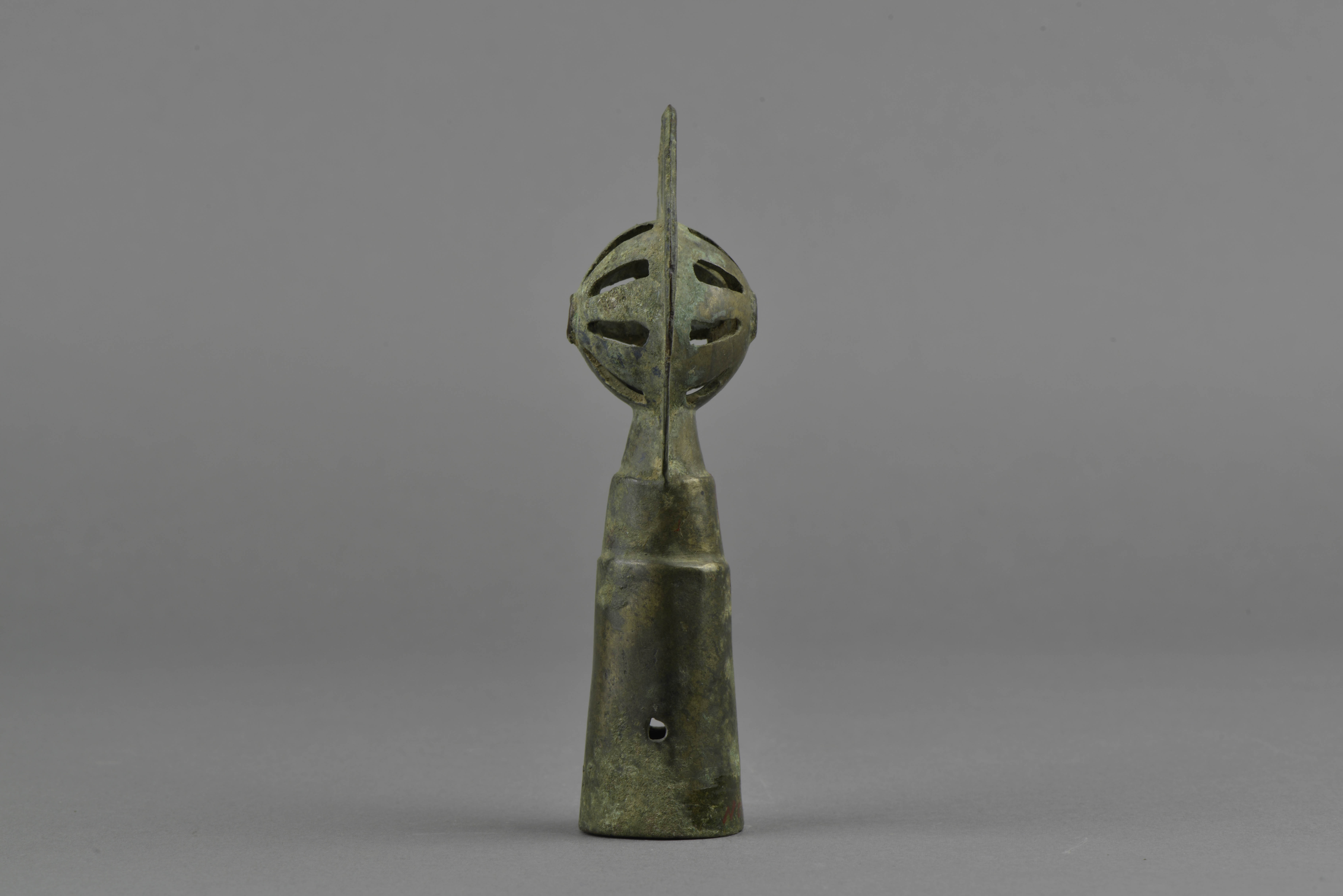 管状形銎座,宽扁形铃体,内含铜丸。銎座两侧有对应圆孔,铃部两面正中有一圆孔及三角形辐射状镂空。