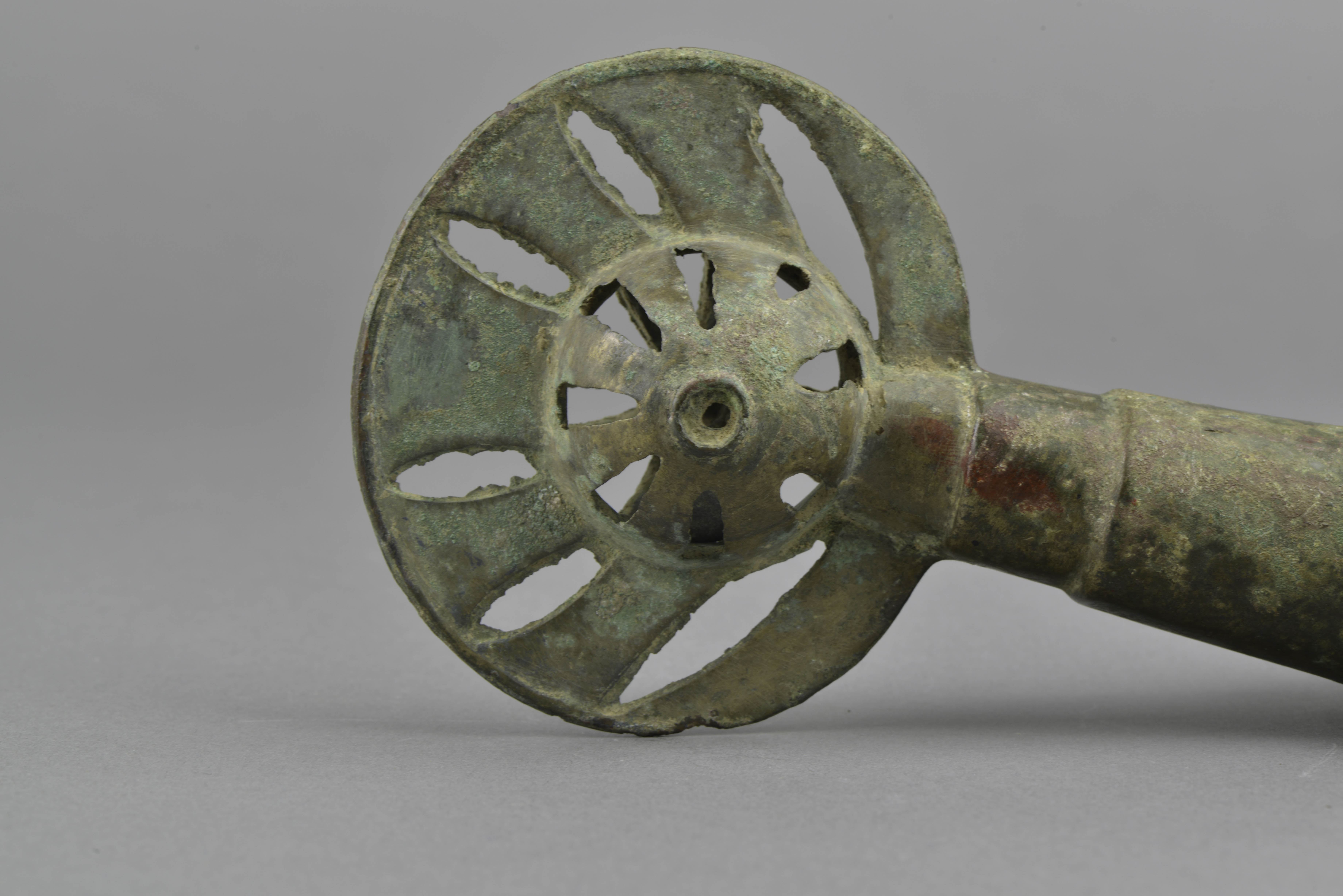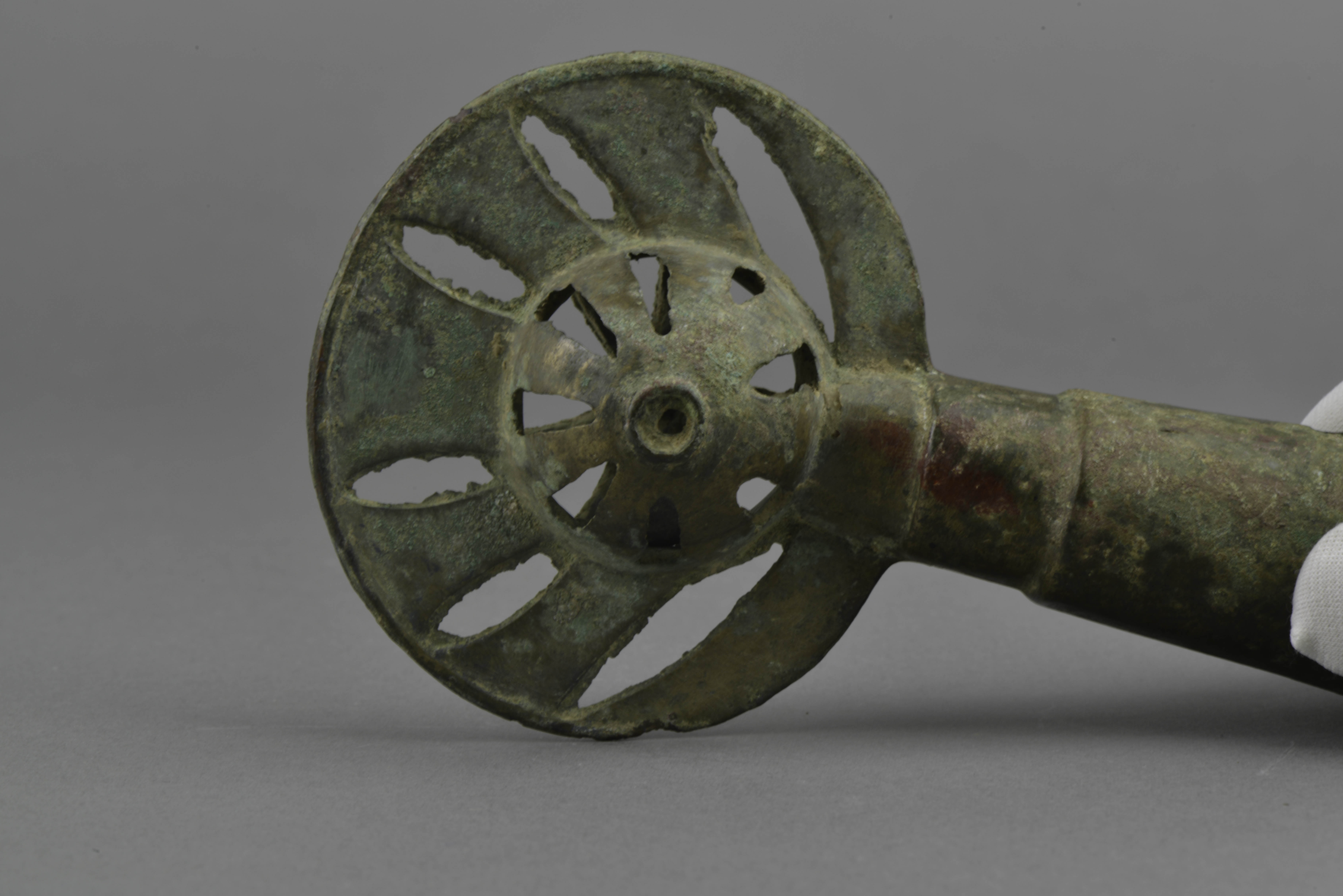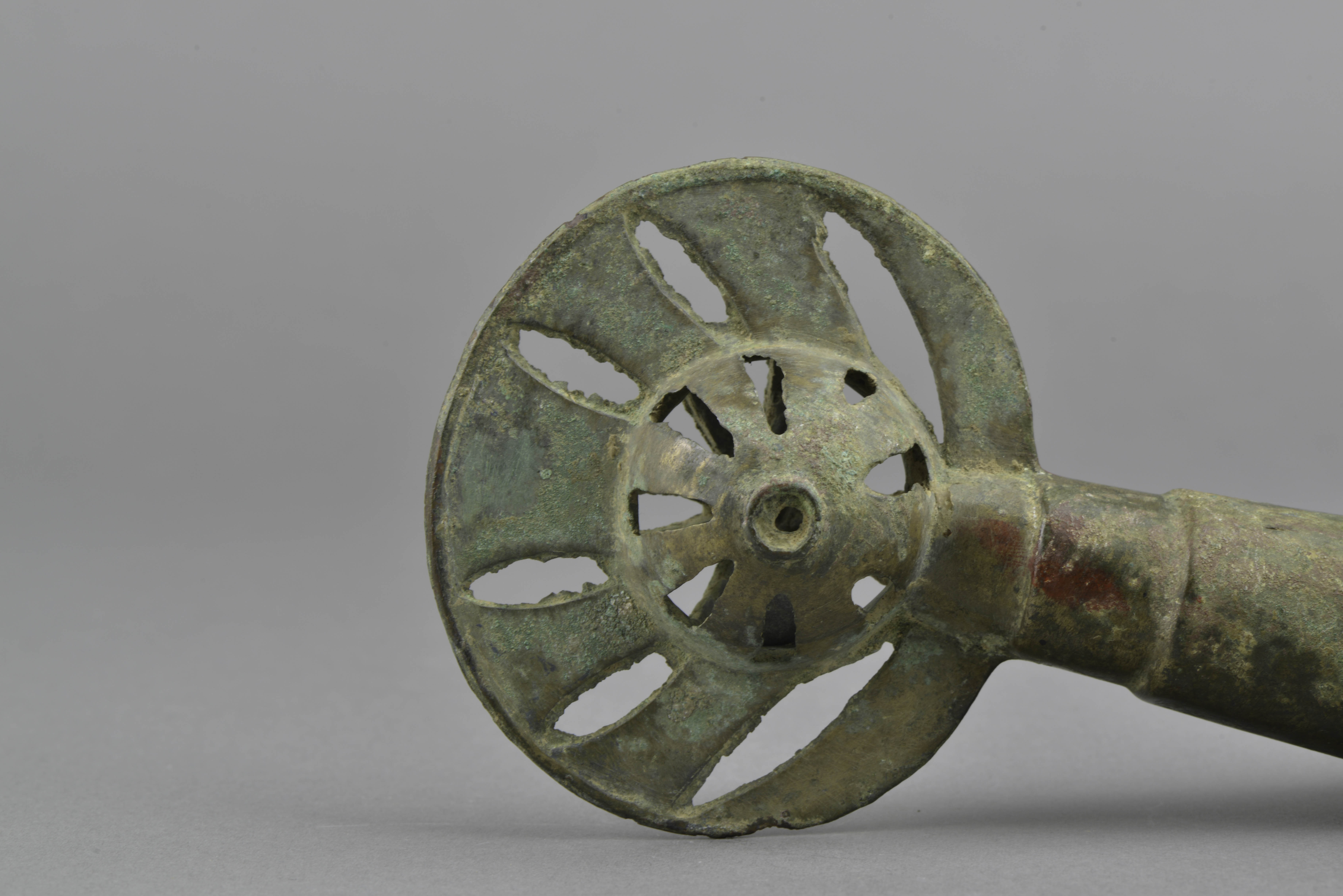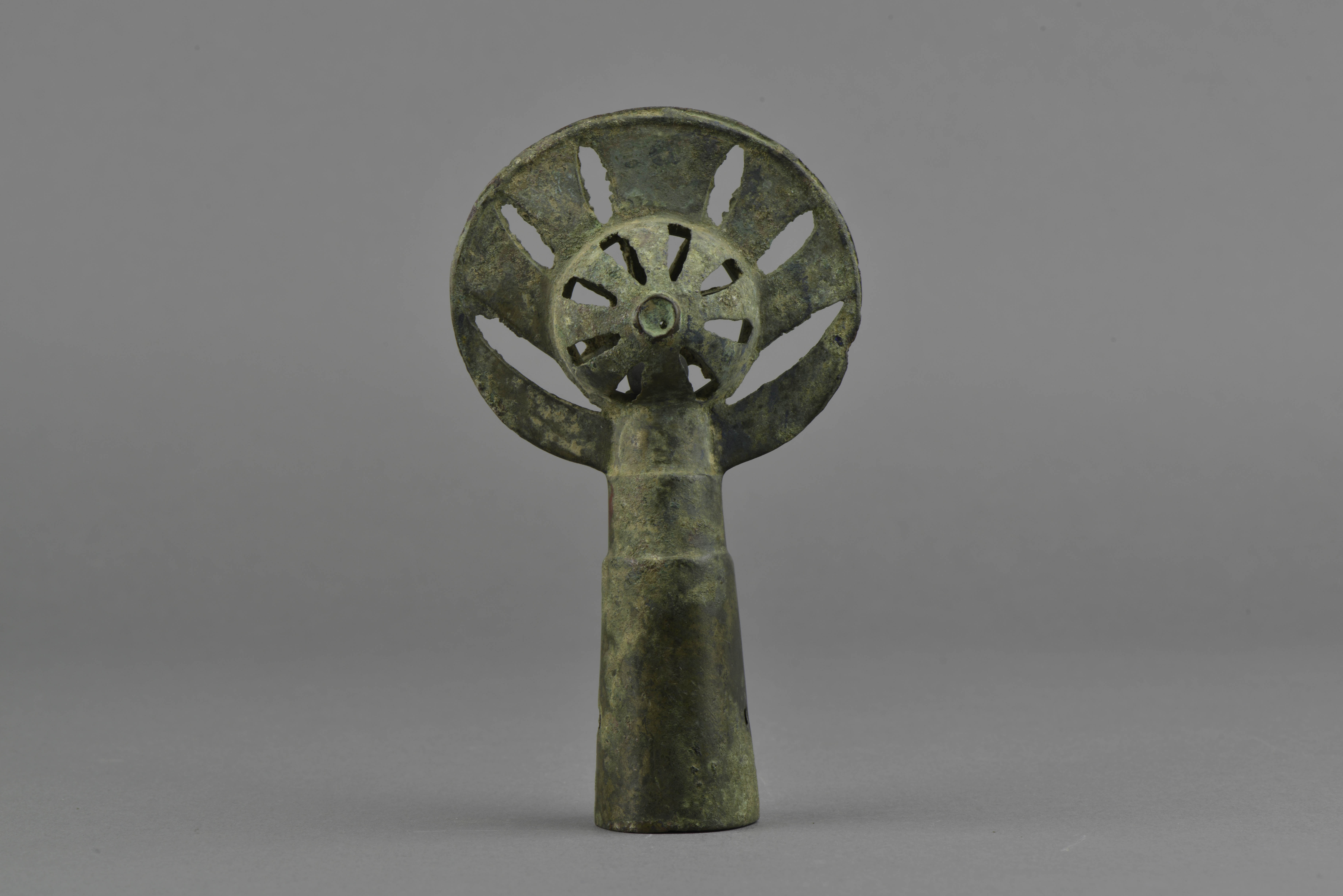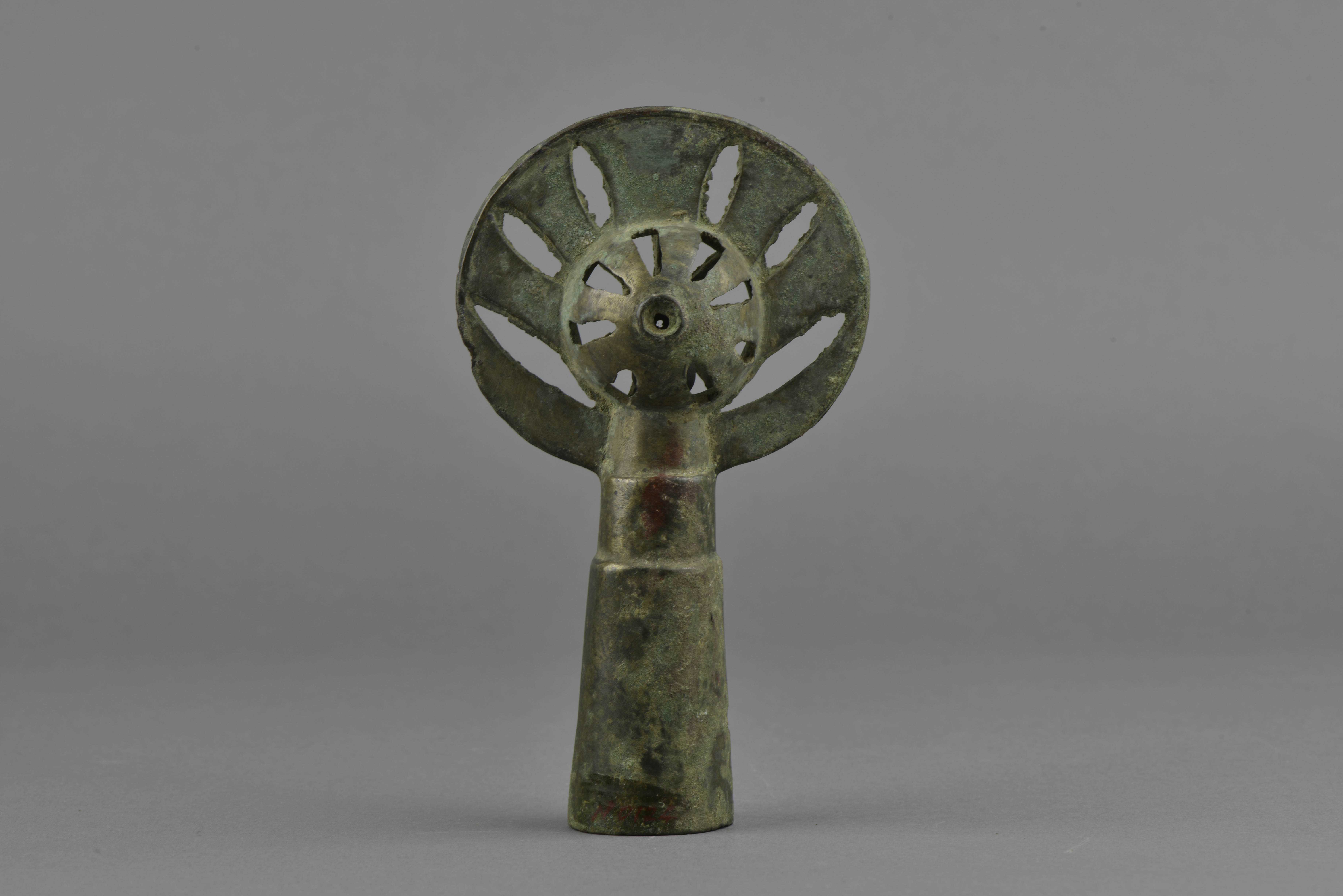 管状形銎座,宽扁形铃体,内含铜丸。銎座两侧有对应圆孔,铃部两面正中有一圆孔及三角形辐射状镂空。