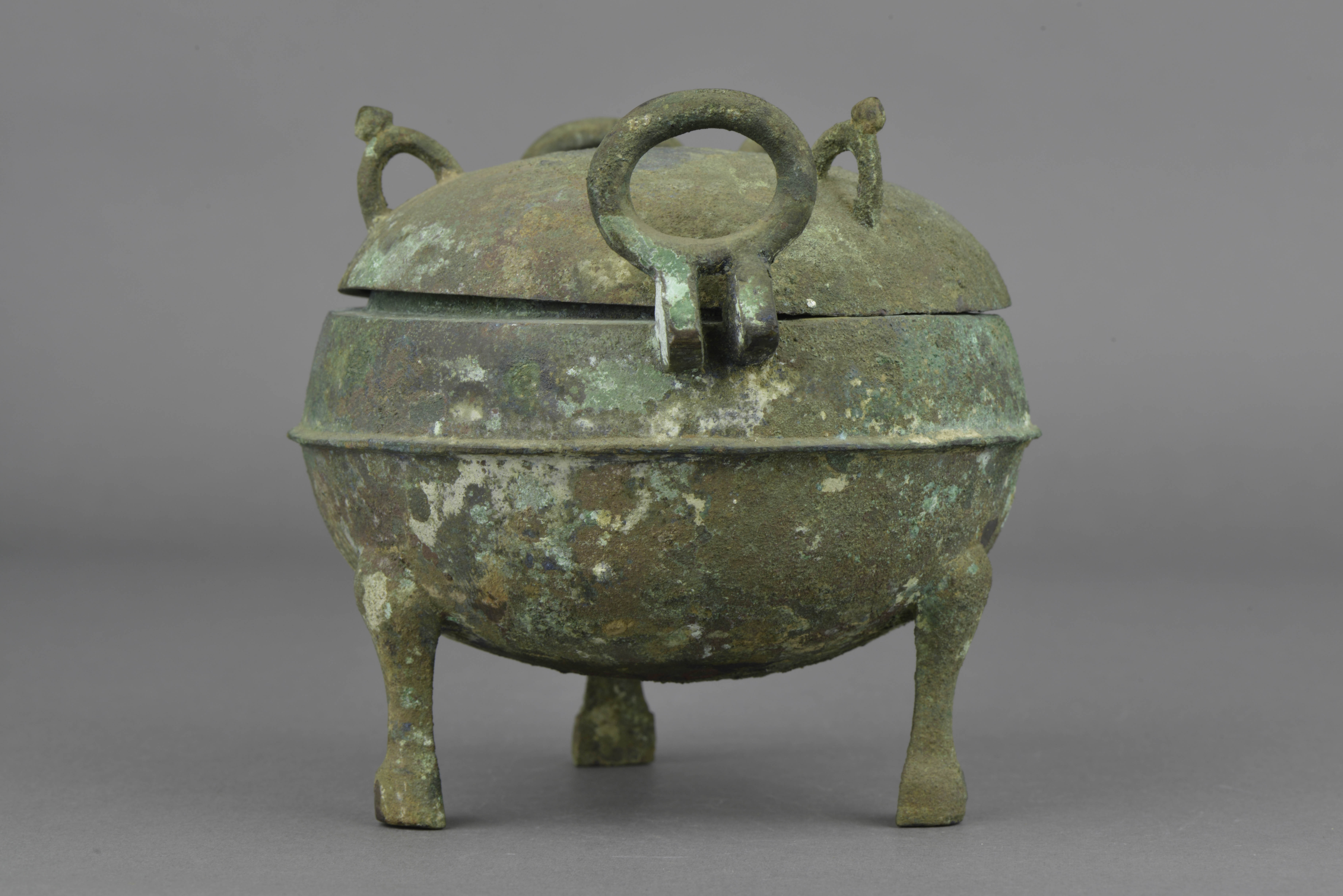 半球形盖,盖上均匀分布三环,环上起乳。子母口,两环形附耳,鼓腹,圜底。腹中部饰弦纹一周,三蹄足。
