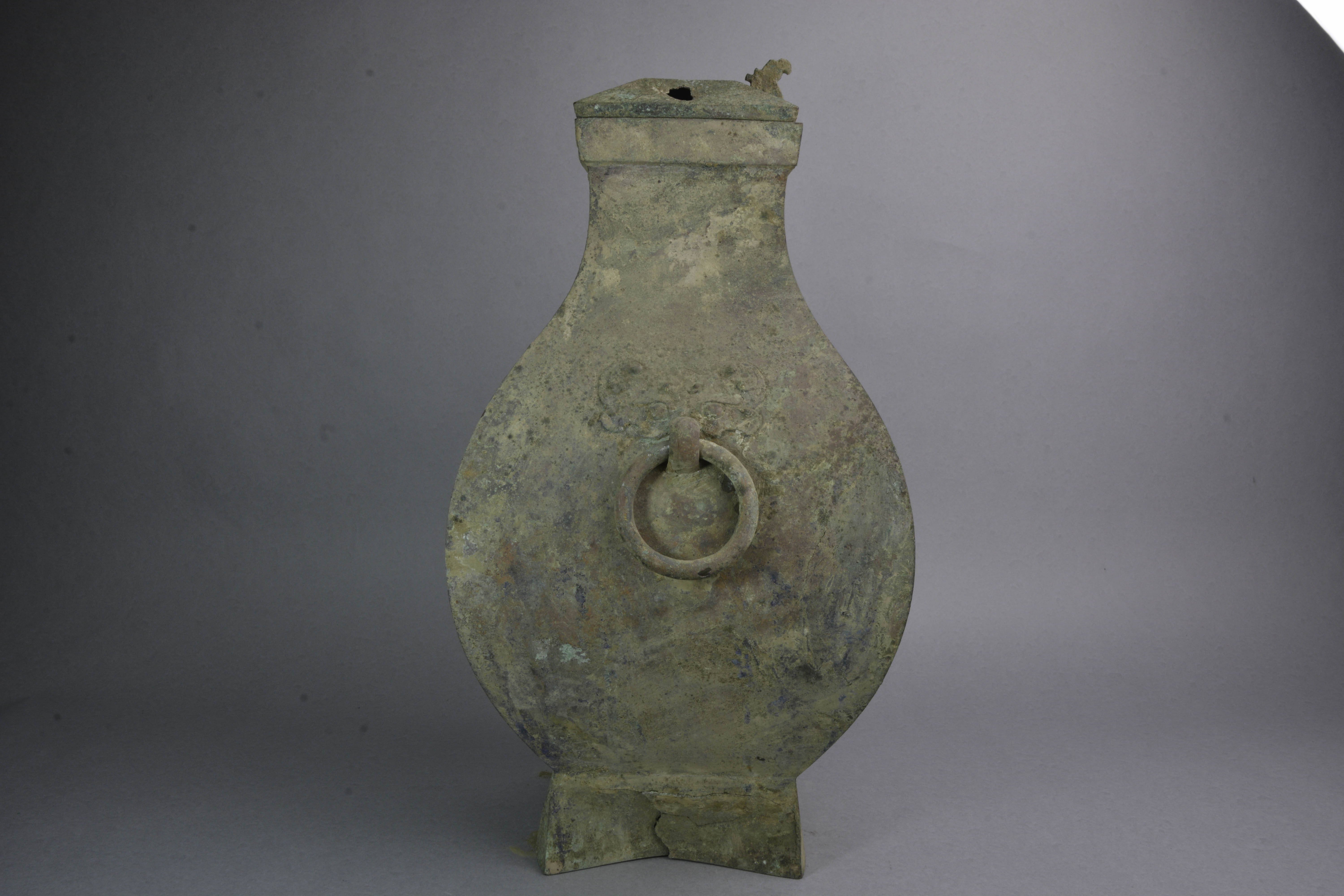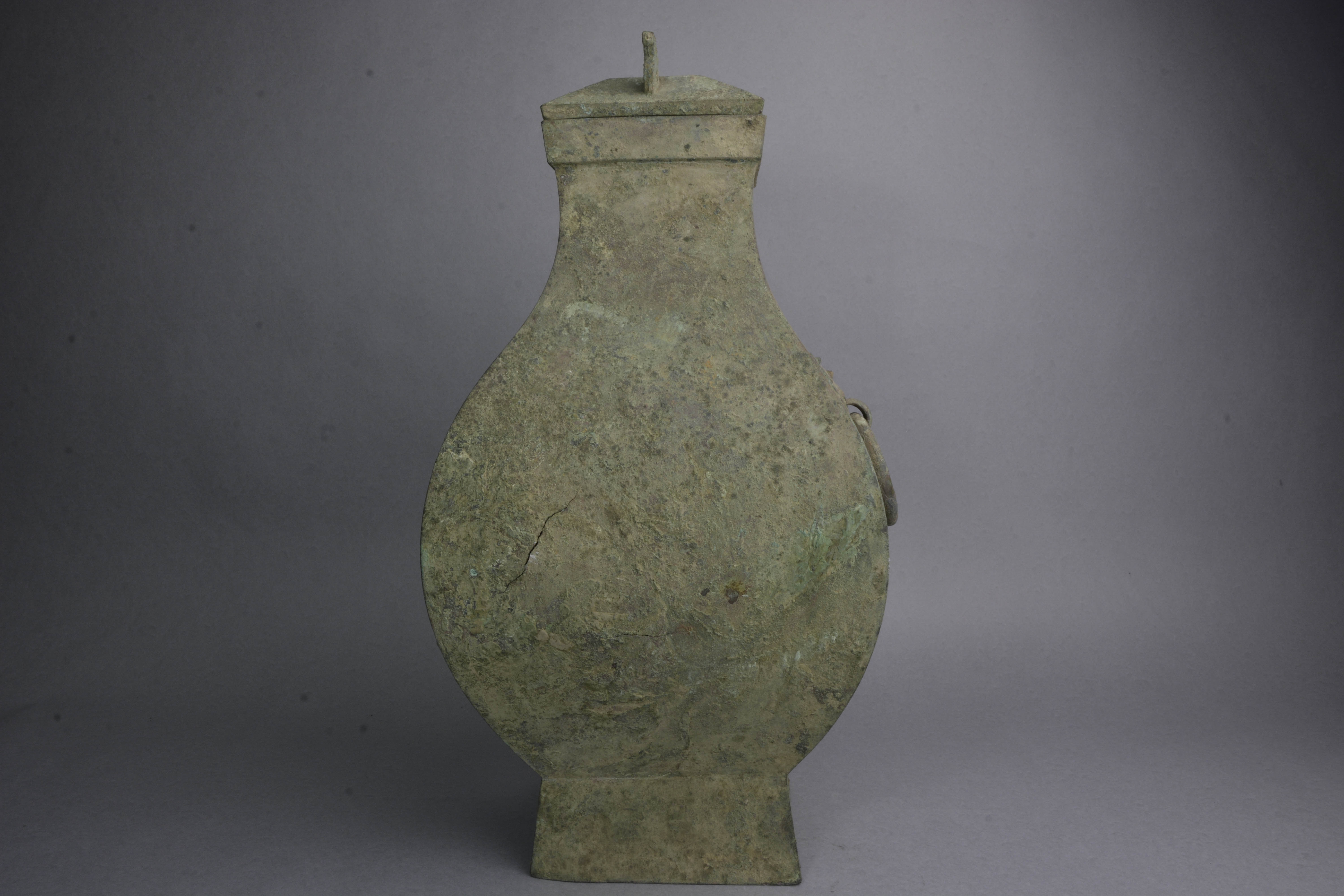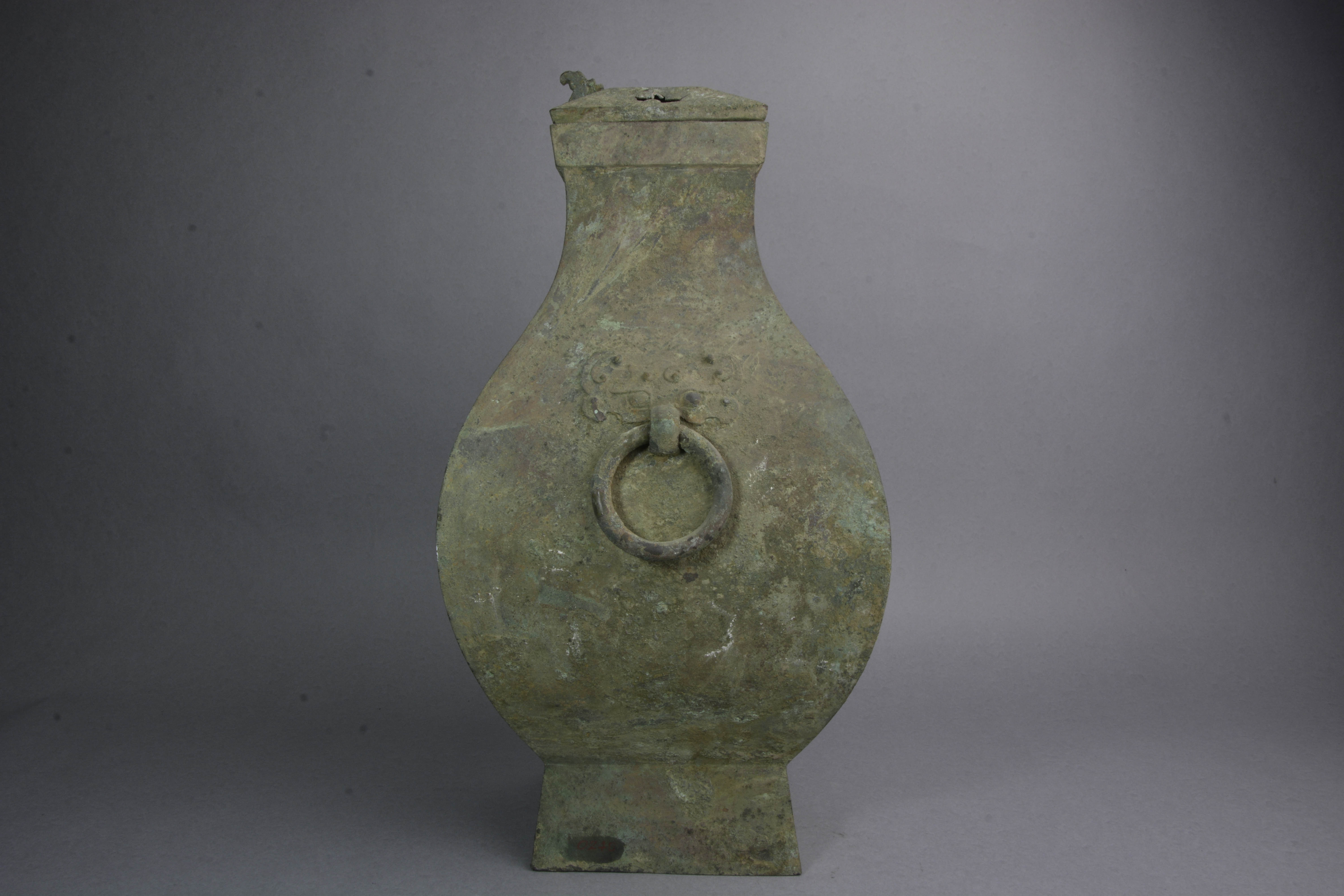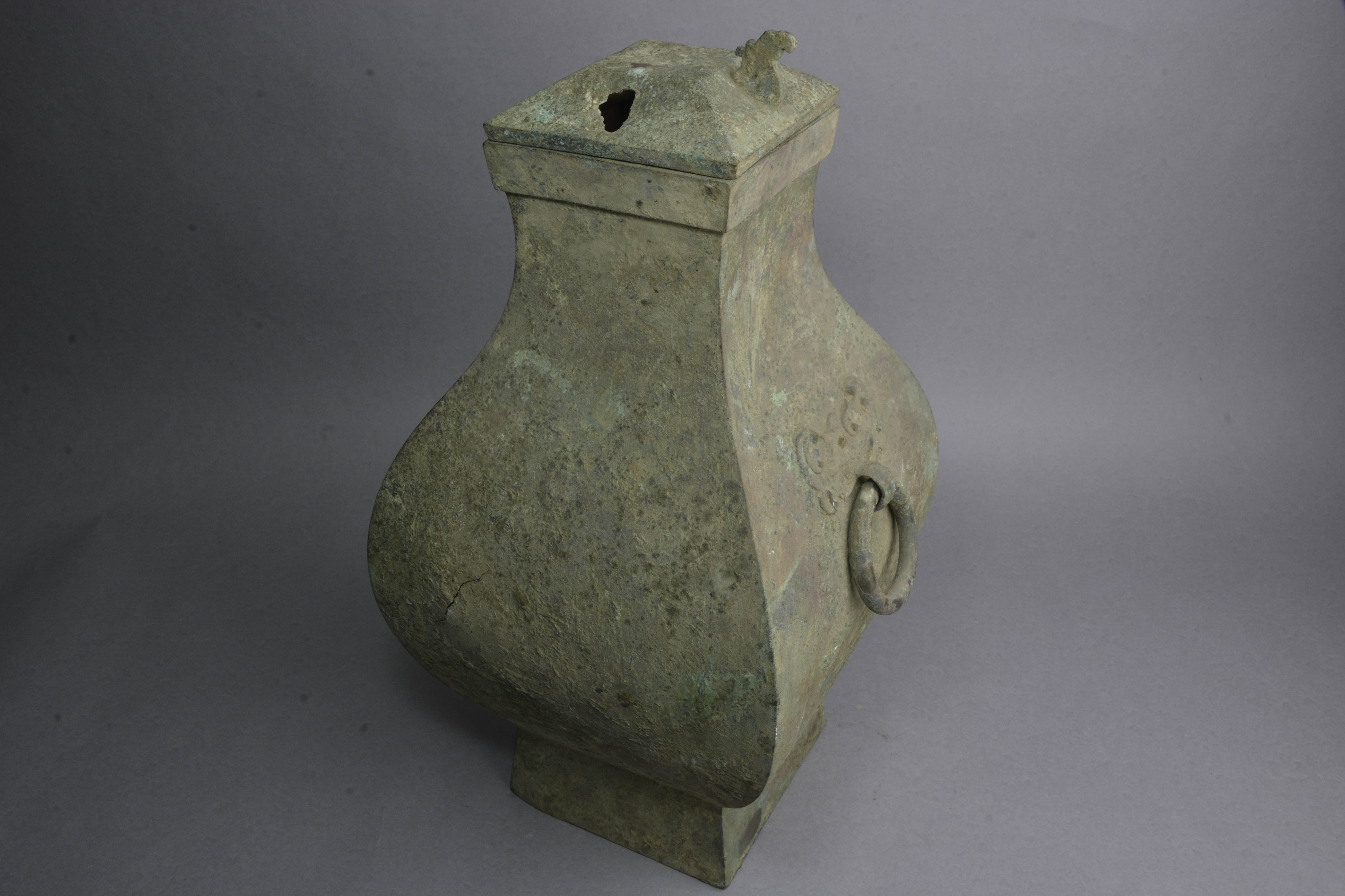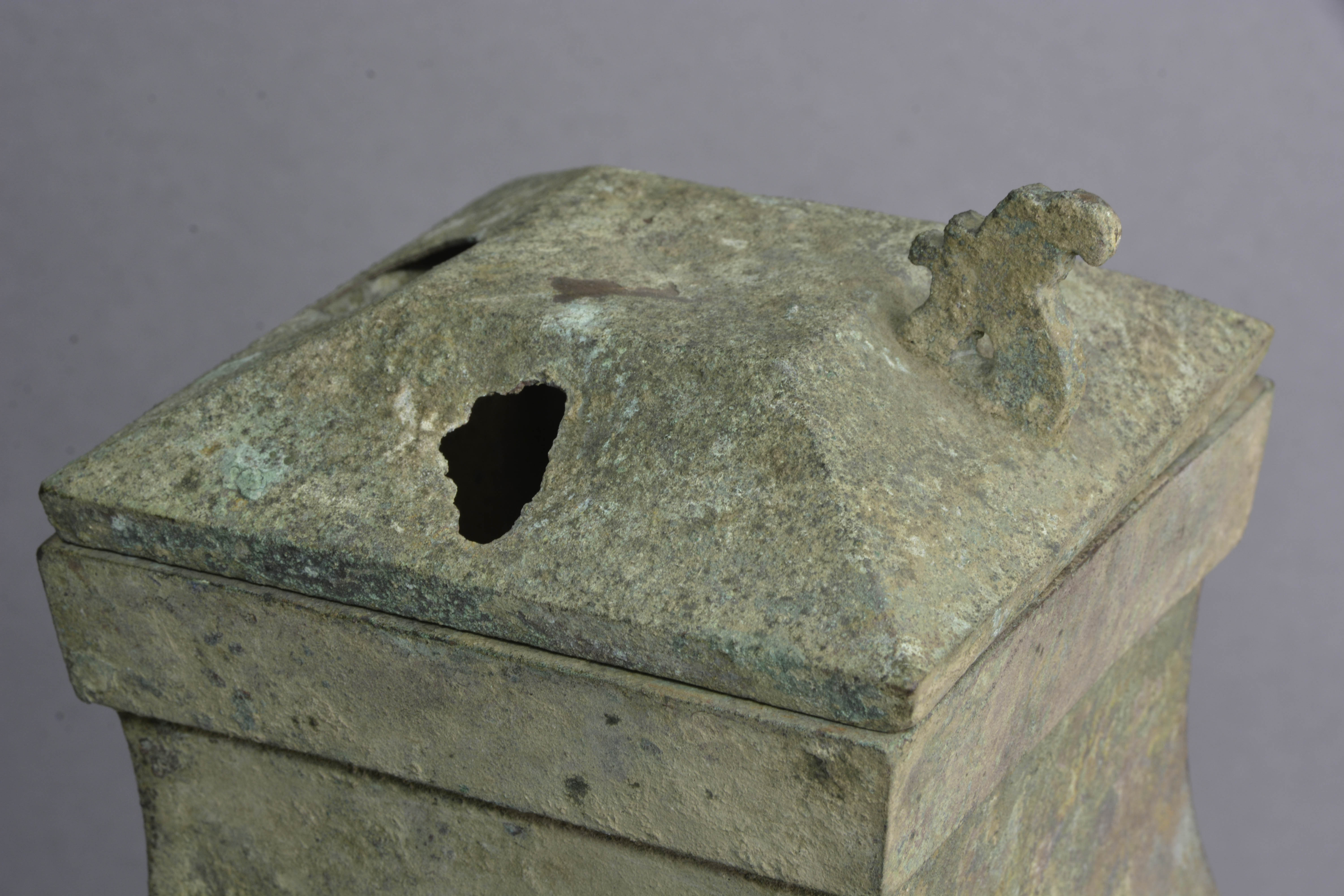 子母口,窄平沿,方唇,束颈,鼓腹,腹中部有对称铺首衔环,平底,方圈足。有盖,盝顶,上有四个兽钮。