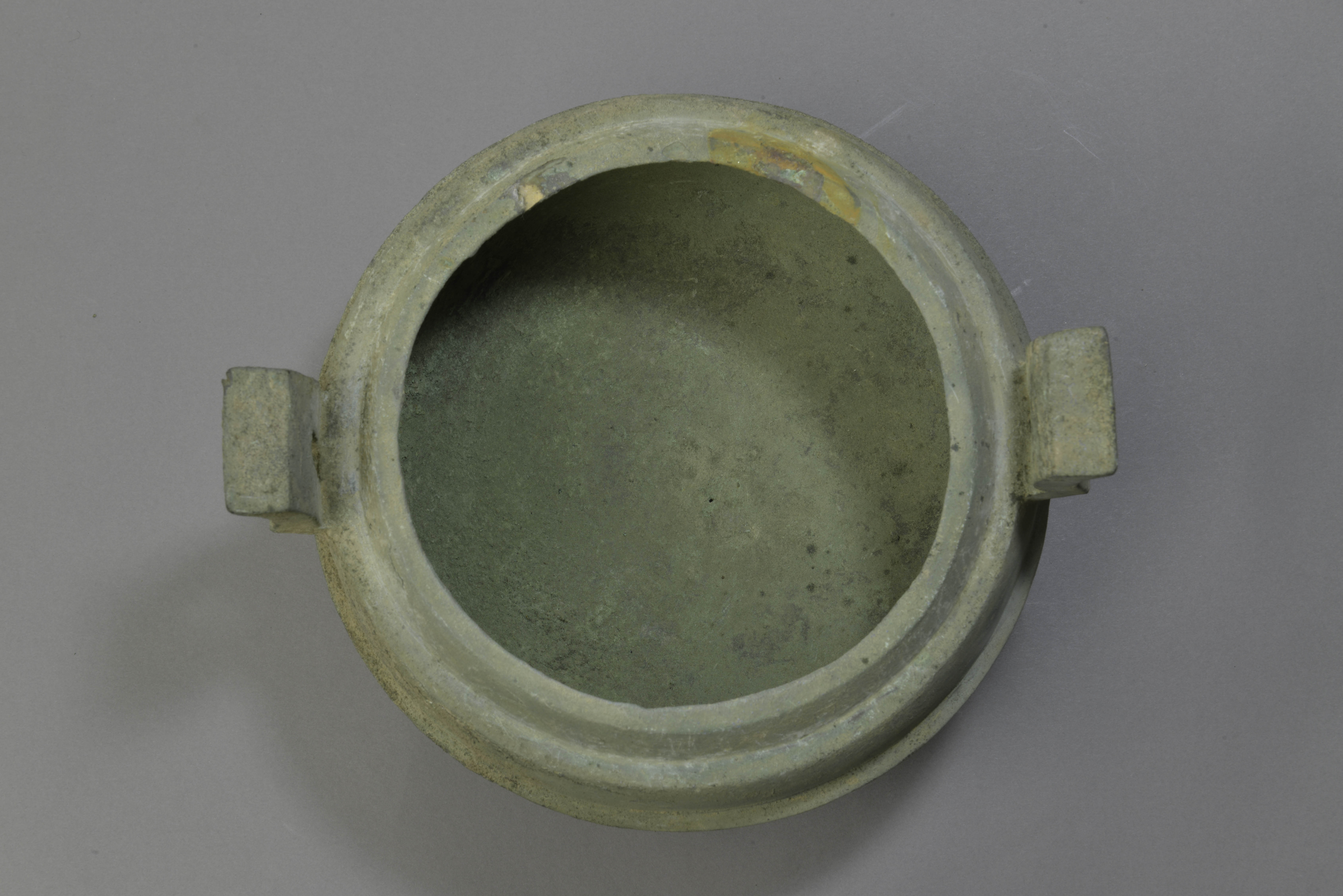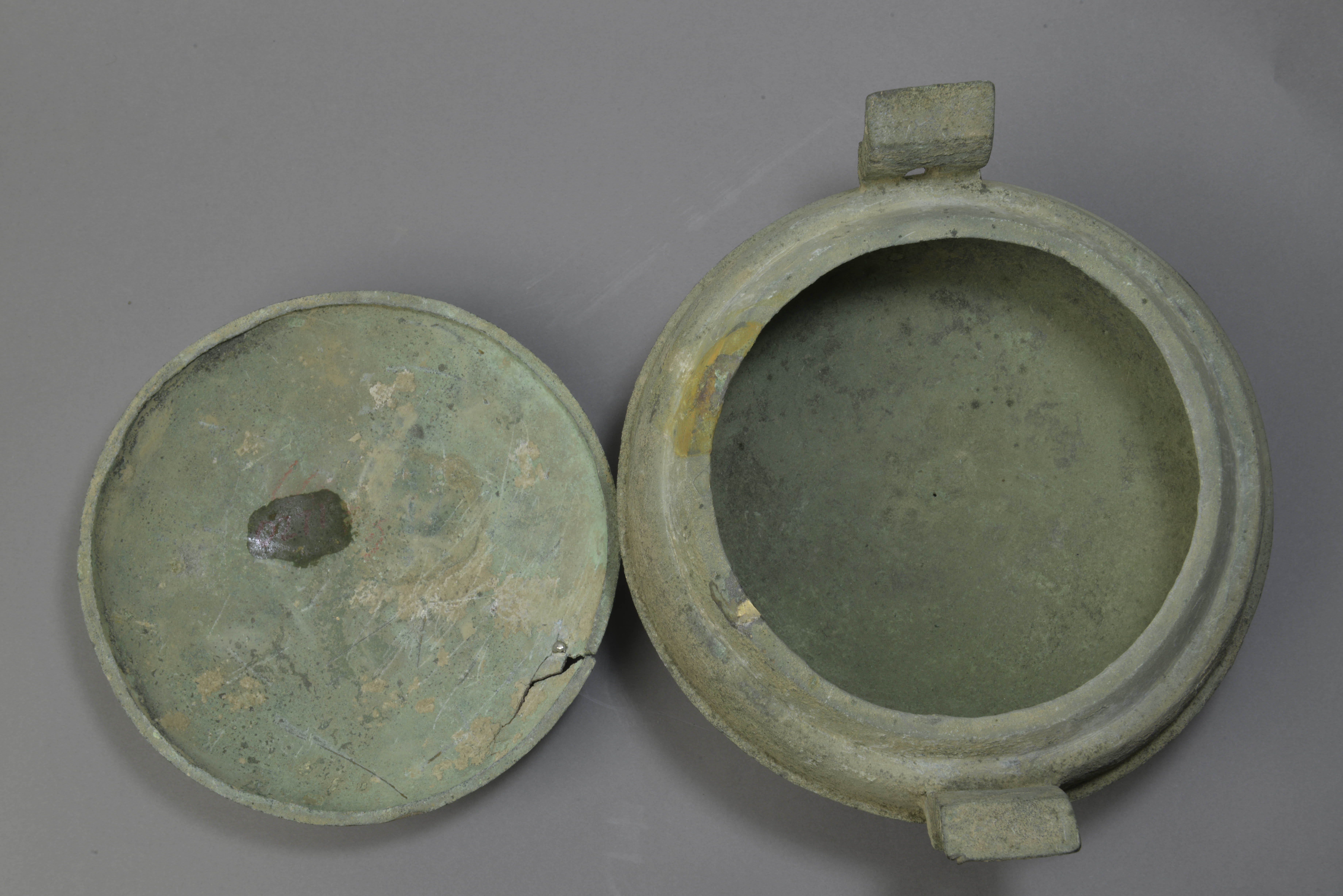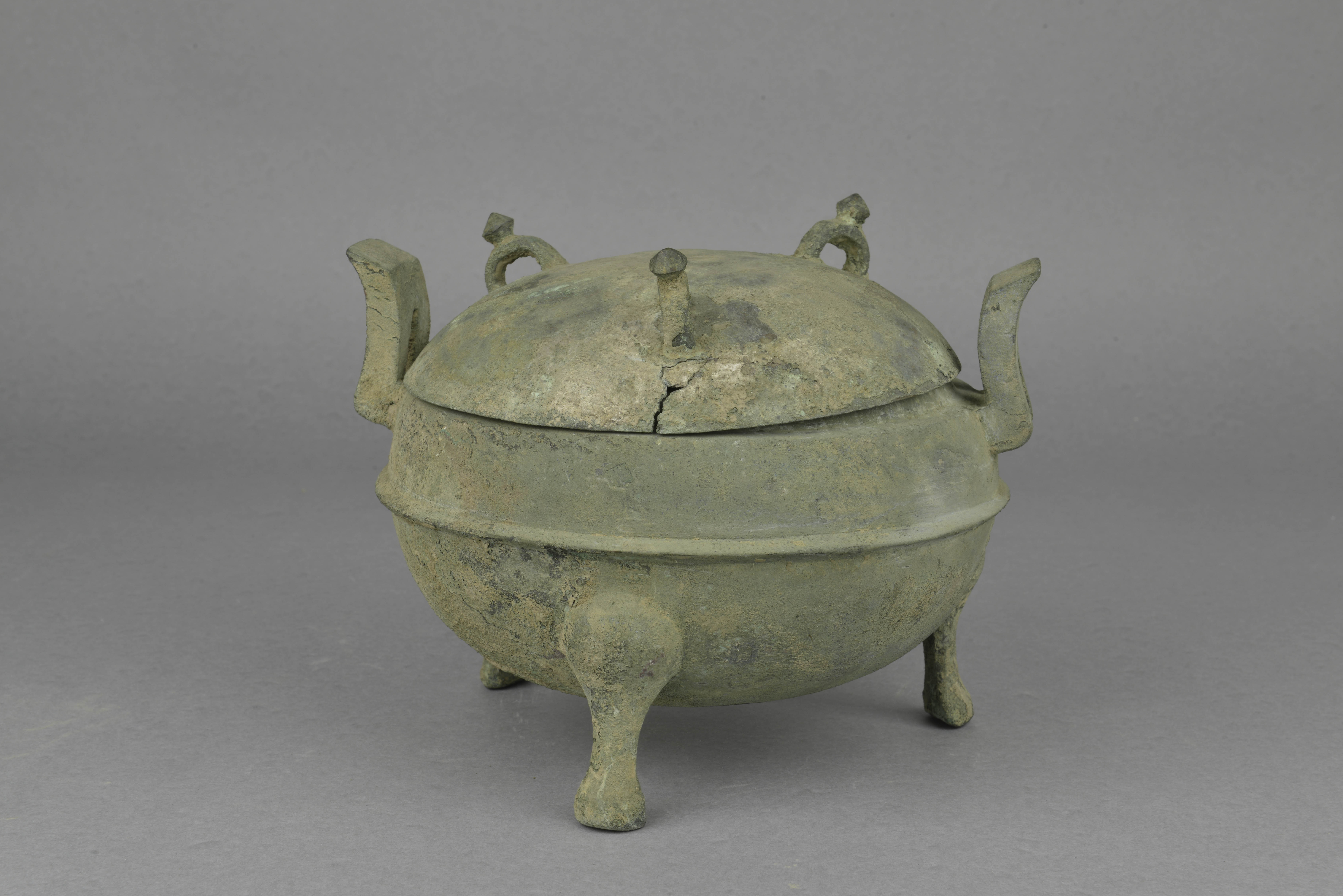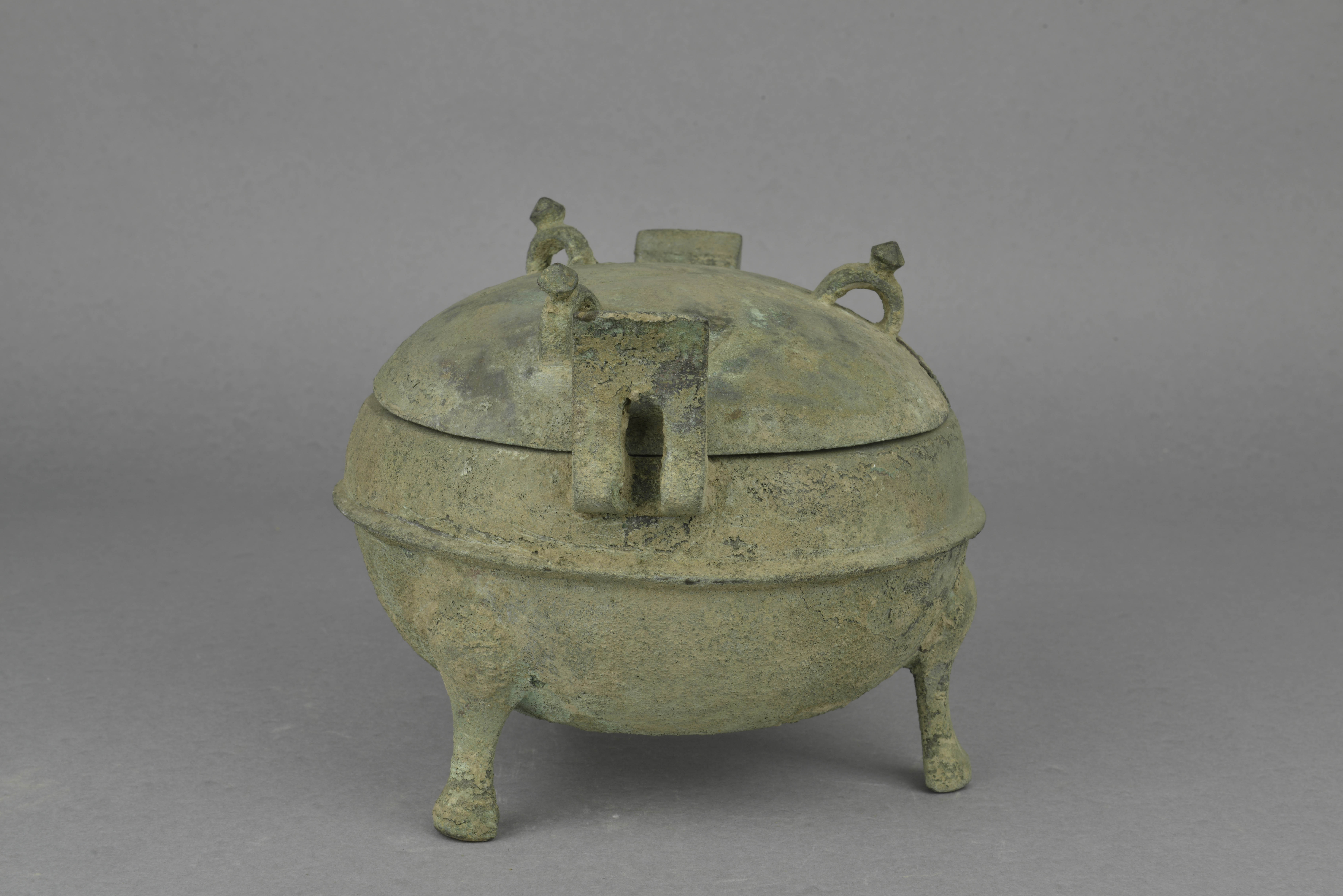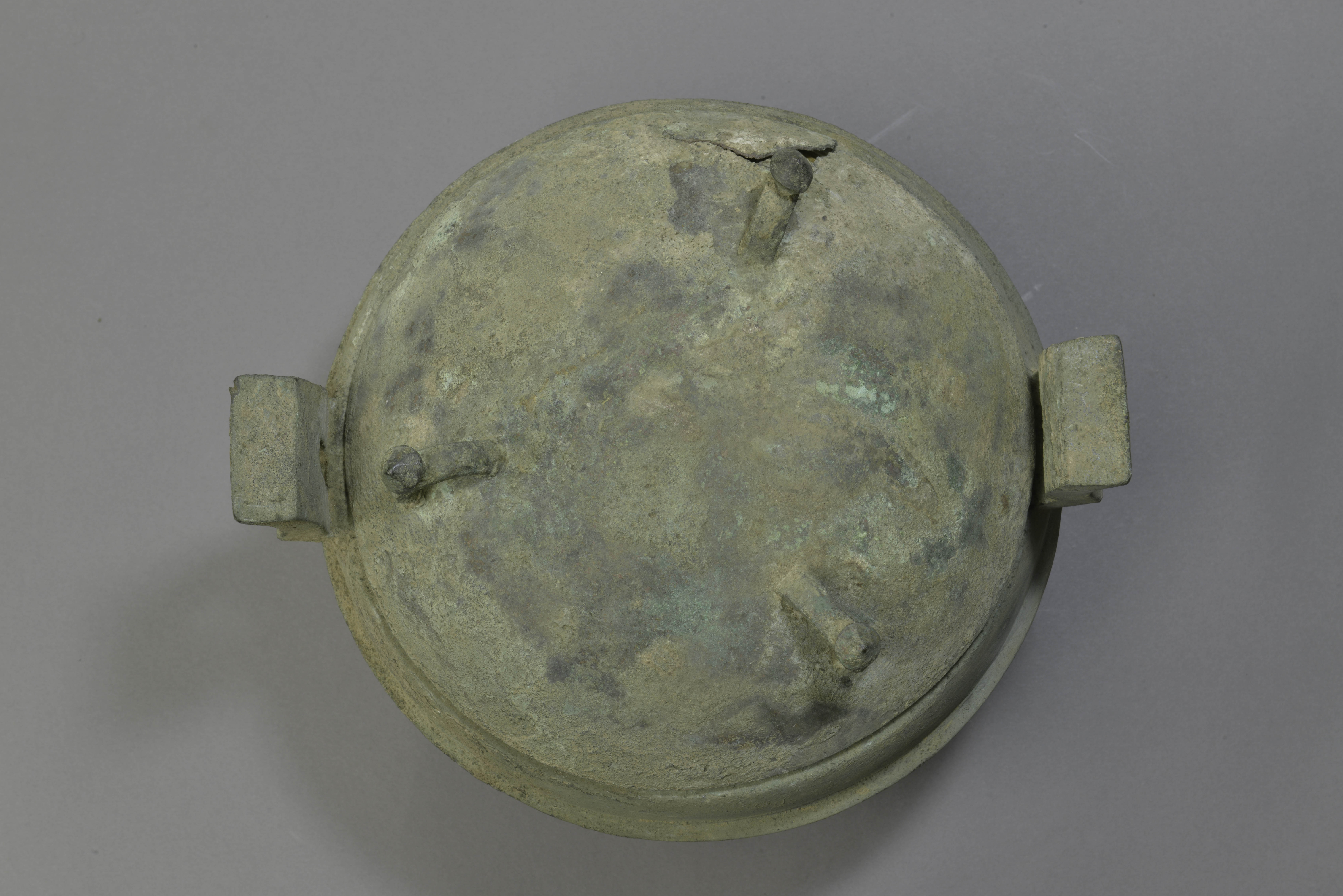 半球形盖,盖上均匀分布三环,环上起乳。子母口,两附耳外撇,鼓腹,圜底。腹部饰弦纹一周。