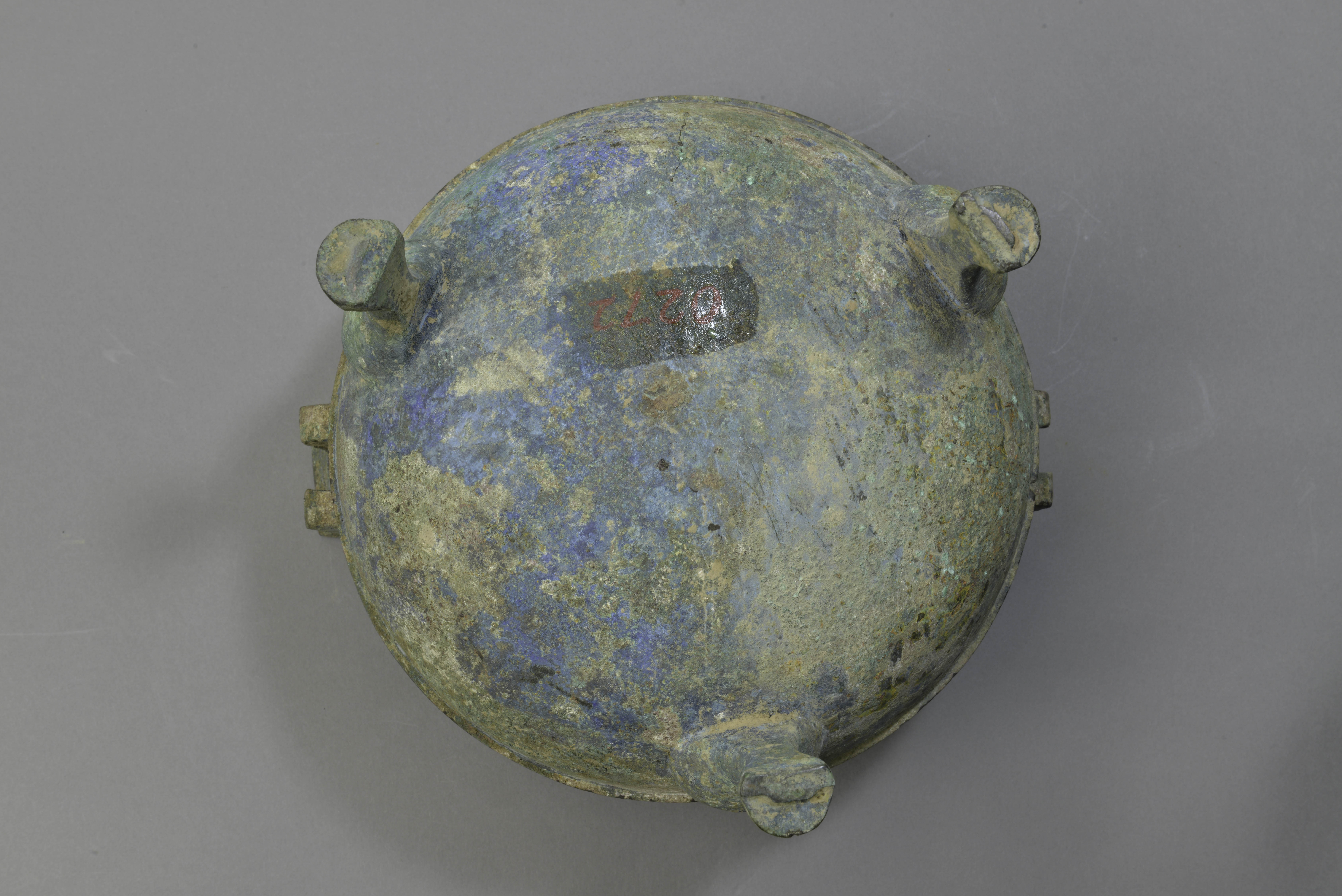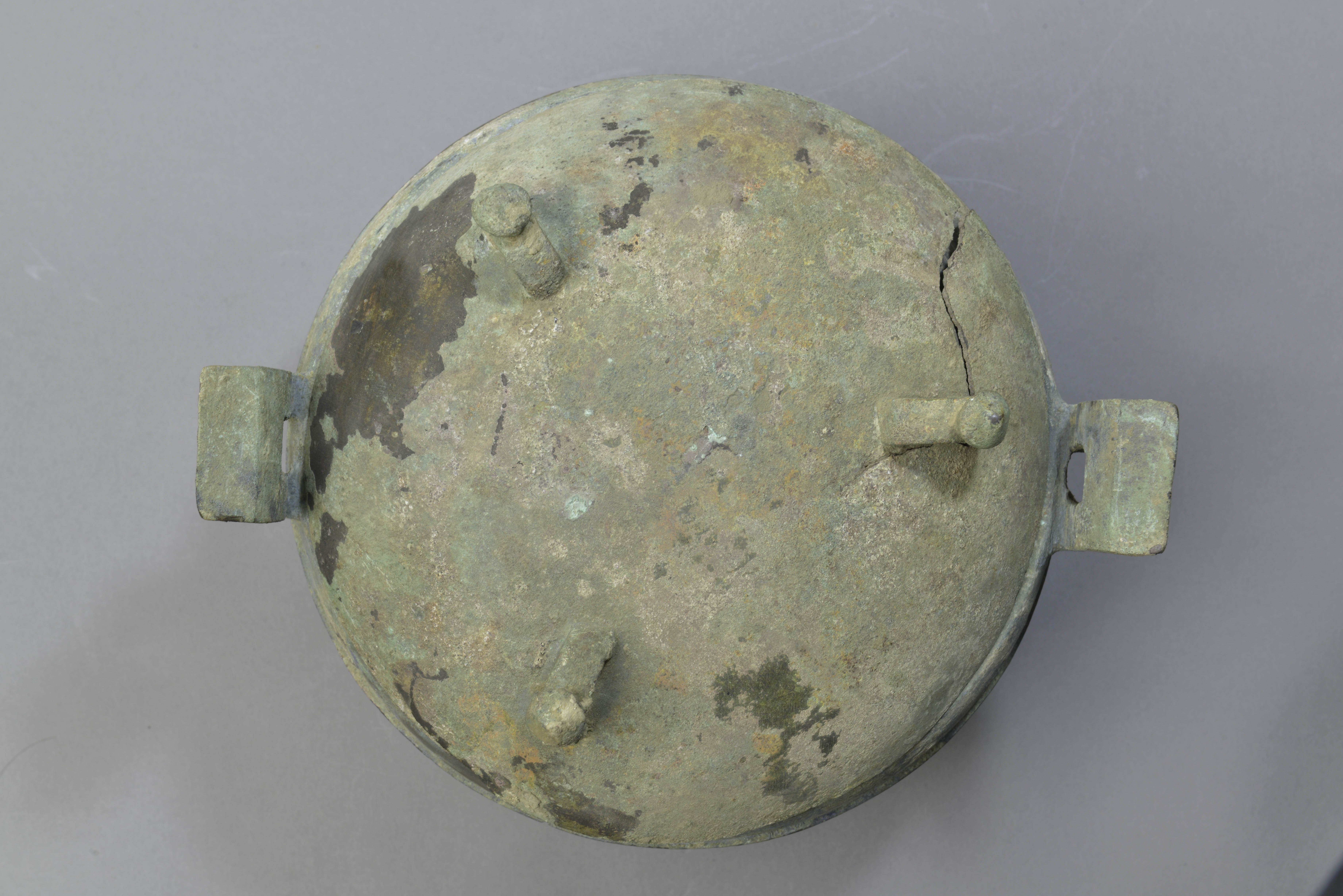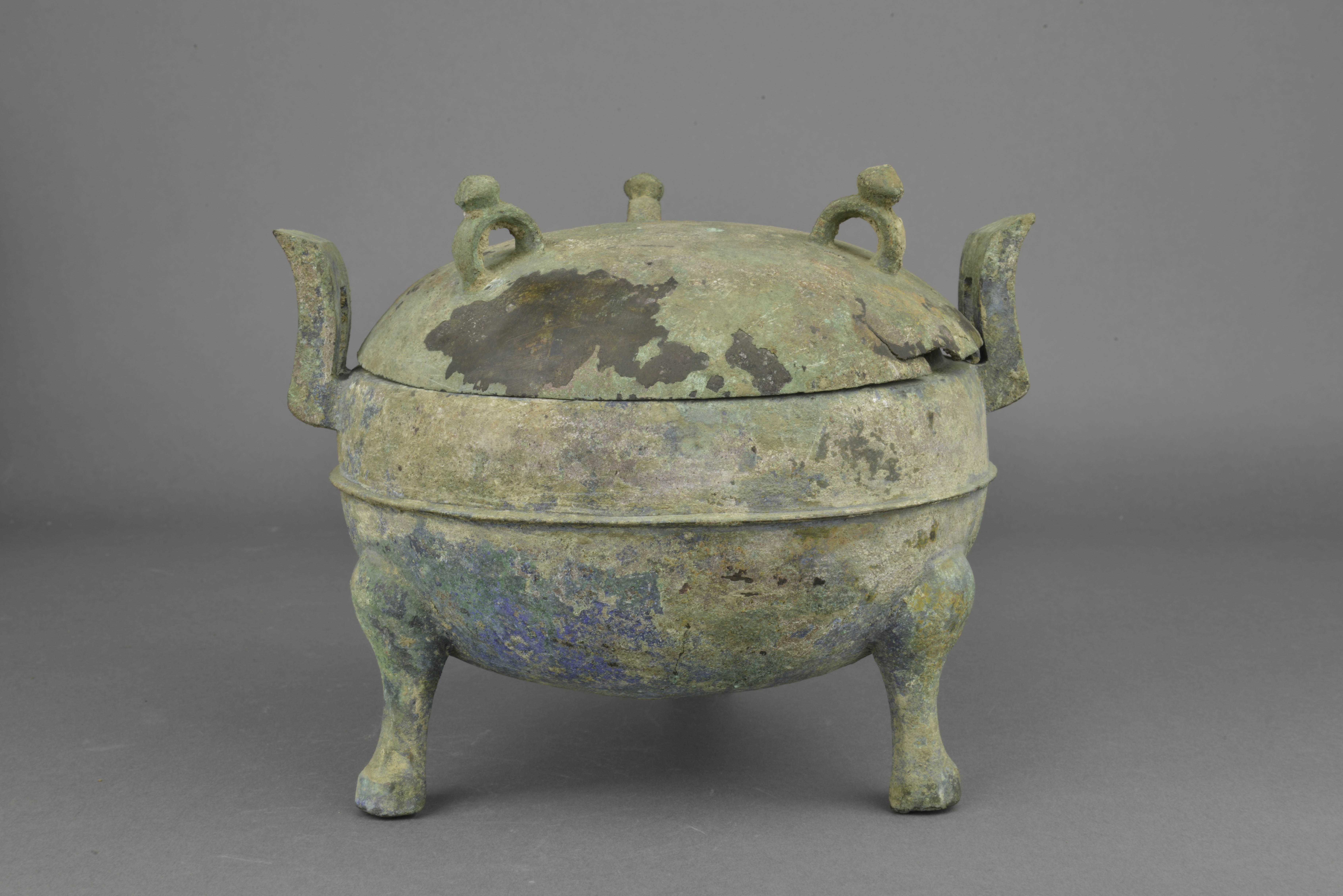 半球形盖,盖上均匀分布三环,环上起乳。子母口,两附耳,鼓腹,圜底。腹中部饰弦纹一周。三蹄足。