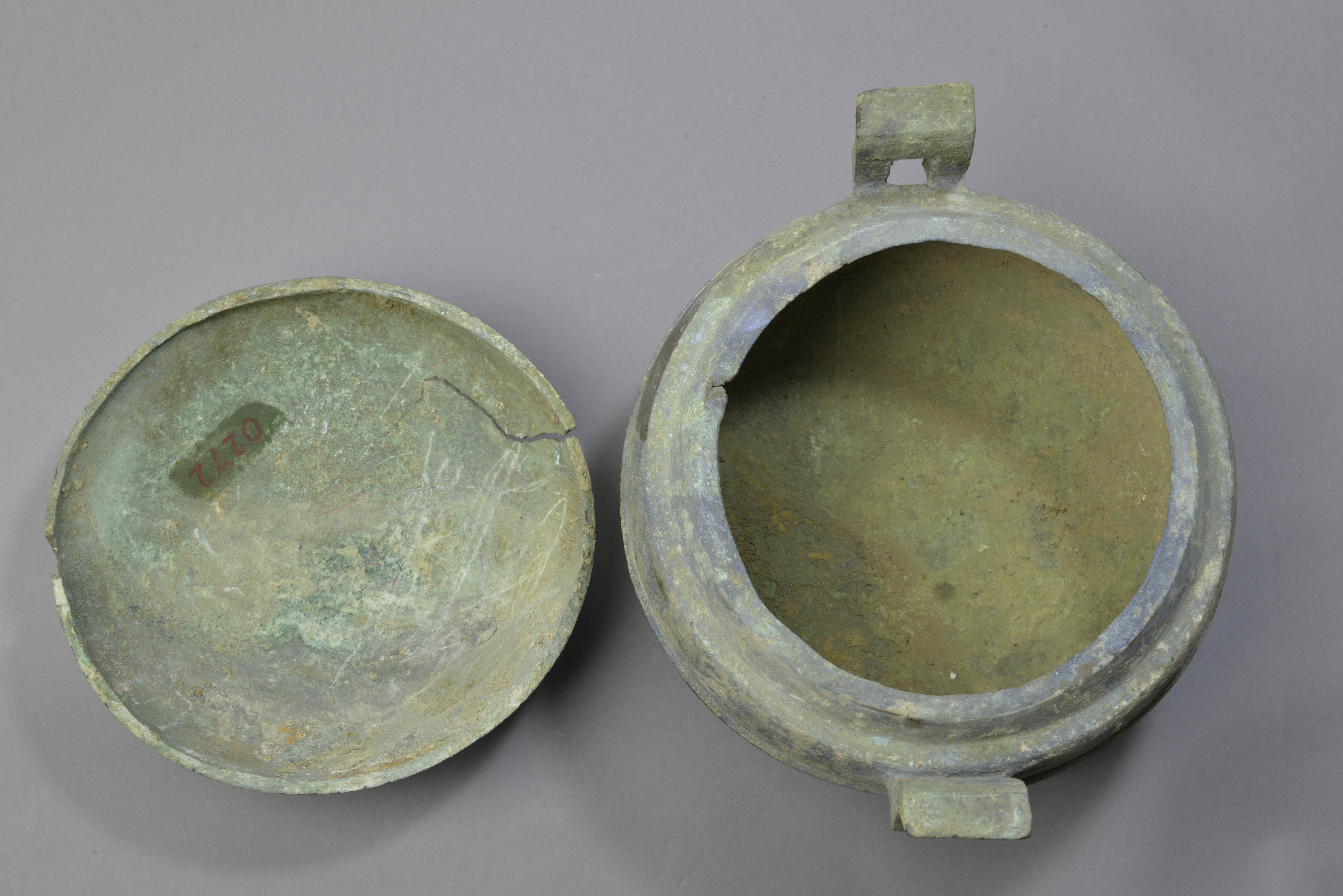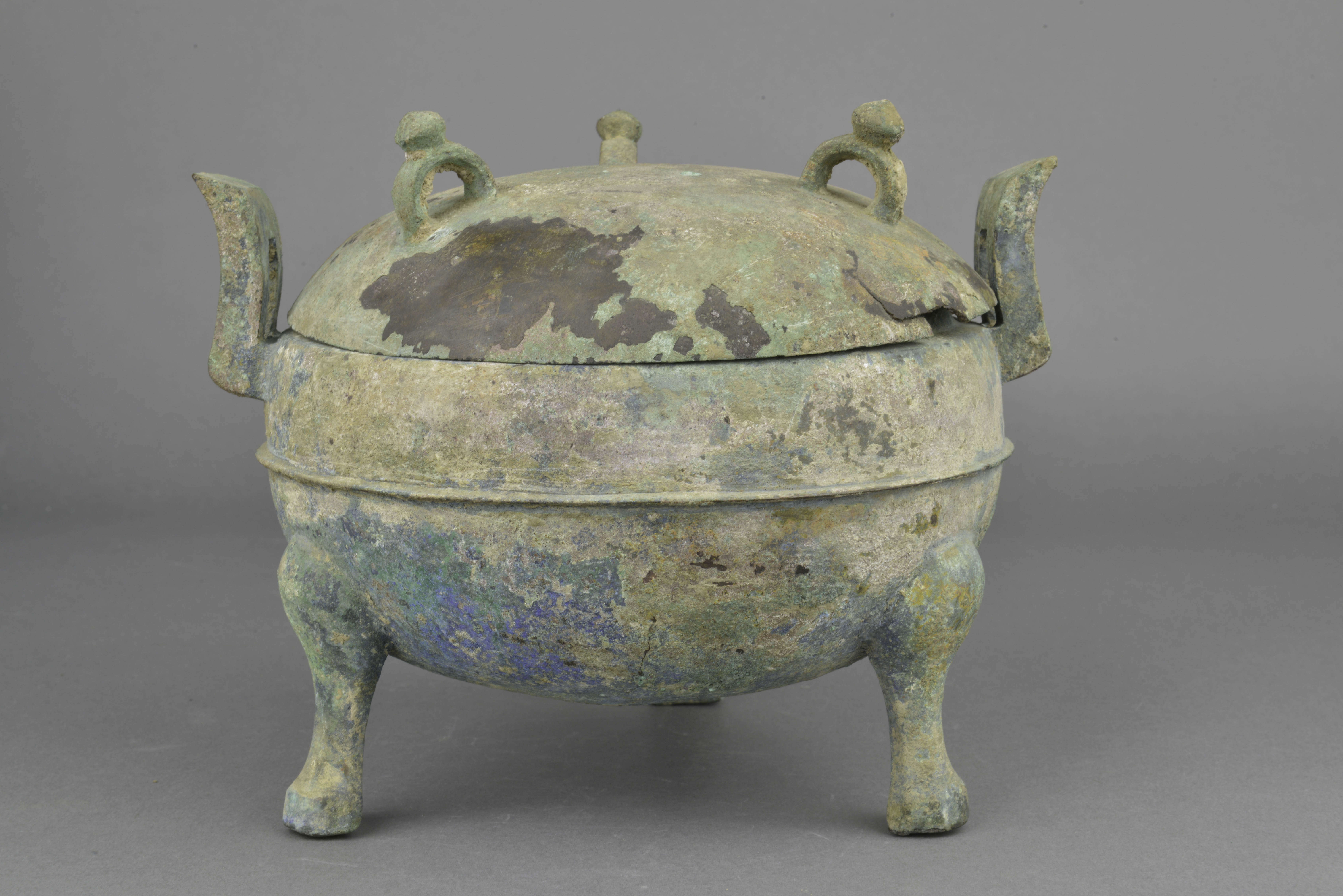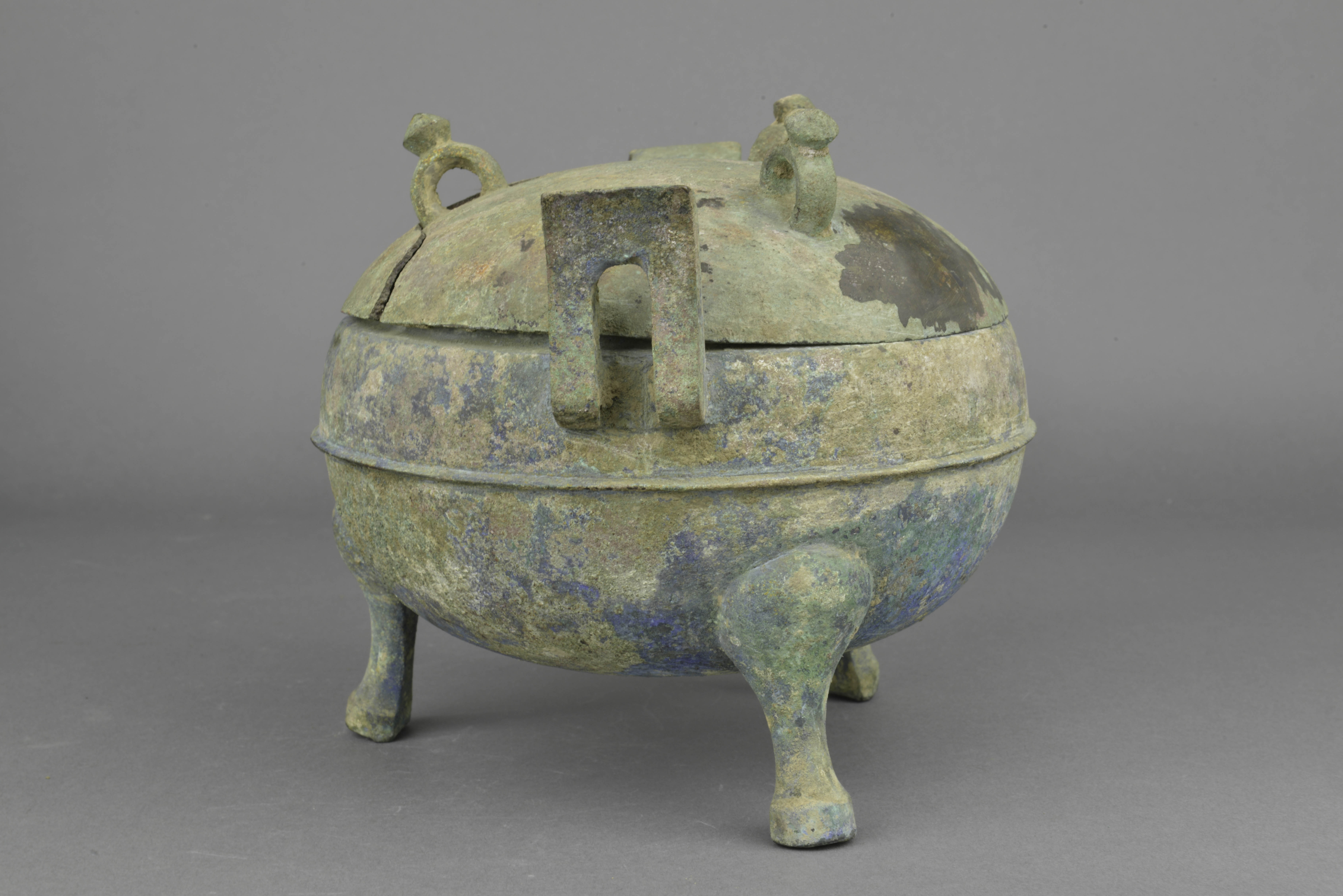 半球形盖,盖上均匀分布三环,环上起乳。子母口,两附耳,鼓腹,圜底。腹中部饰弦纹一周。三蹄足。