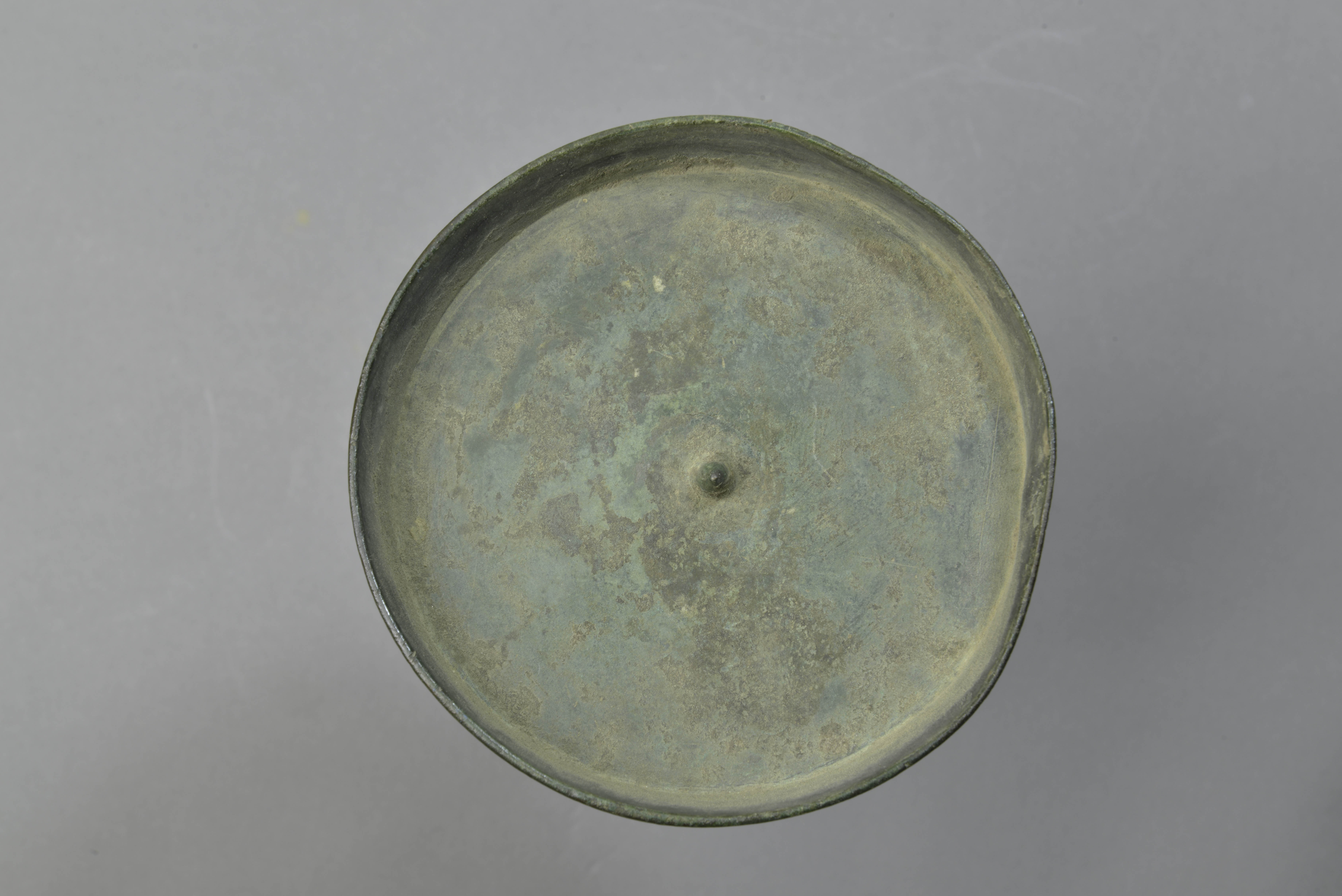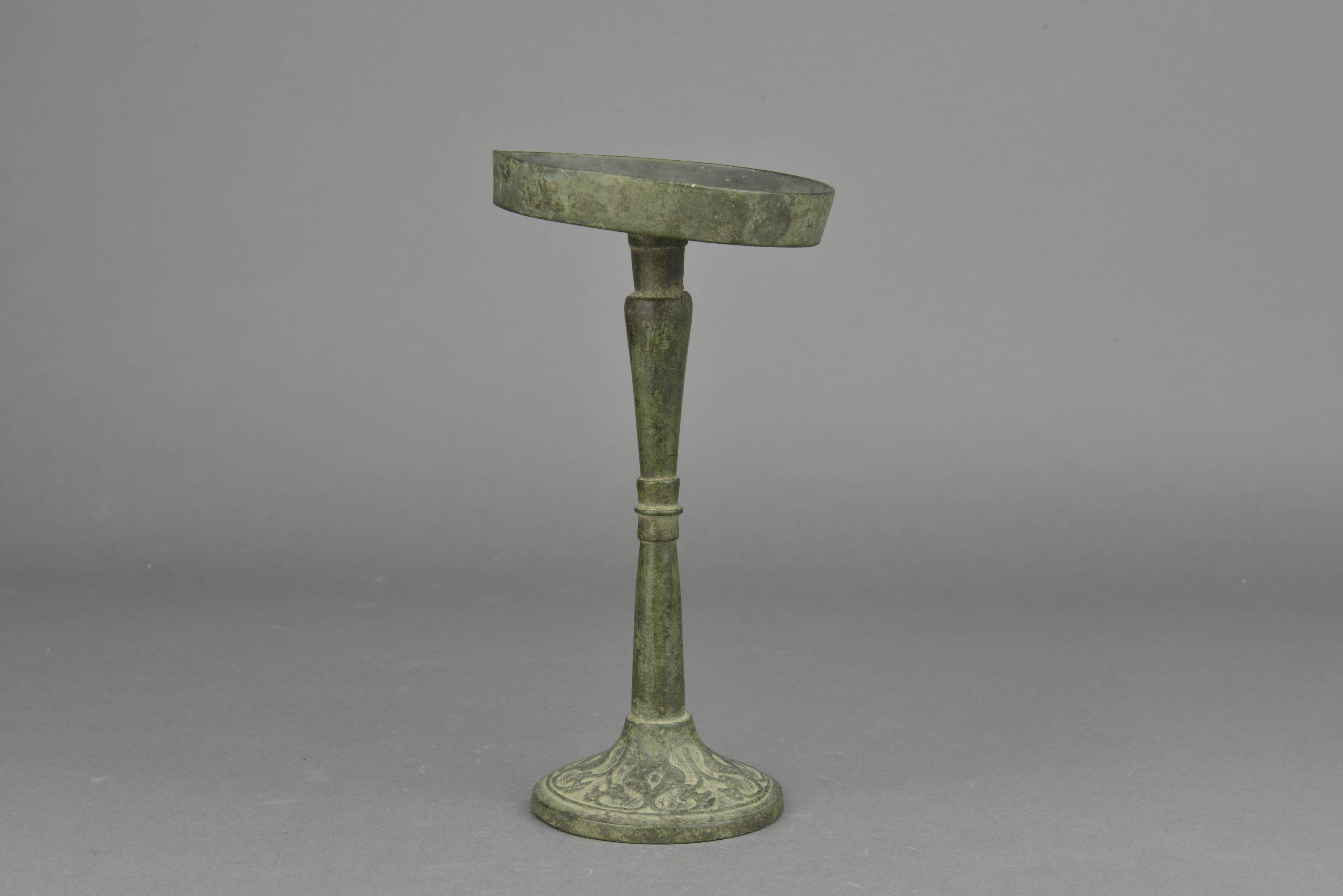 灯盘为直口,浅腹,平底,中心有小圆锥,高柄,柄中有一周凸箍,喇叭形底座。座上饰柿蒂纹及席纹。