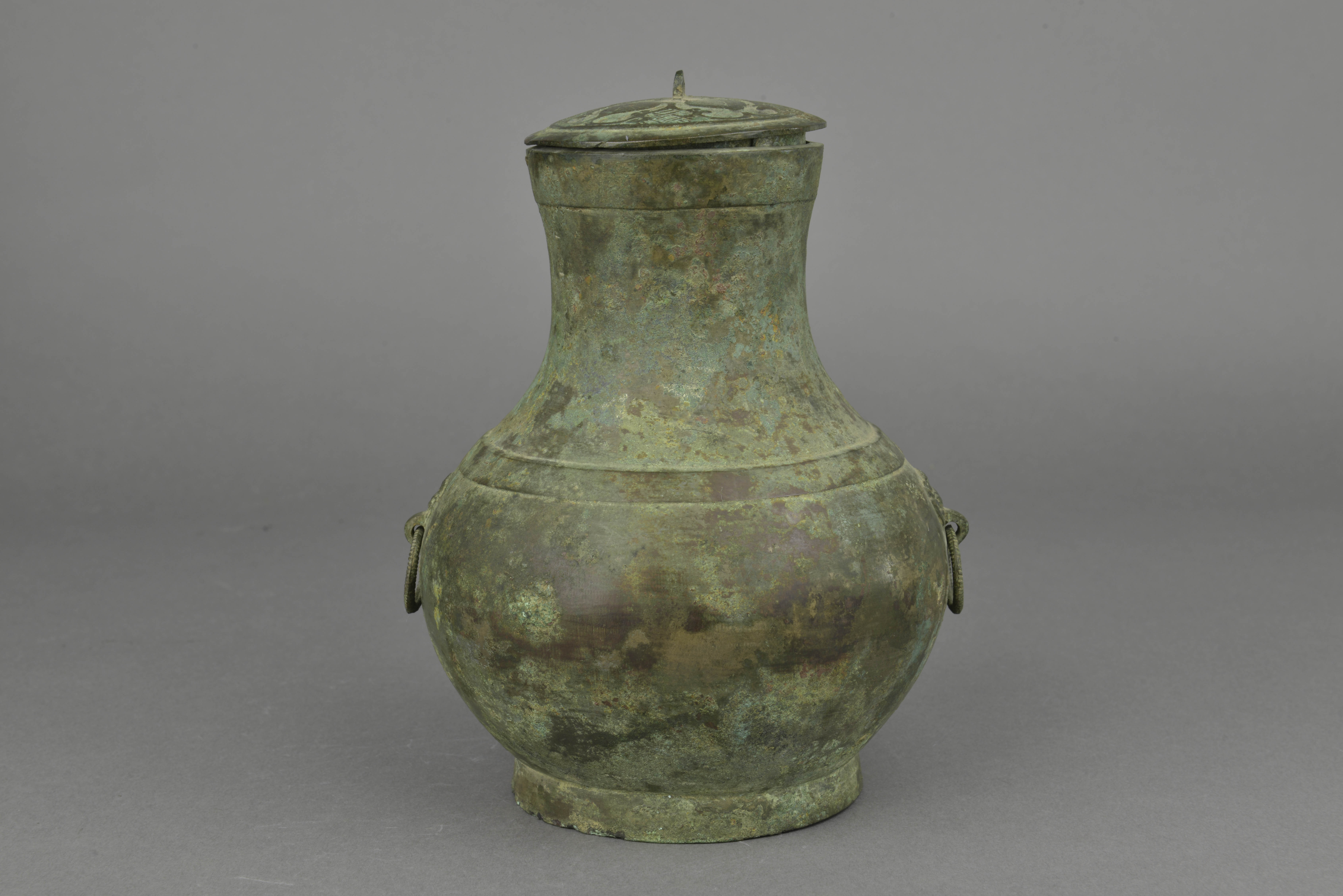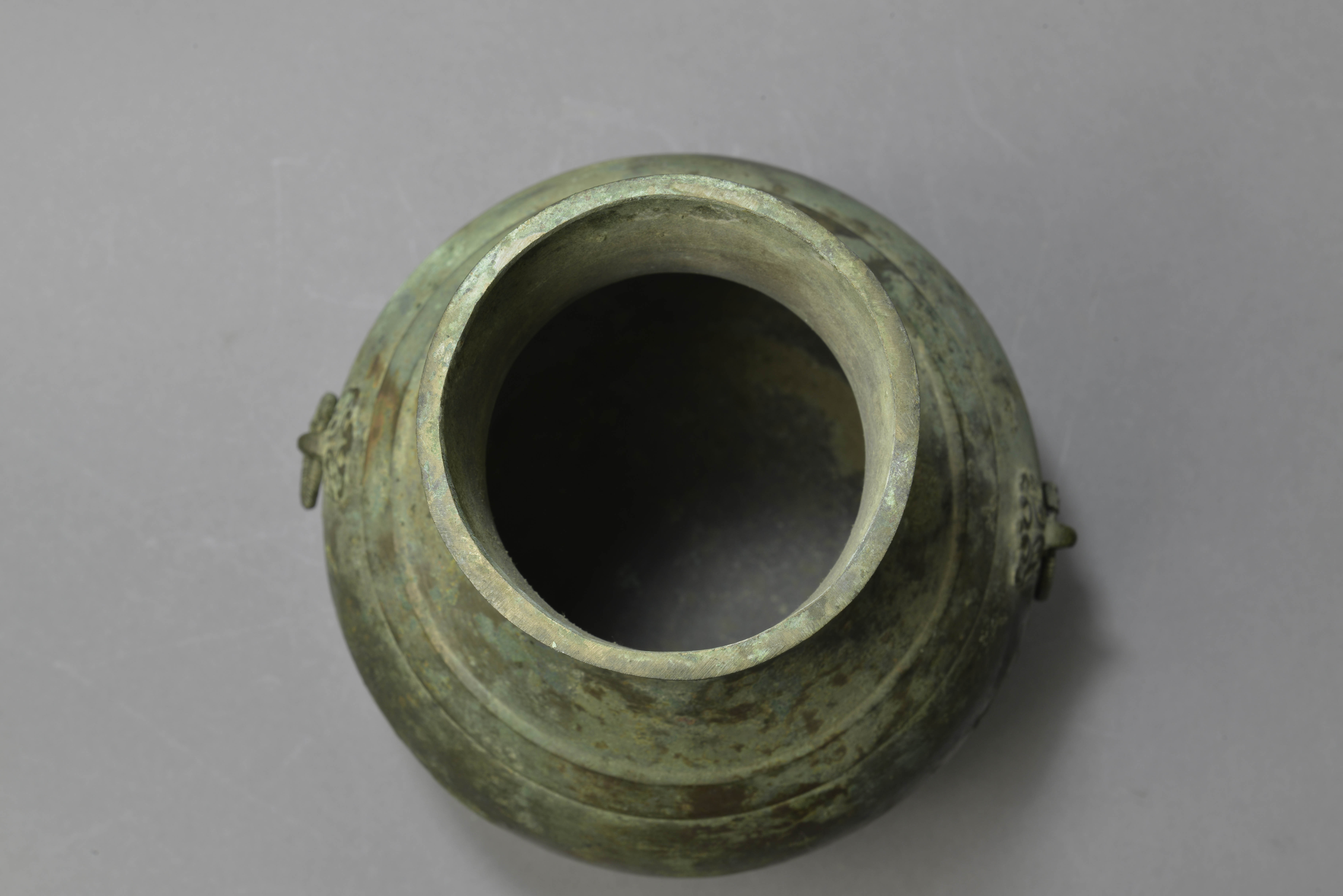 圆形盖,盖中有一桥形小钮。子母口,束颈,圆鼓腹,矮圈足。颈部及腹上部各饰一周素面宽纹带,腹中部左右有对称的衔环铺首。盖边沿饰一周凸弦纹,内饰柿蒂纹。