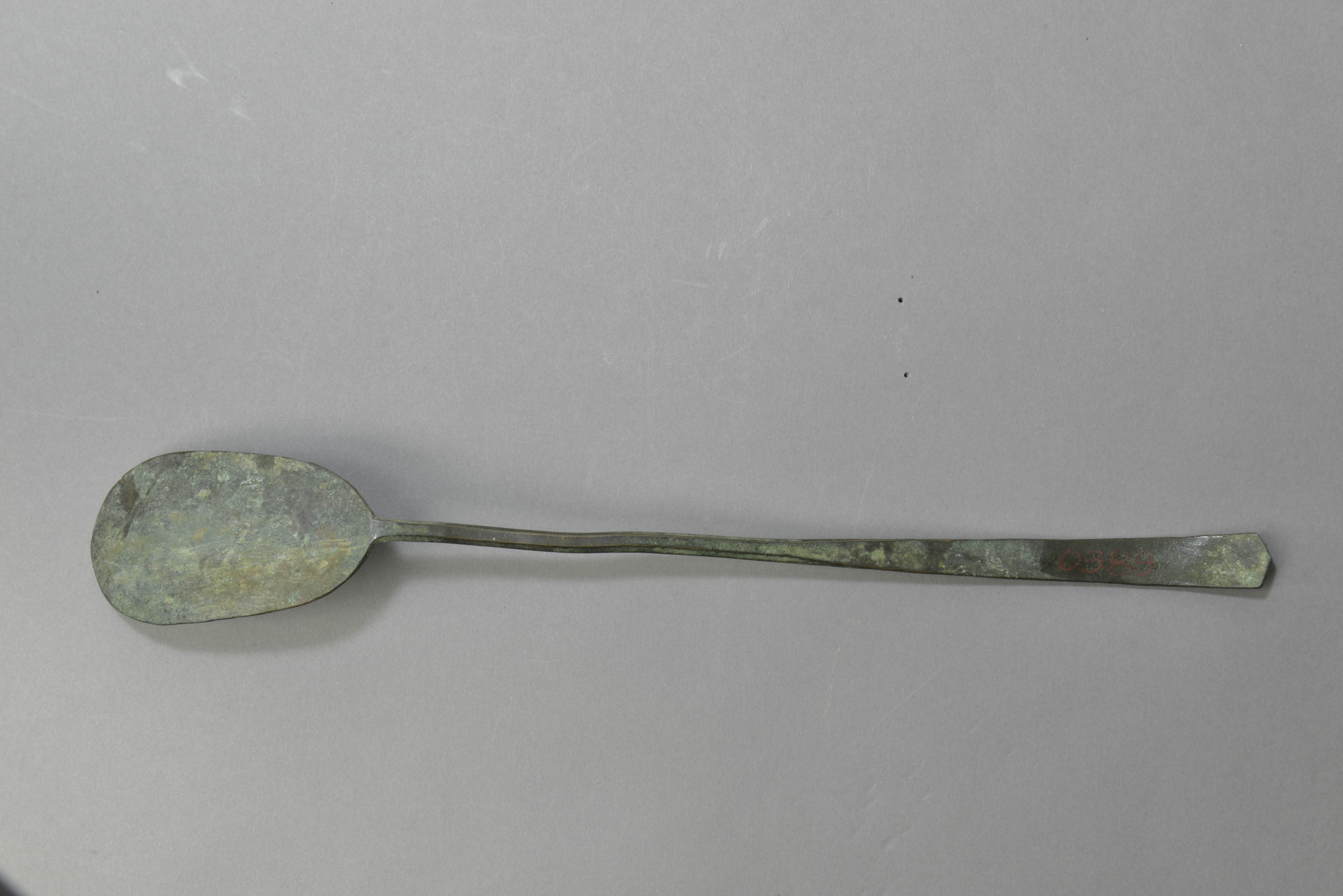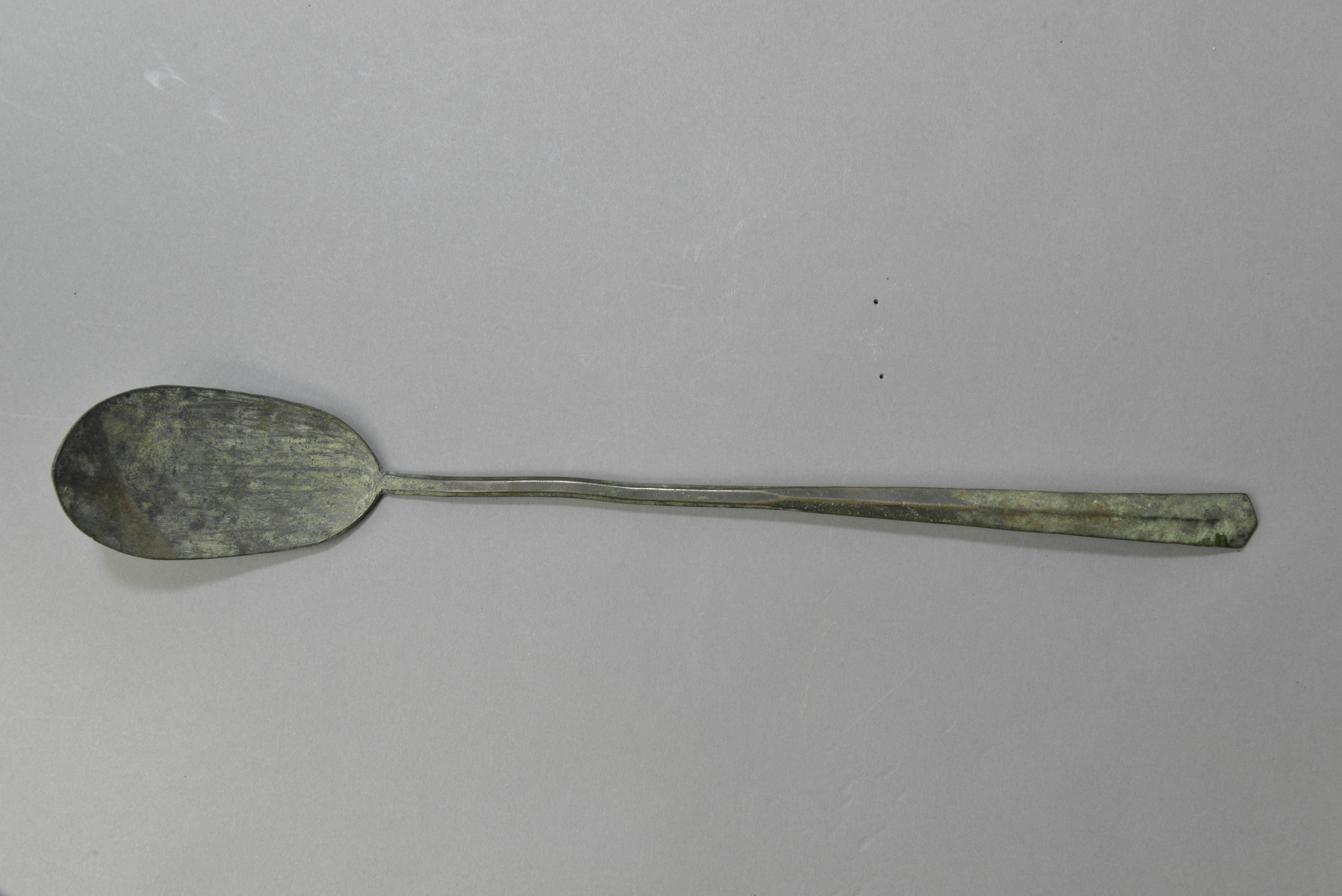 27.2cm;口径3.9cm。勺体呈椭圆形,长柄呈叶把形,柄端下弯。