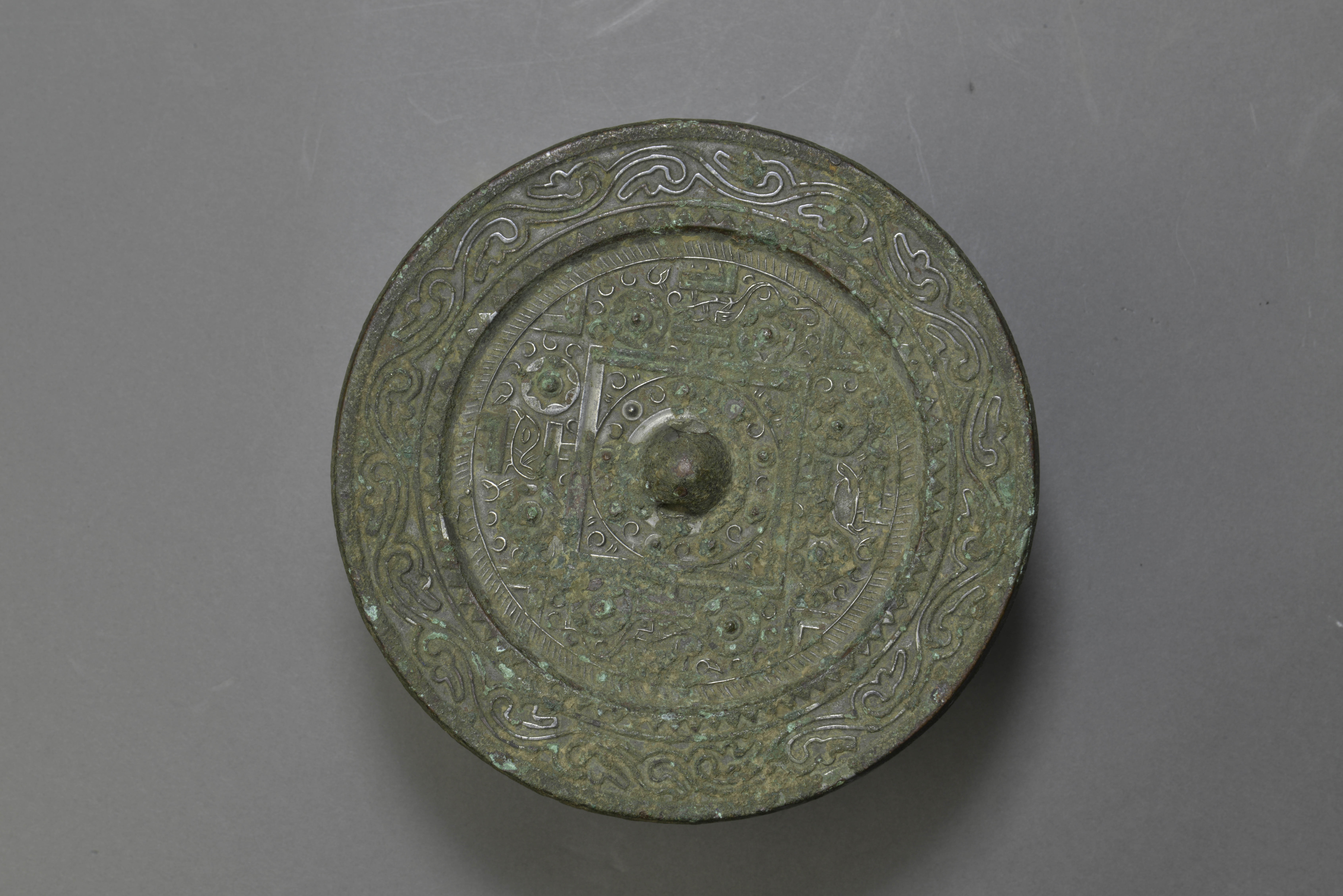 圆形,圆钮,圆钮座。座外一周凸弦纹及一周内向十二连弧带,其外两周短斜线纹带之间有铭文:“内清以昭明,光象夬日月”,每两字之间夹以“而”。字体较方整,素宽缘。