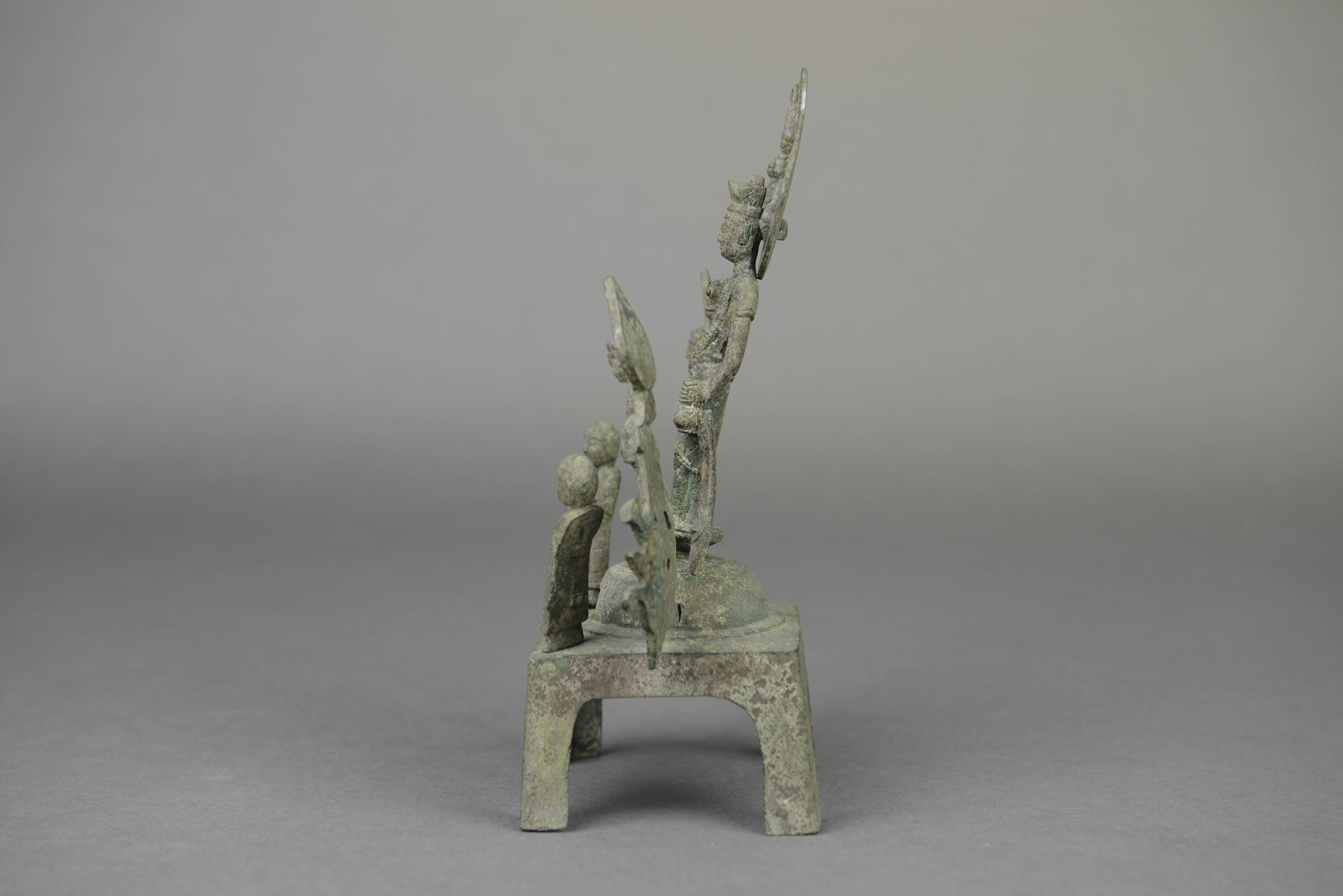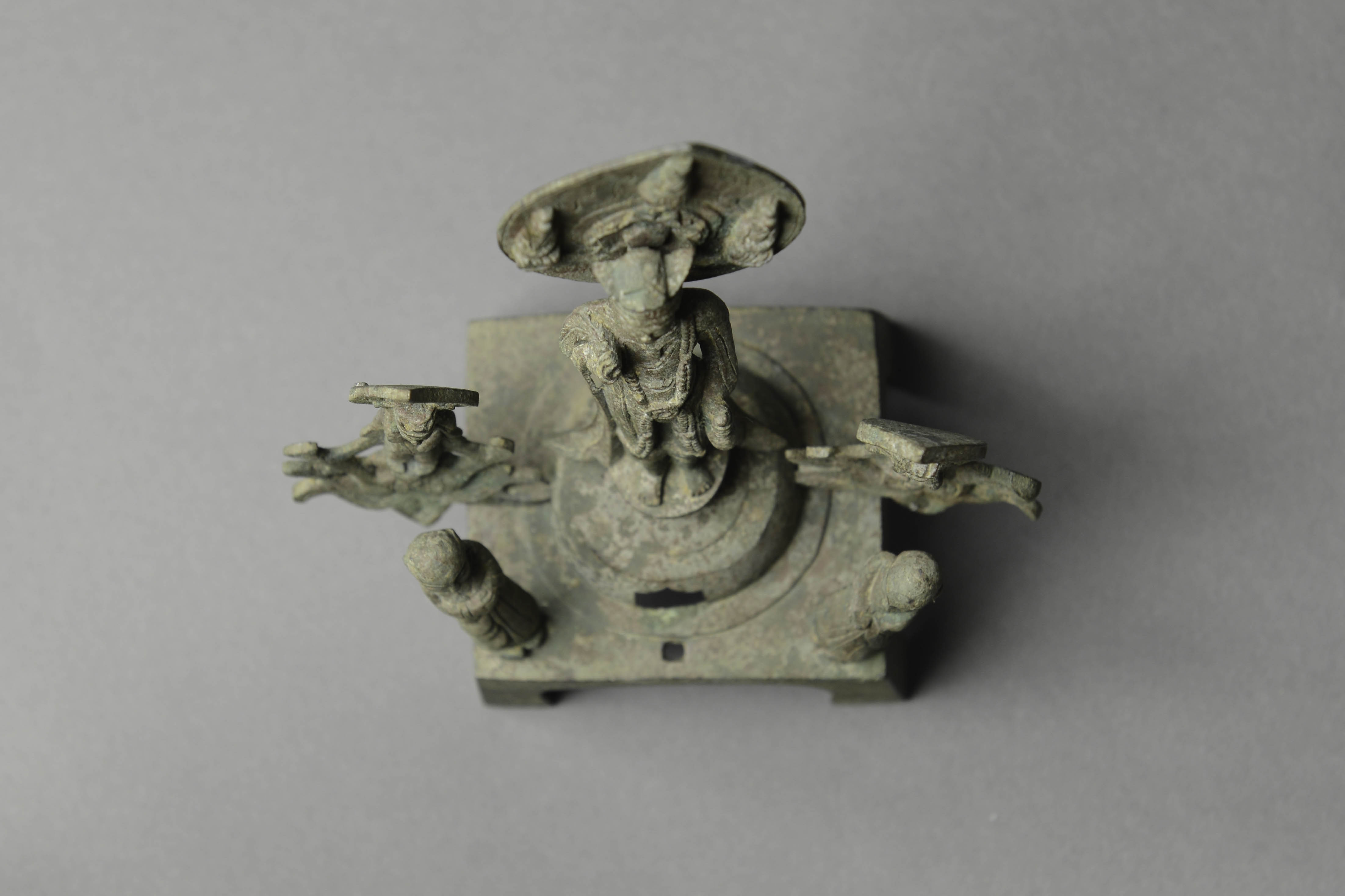 - 内容:主尊观音,二菩萨,二弟子组合。观音头戴莲冠,面相长圆,眉目清秀,着帔帛与裙,颈系项圈,璎珞于腹前穿环下垂至膝,左手下垂执净瓶,右手上举握柳枝,缯带沿体侧下垂,跣足立于仰莲座上。莲瓣形头光上浮雕三坐佛,刻火焰纹。两侧胁侍菩萨头戴莲冠,身着衫裤,跣足立于莲茎座上,莲瓣形头光饰火焰纹。二弟子秃发,面相方圆,身着袈裟,背向而立作护法状,五尊造像均作榫卯式连接于上圆下方四足床座上。