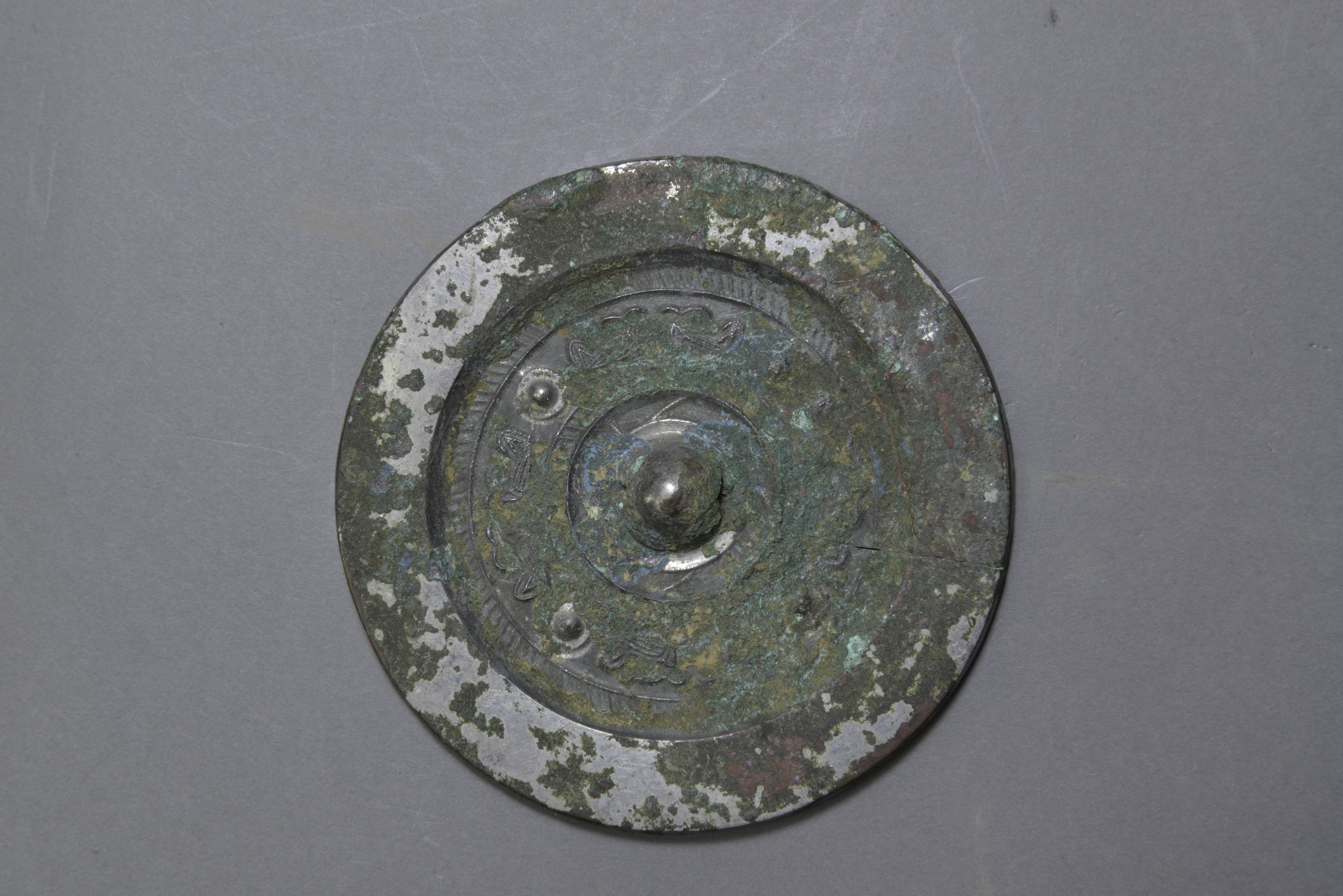 圆形,圆钮,圆钮座。座外两周短斜线纹间饰四枚带圆座的乳钉和八只两两相对的禽鸟,鸟形二歧冠,覆羽翼,翘尾。素宽缘。