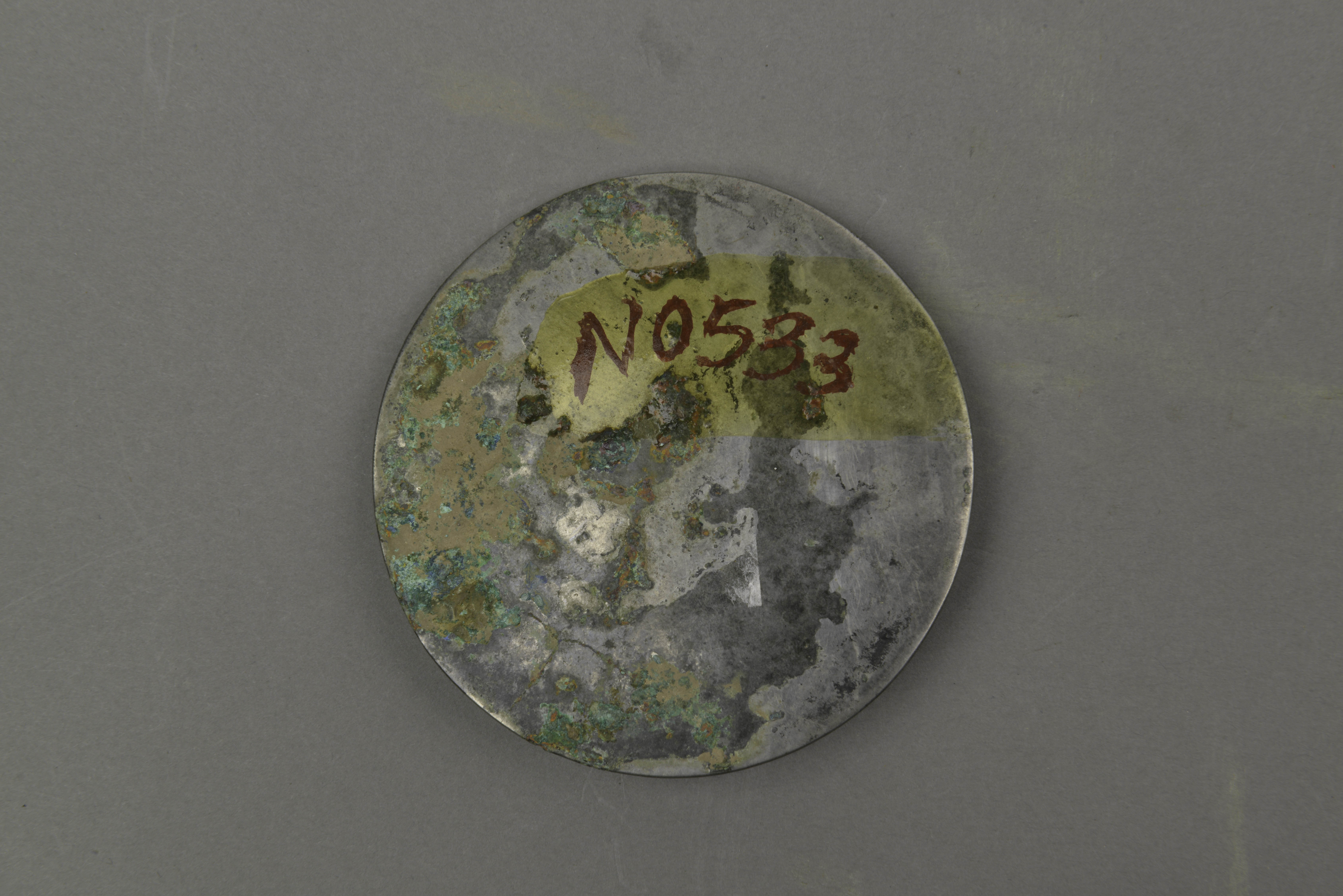 圆形,圆钮,圆钮座。座外方框,框外四方四乳,T形纹的一部分相间。短斜线纹带外突出的锯齿纹,素缘。