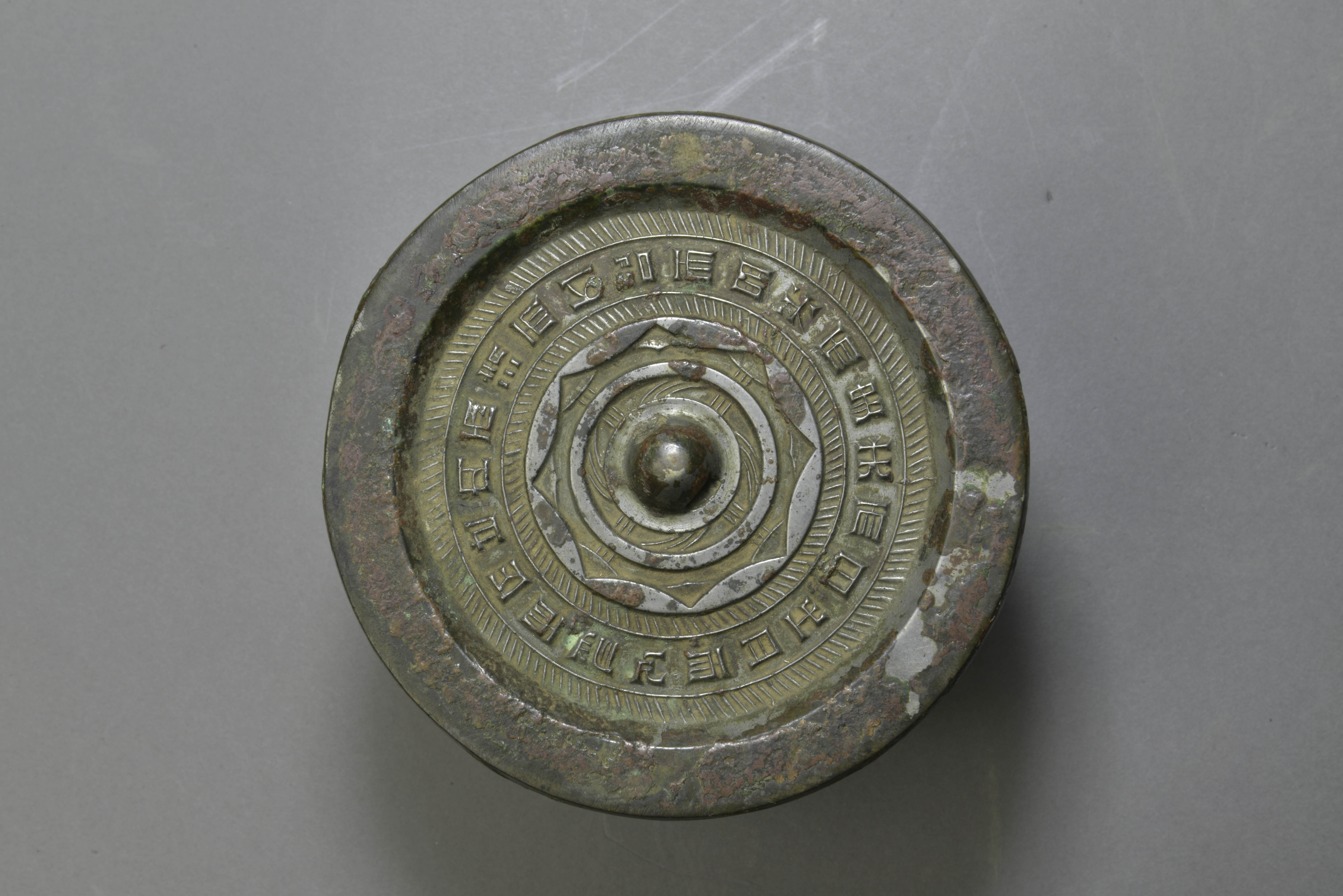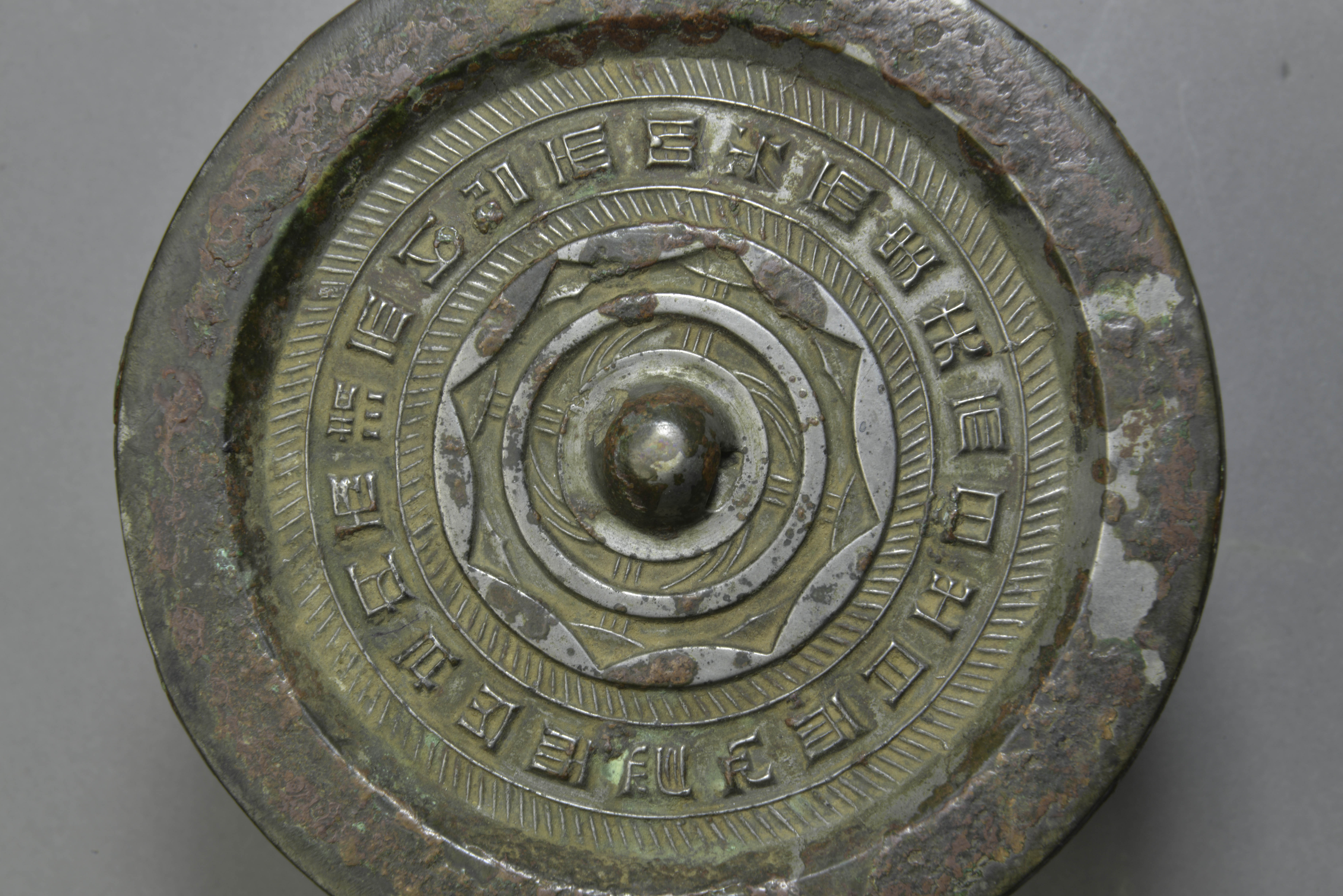 圆形,圆钮,圆钮座,座外一周凸弦带及一周内向八连弧纹带,两周斜线纹带之间有铭文:“内清以昭明,光夬日月,心忍,不泄“,每两字之间夹一”而“字。铭文字体方正,但多减笔字。字句不完整。素宽缘。