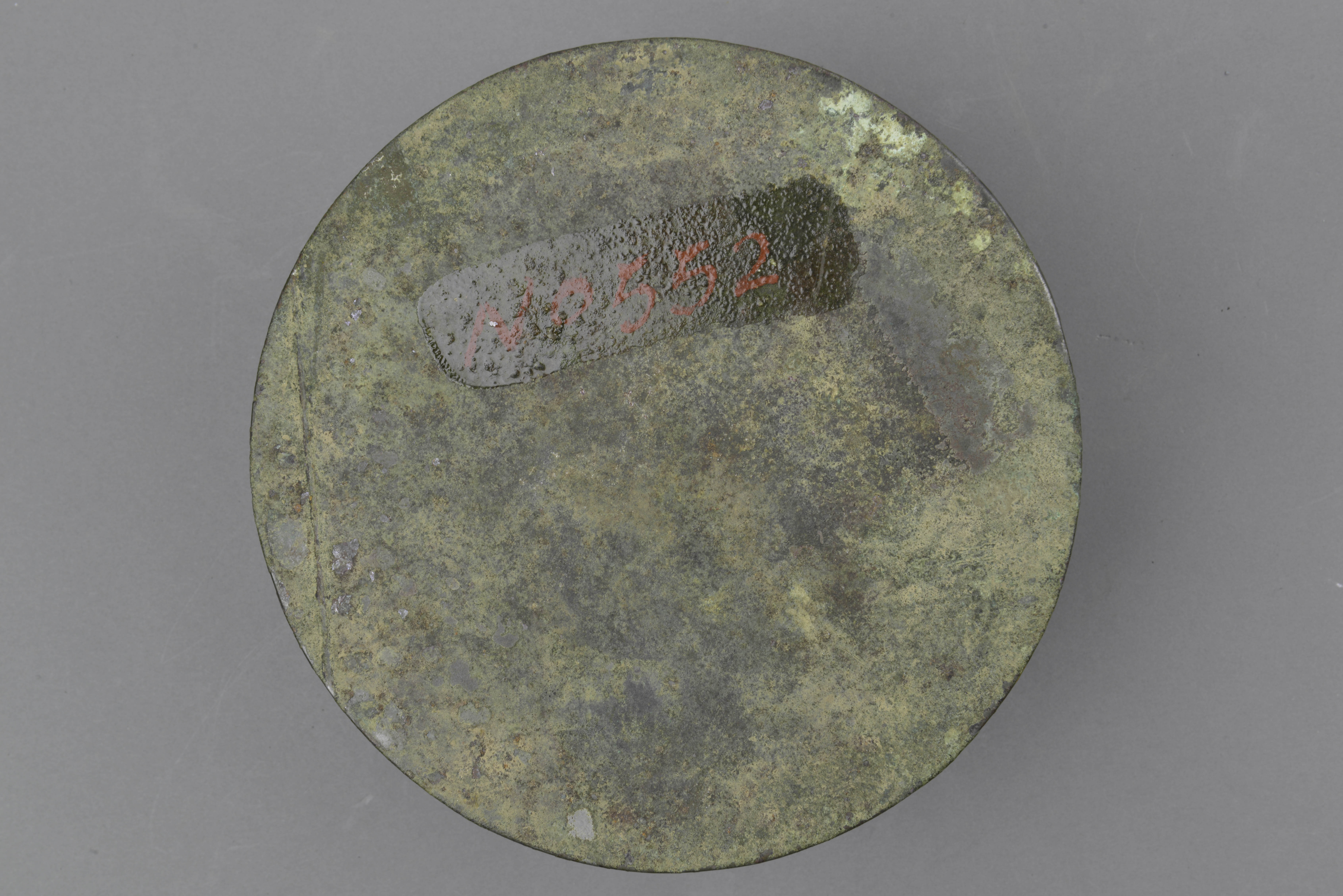 直径16.0cm。圆形,圆钮,圆钮座。座外一周凸弦纹圈带,外接内向八连弧纹带。其外两周短斜线纹之间有隶书铭文:“涑治同化清而明,以之为镜宜文章,延年益寿去不祥,与天毋极”。宽缘饰锯齿纹及云气纹各一周。
