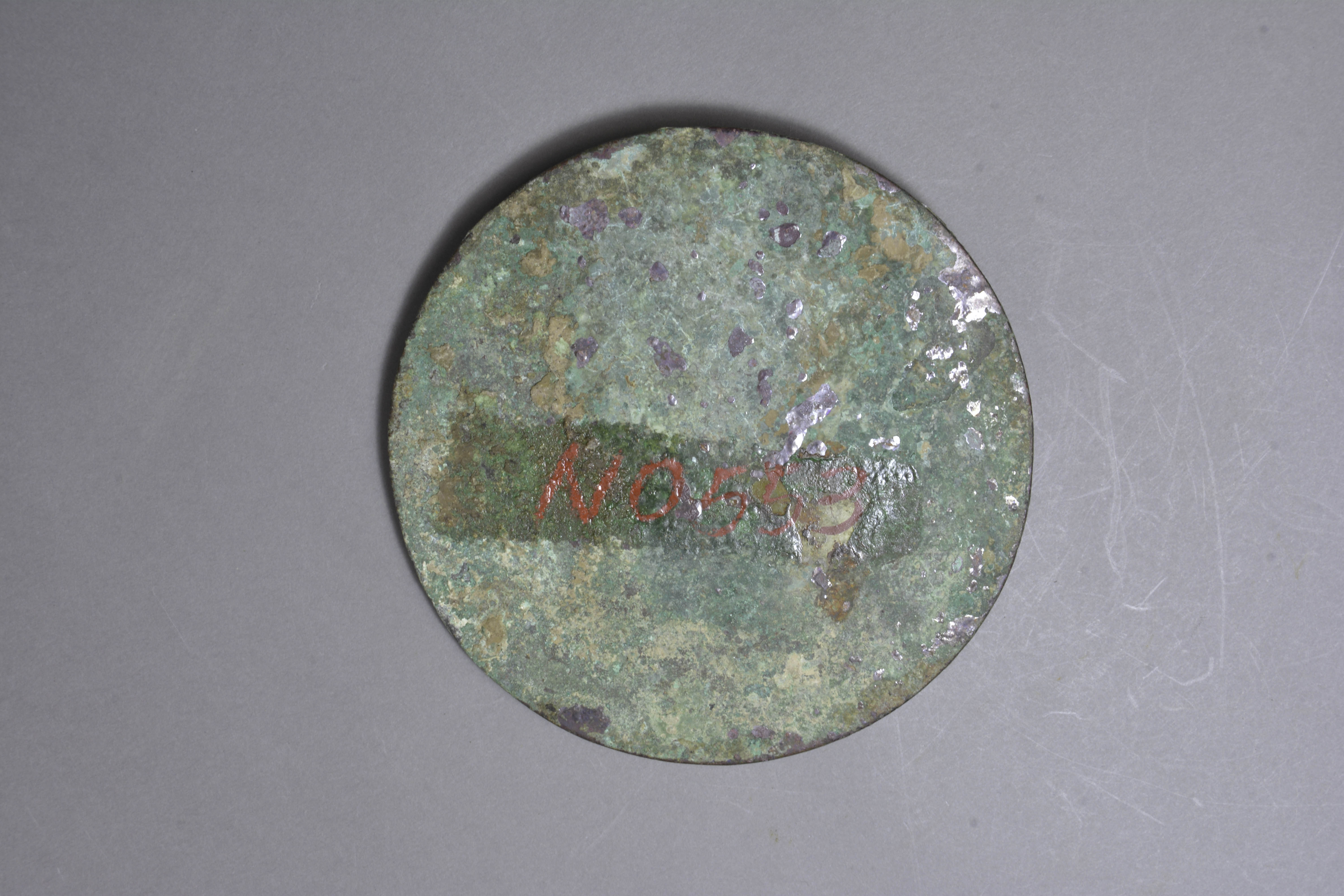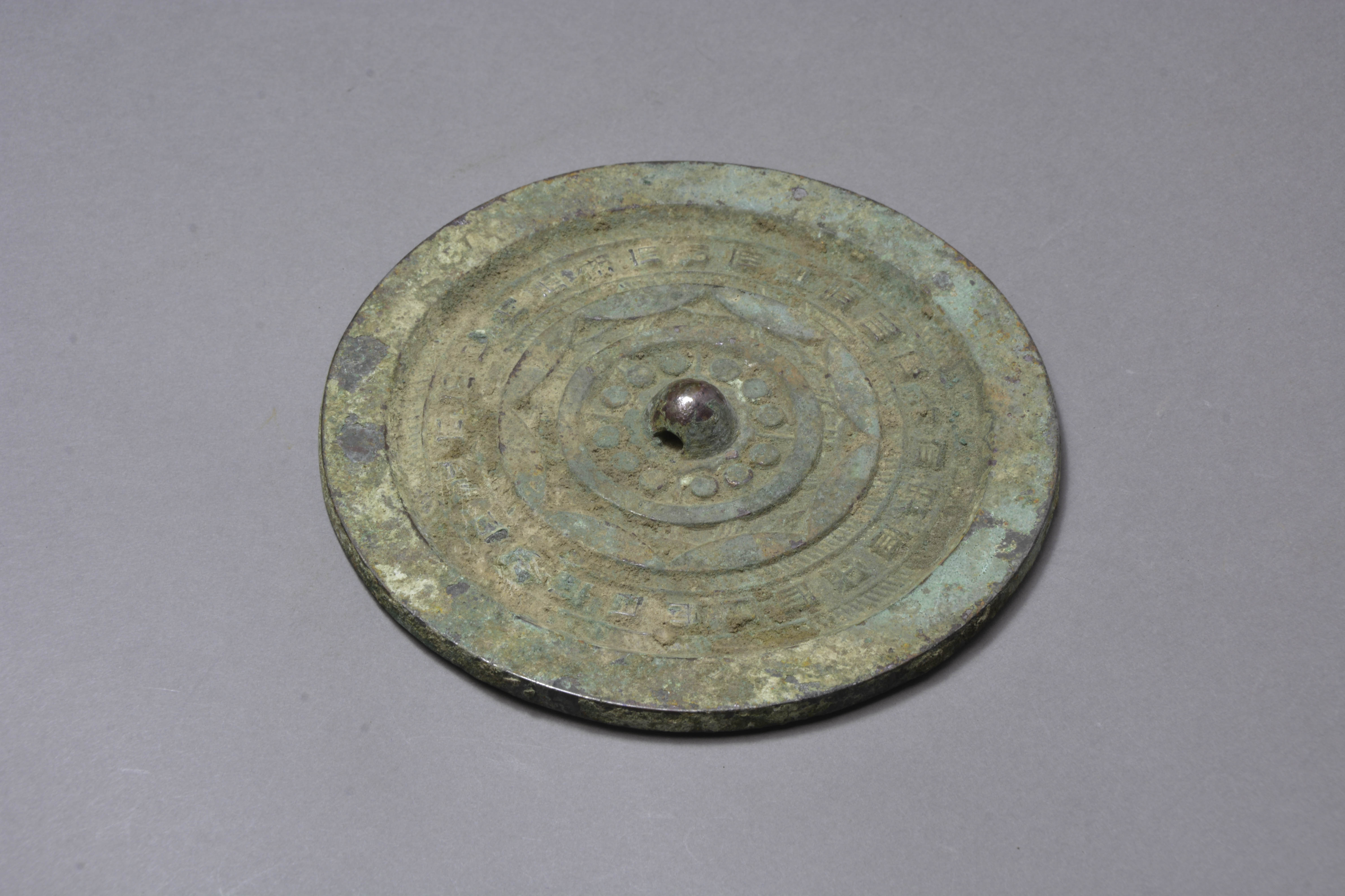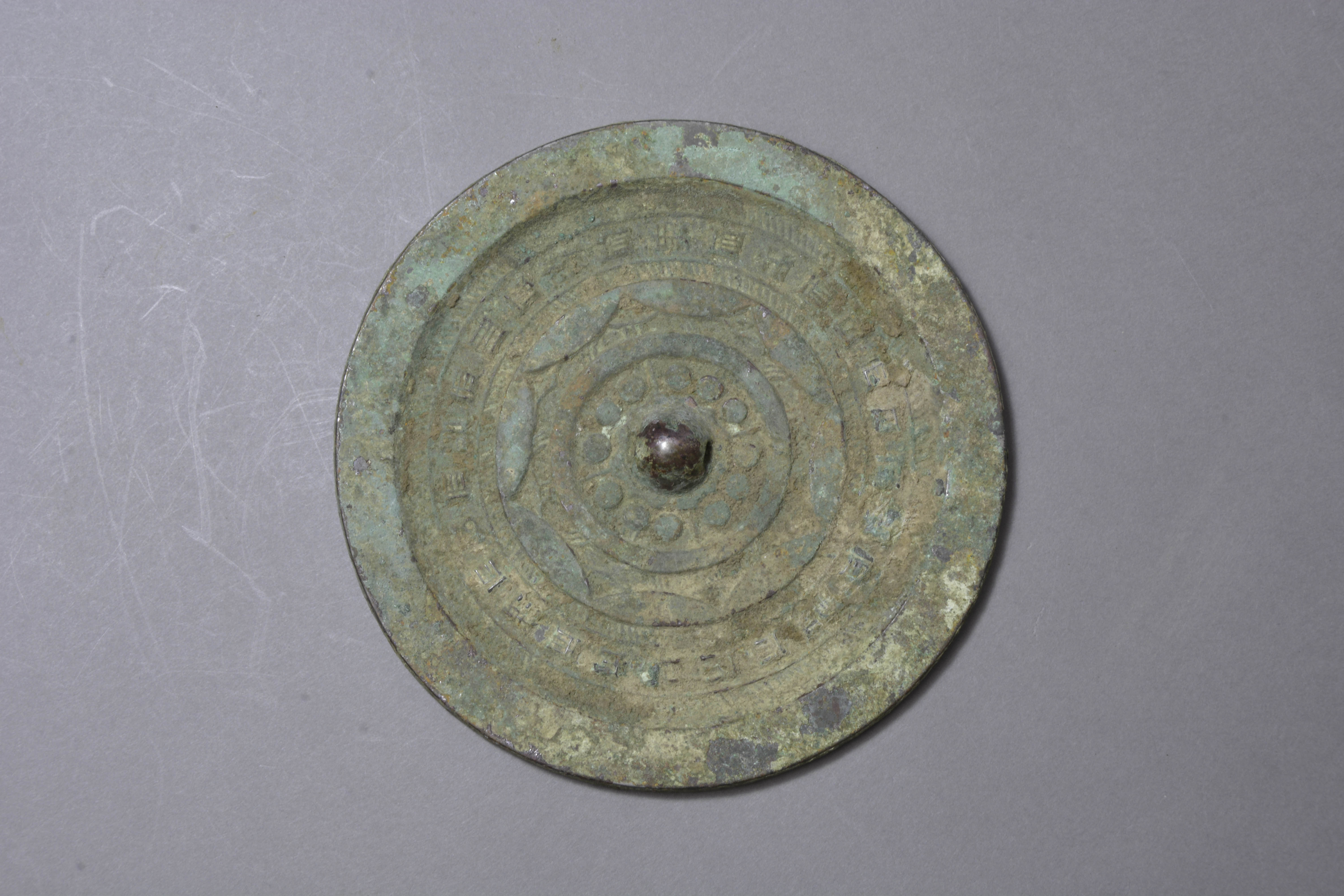 圆形,圆钮,圆钮座,并蒂连珠纹钮座。钮座外一周凸弦纹,其外饰八内向连弧纹外一周铭文“内清以昭明,光象夬日月,□□不世(泄)素缘。