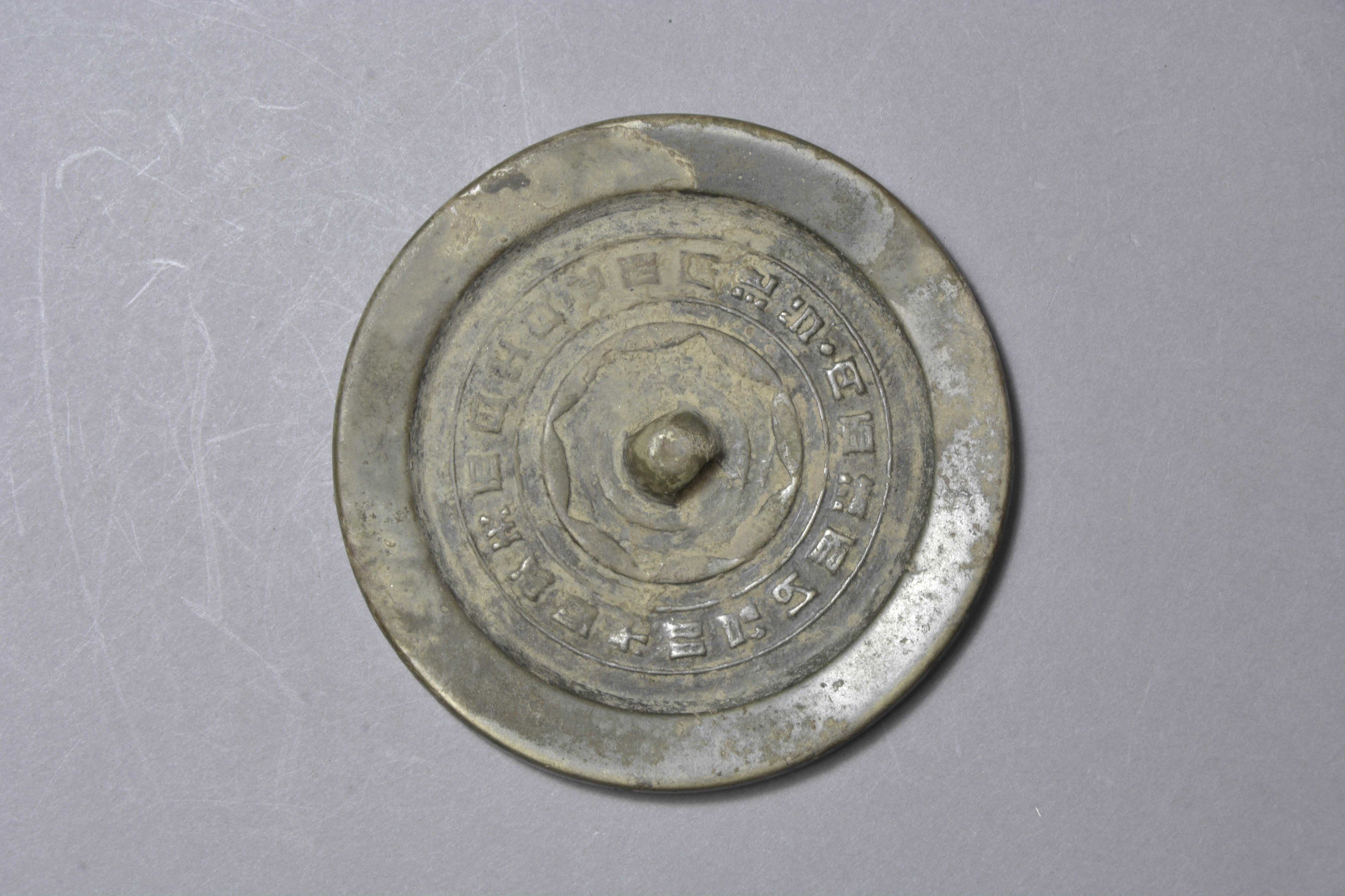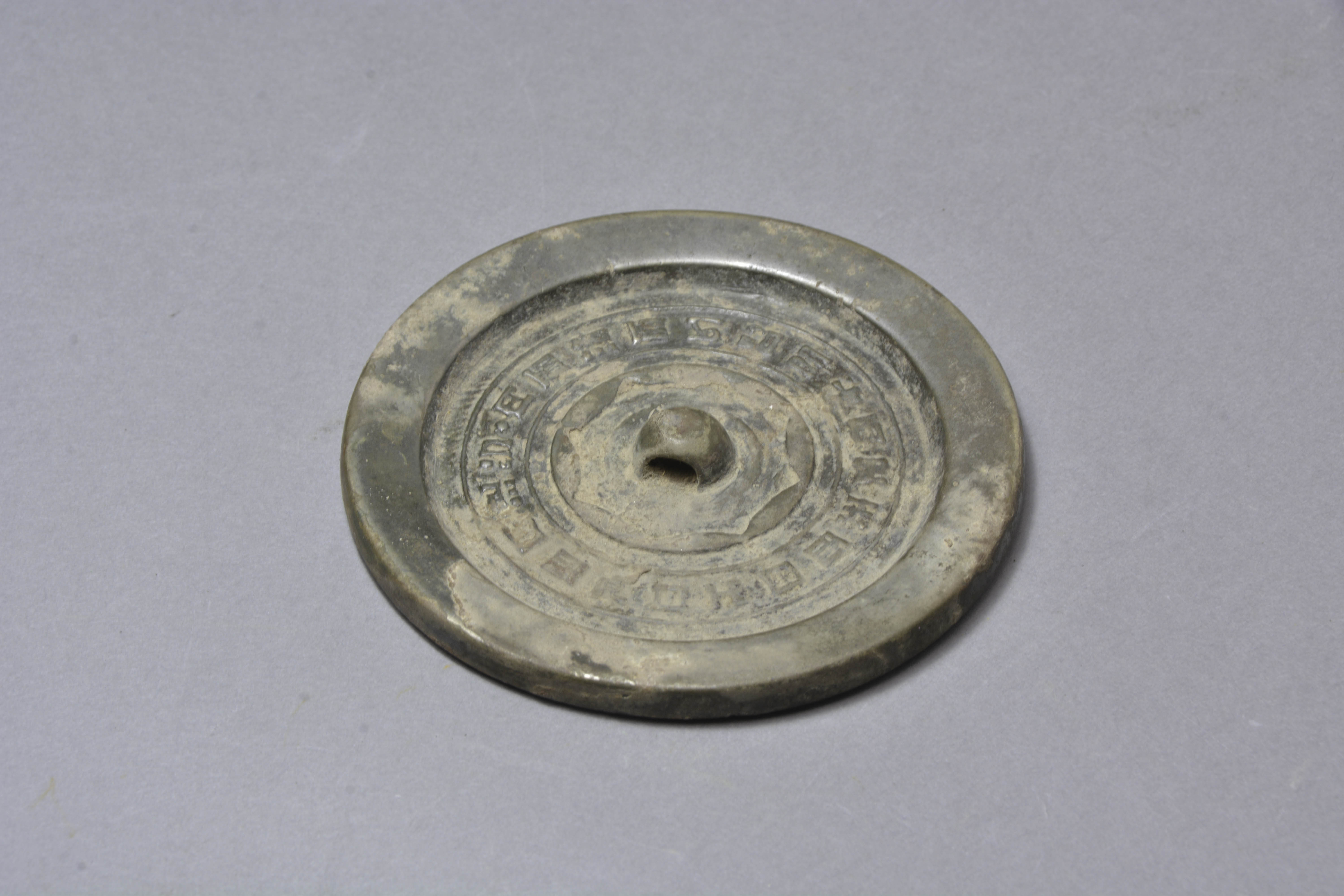 圆形,圆钮,圆钮座。座外以内向八连弧纹带,两周细弦纹间有铭文”内而清而以昭明光而象夬而日之月心而不 泄兮“,最外一周短斜线纹。素缘。面微凸。