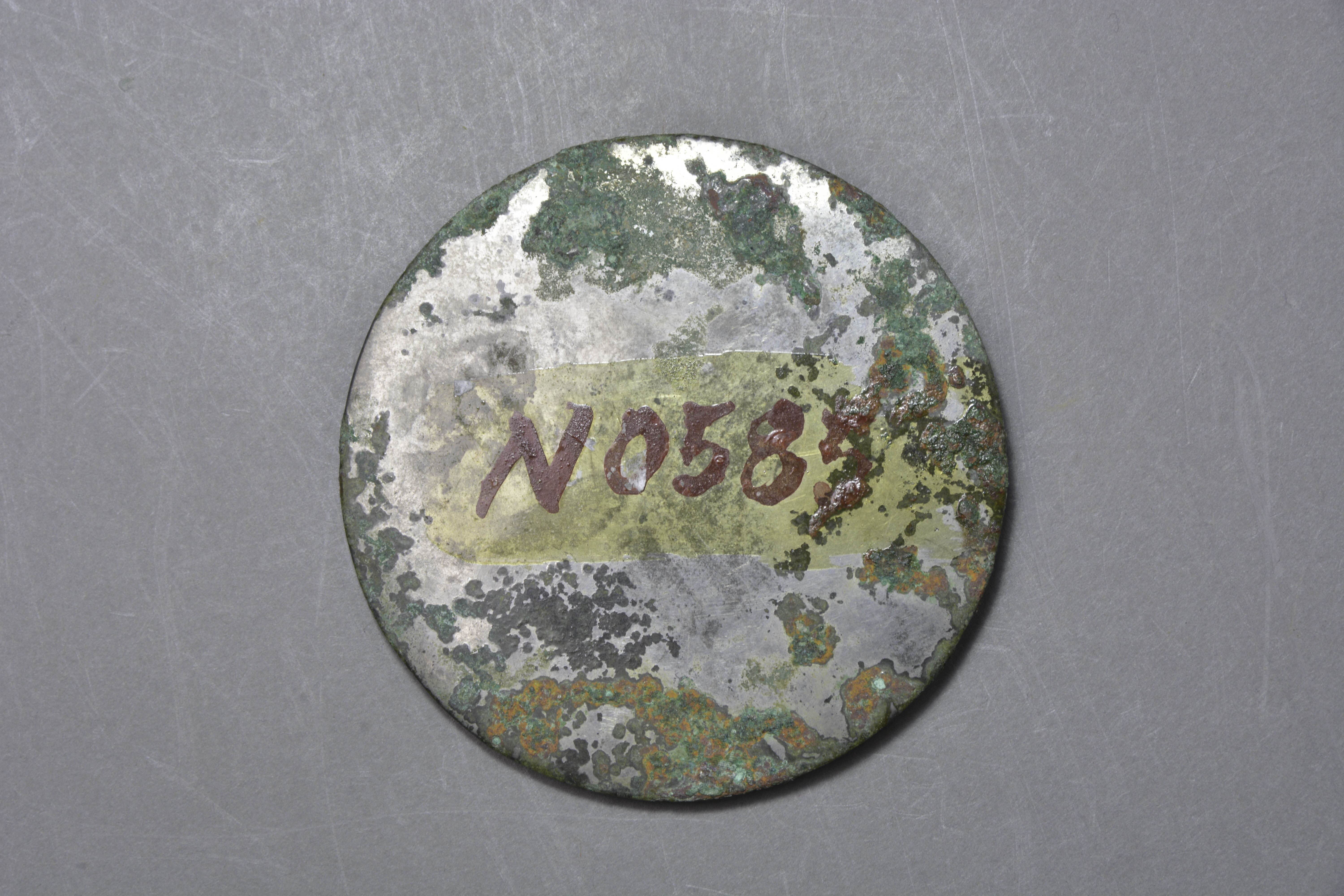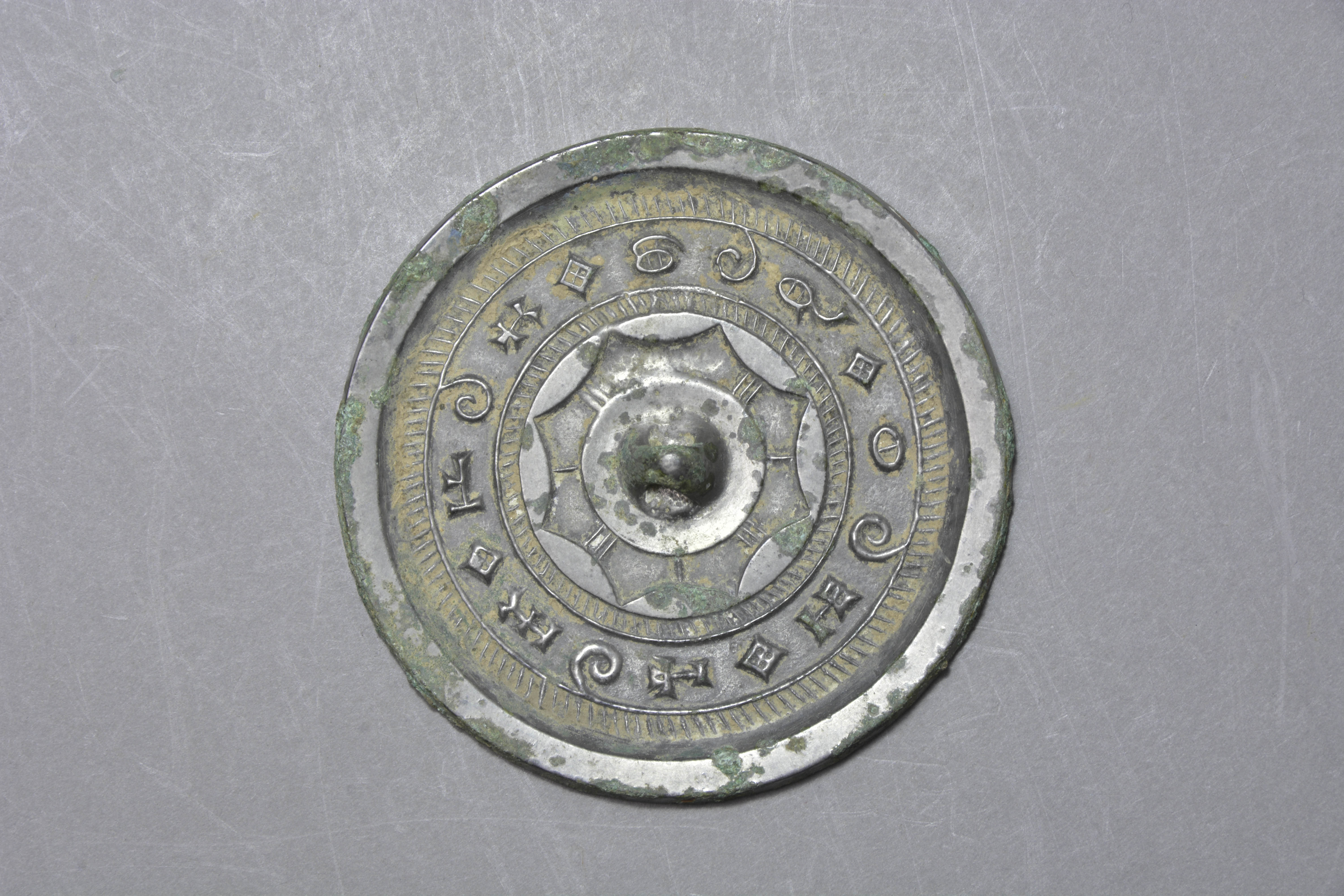 圆形,圆钮,圆钮座。座外为内向八连弧纹圈带,其外两周短斜线纹间篆书“间日之光,天下大明”八字铭文,字间填“ 田”和“e”符号,素窄缘。