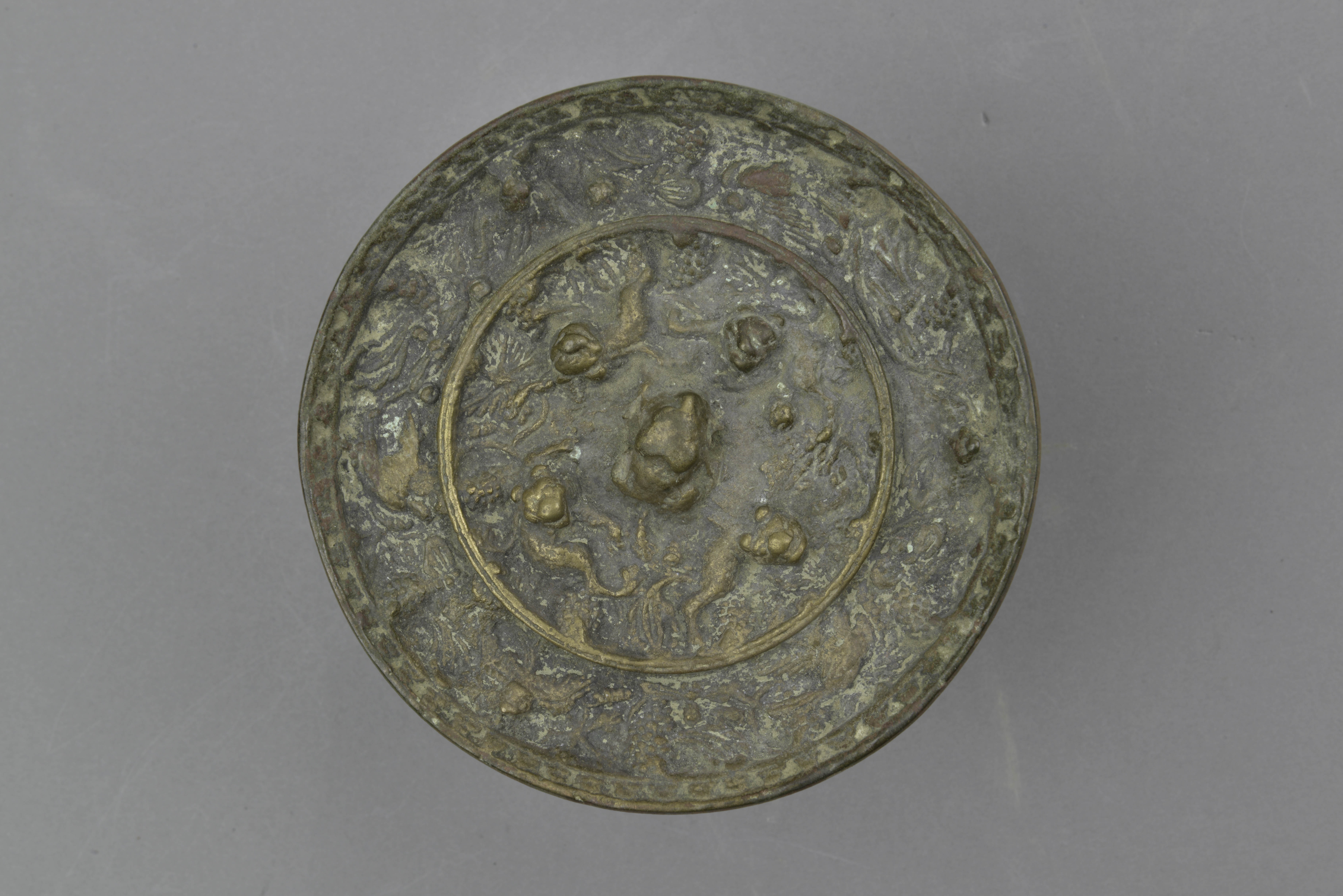 圆形,伏兽钮。一周凸棱纹将镜背分为两区。内区葡萄枝叶缠绕,四瑞兽或俯或仰,有的侧转身躯攀援旋绕于枝蔓丛中。外区葡萄串交错排列,不同形态的瑞兽禽鸟环绕其中。云花纹缘。